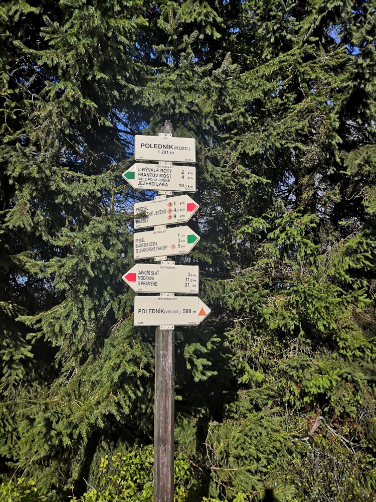 Je to nádherný vrchol s kruhovým výhledem. Hodně mě překvapilo, jak je to tu pěkný. Chvíli se kochám, ale pak už svižně vyrážím dále. Musím pospíchat. Slíbil jsem, že budu kolem oběda doma a chci ještě vyběhnout na Poledník. Je to na něj cca 10 km. Klesám po zpevněné cestě na žlutou turistickou značku.