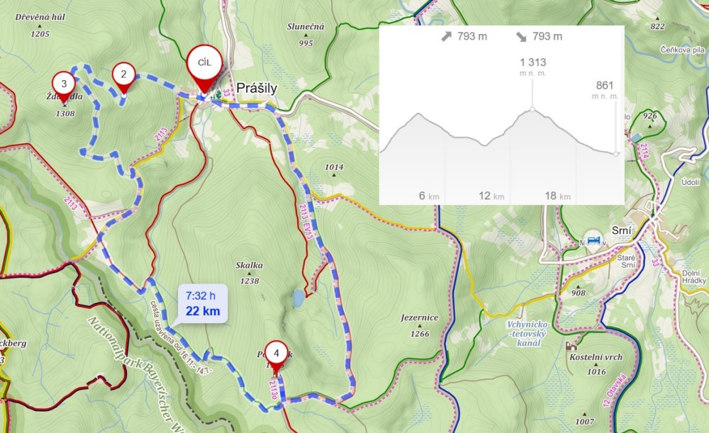 Klesám dolů po červené cestou nazvanou Liščí díra. Chvílema běžím, chvílema jdu. V Prášilech jsem kolem půl dvanácté. Bylo to hodně výživné. Sedám do auta, po jedné jsem doma a mohu se věnovat rodince :-).