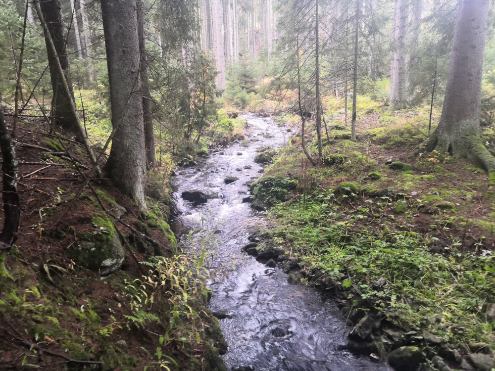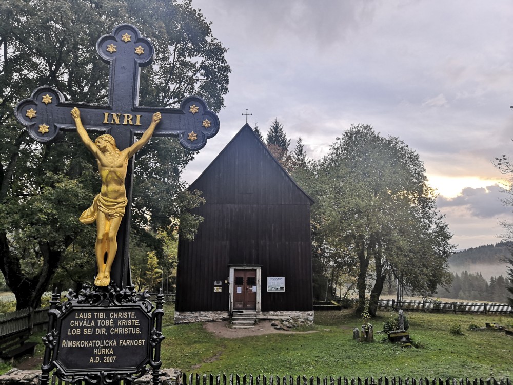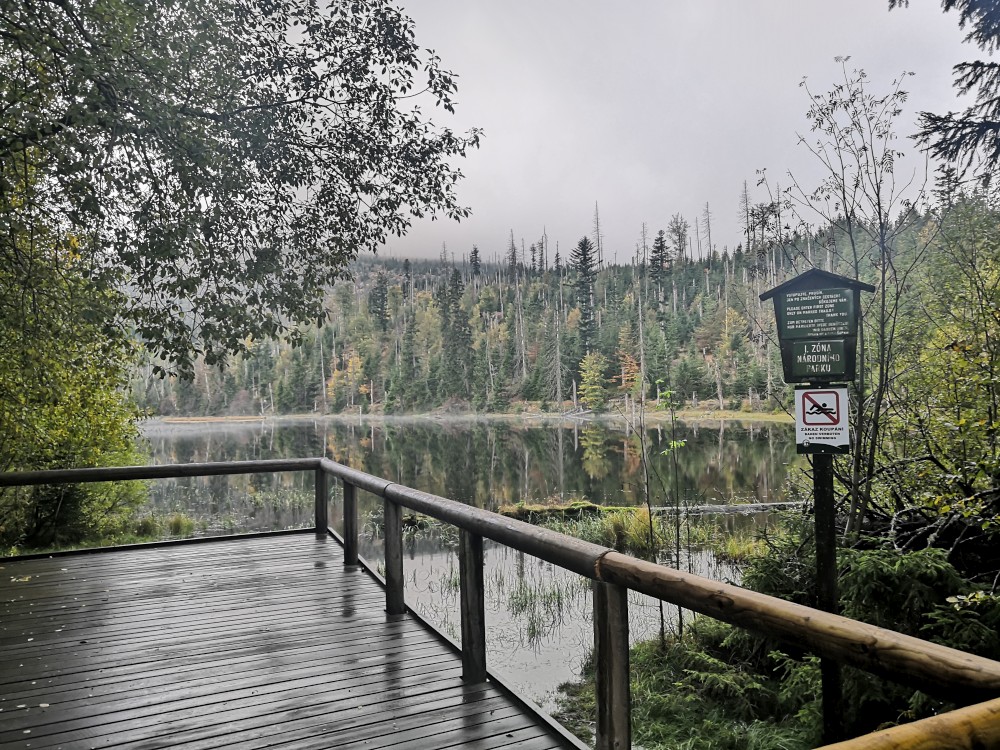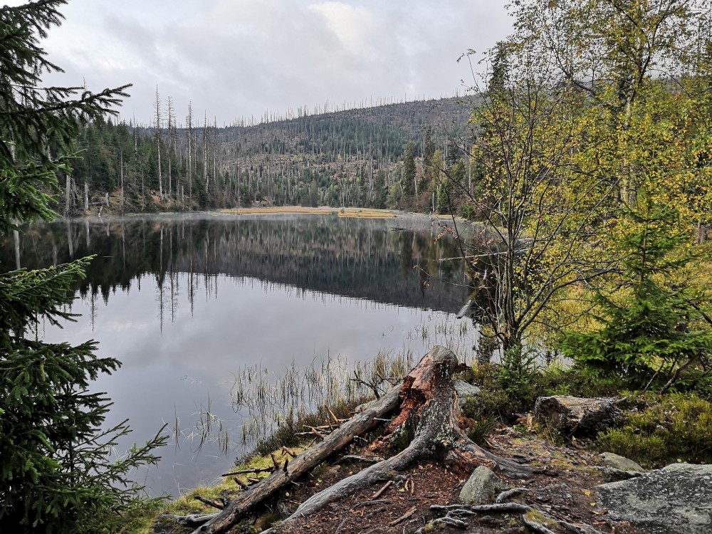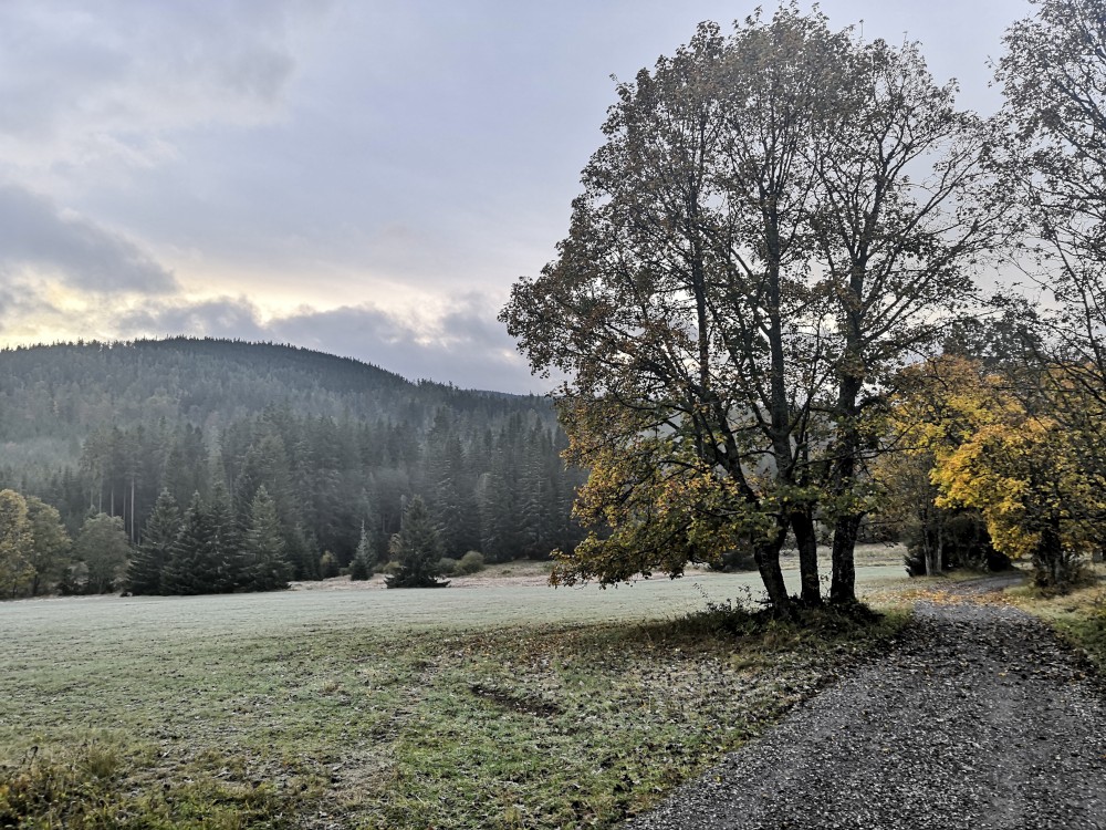 Jedu na dopolední výšlap na Šumavu. Vstávám před pátou hodinou. Kolem sedmé ráno nechávám auto na parkovišti v Nové Hůrce a začínám stoupat k jezeru Laka. Zastavuji se v bývalé osadě Stará Hůrka. Jsou zde kamenné základy kostela.