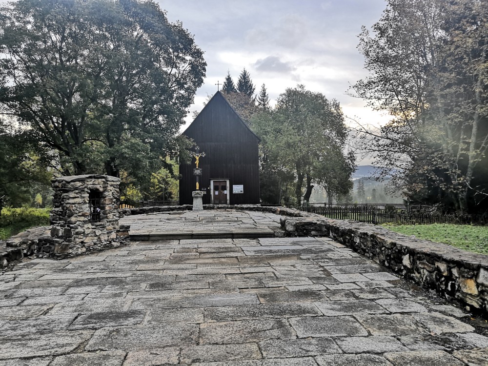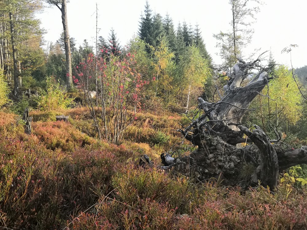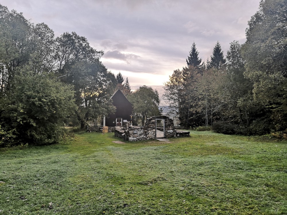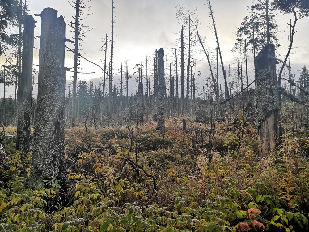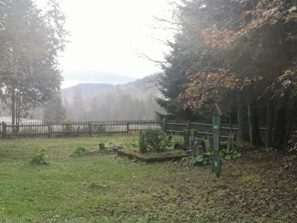 Jedu na dopolední výšlap na Šumavu. Vstávám před pátou hodinou. Kolem sedmé ráno nechávám auto na parkovišti v Nové Hůrce a začínám stoupat k jezeru Laka. Zastavuji se v bývalé osadě Stará Hůrka. Jsou zde kamenné základy kostela.