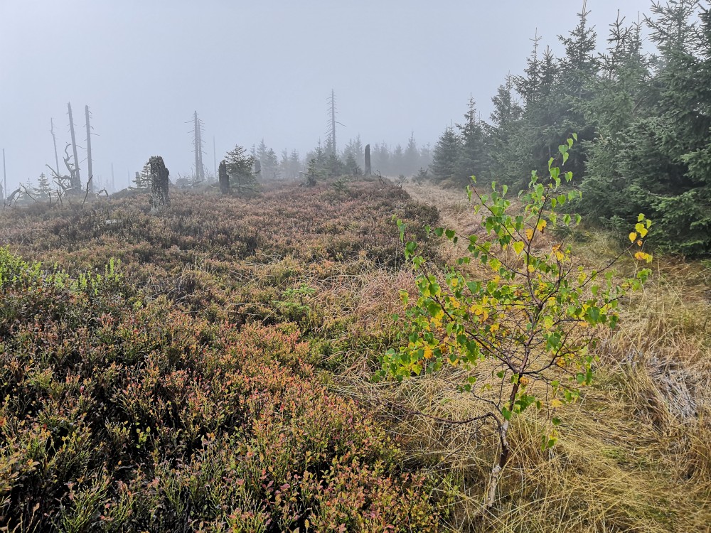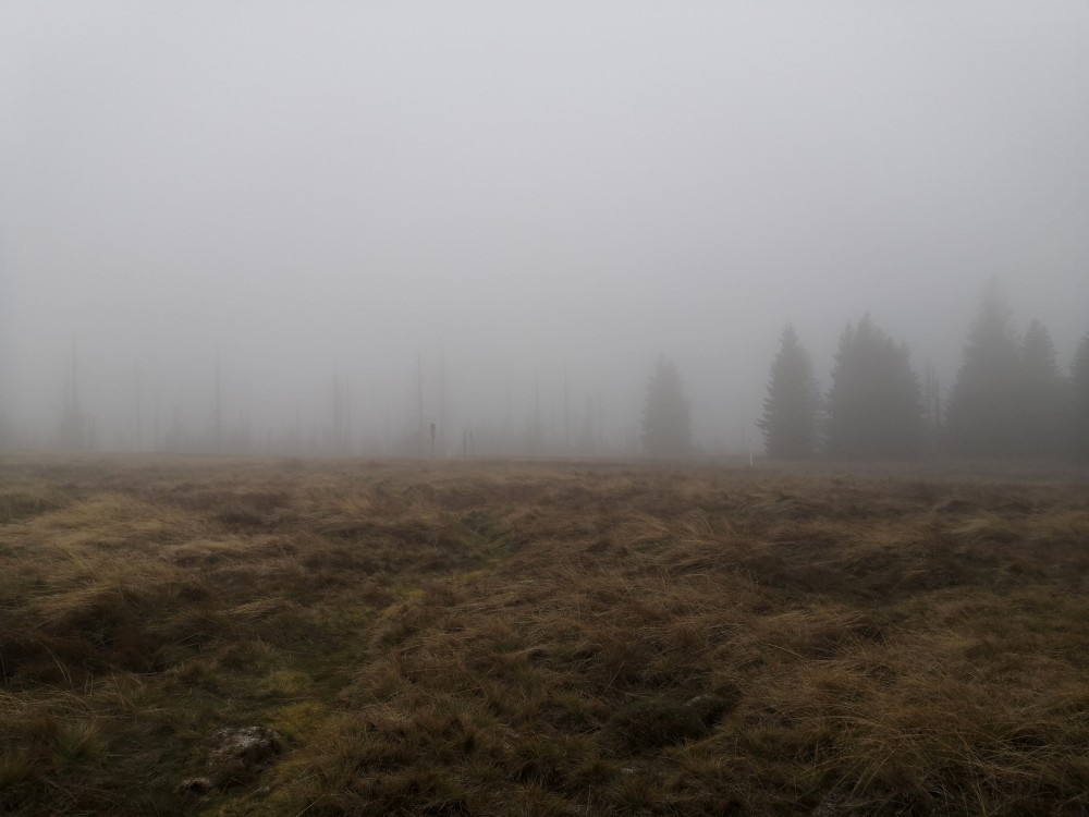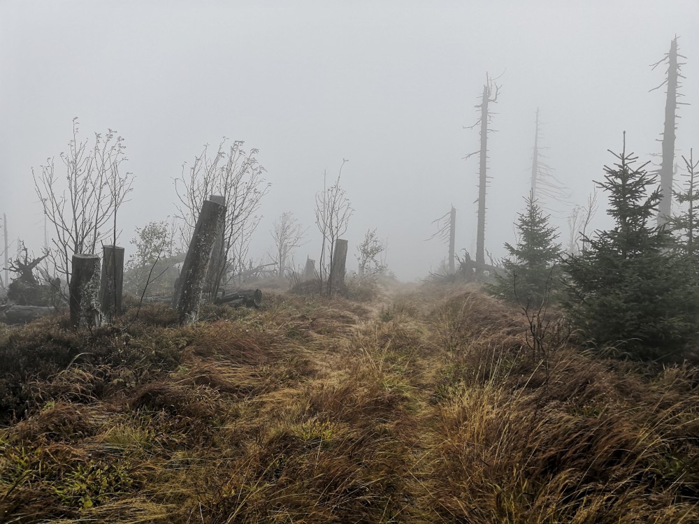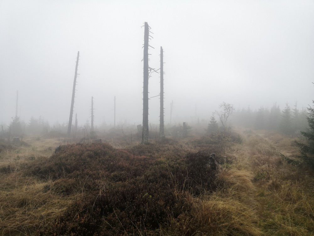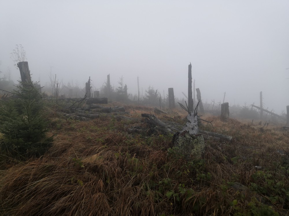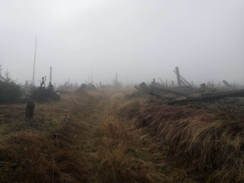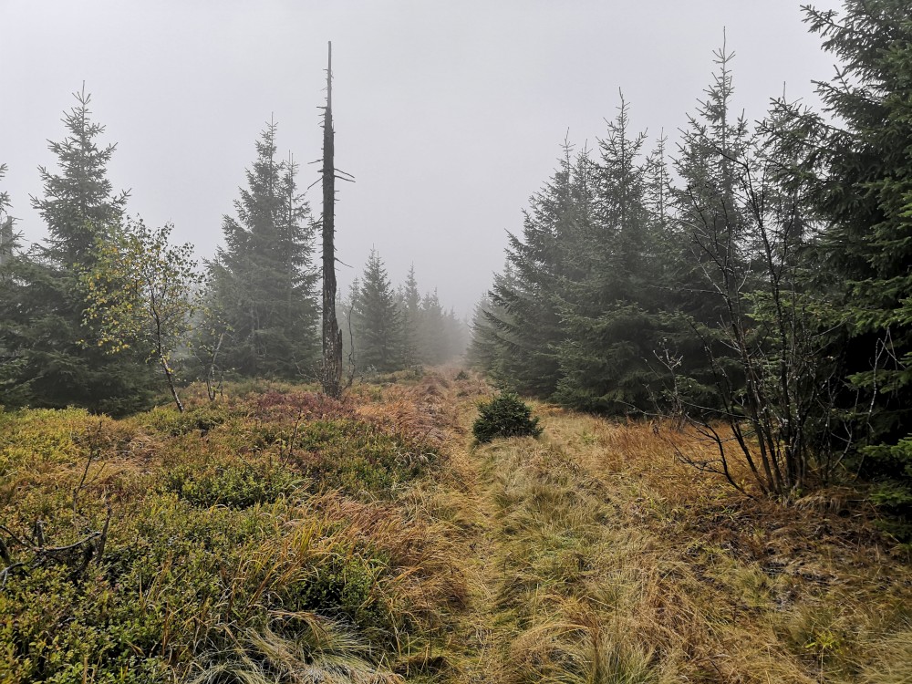 Jdu hodně svižně. U jezera Laka jsem kolem osmé. Dlouho se zde nezdržím a začínám stoupat červenou polomskou cestou. Těsně přes rozcestím Pod Polomem odbočuji doleva a stoupám až na Plesnou. Stoupání je poměrně ostré, naopak nahoře je v podstatě rovinka. Plesná je hora s plochým vrcholem. Nahoře jsem kolem deváte. Jdu se podívat ještě na německou stranu. Je velká mlha, není skoro nic vidět, začínám tedy klesat stejnou cestou dolů.