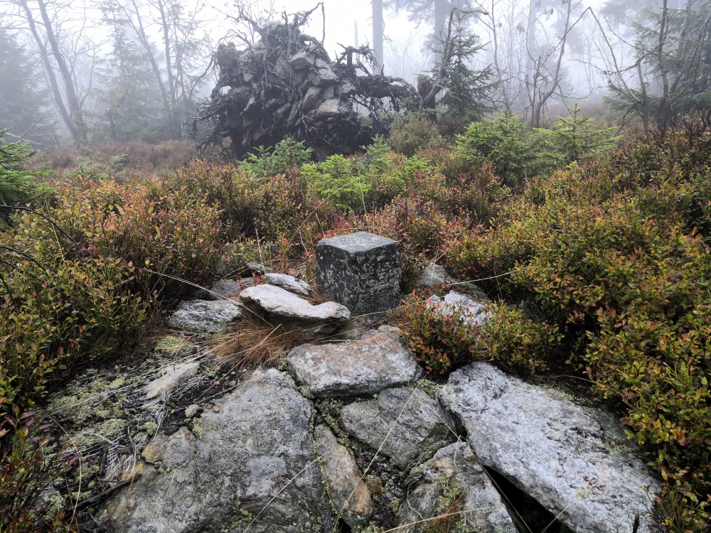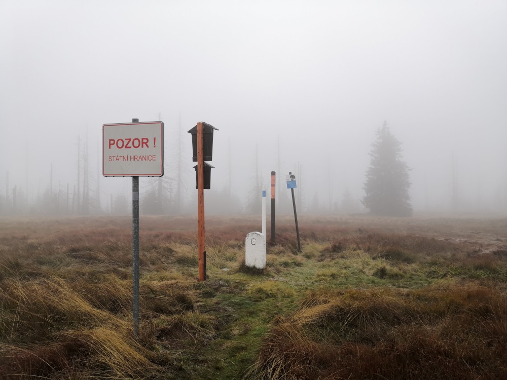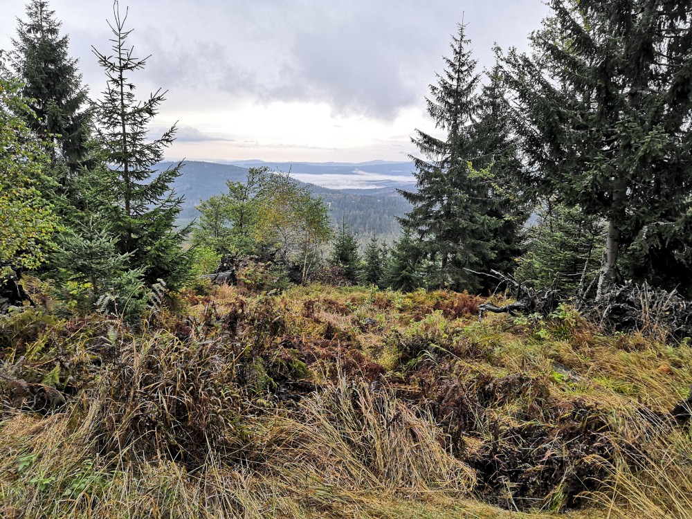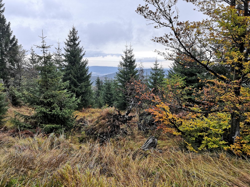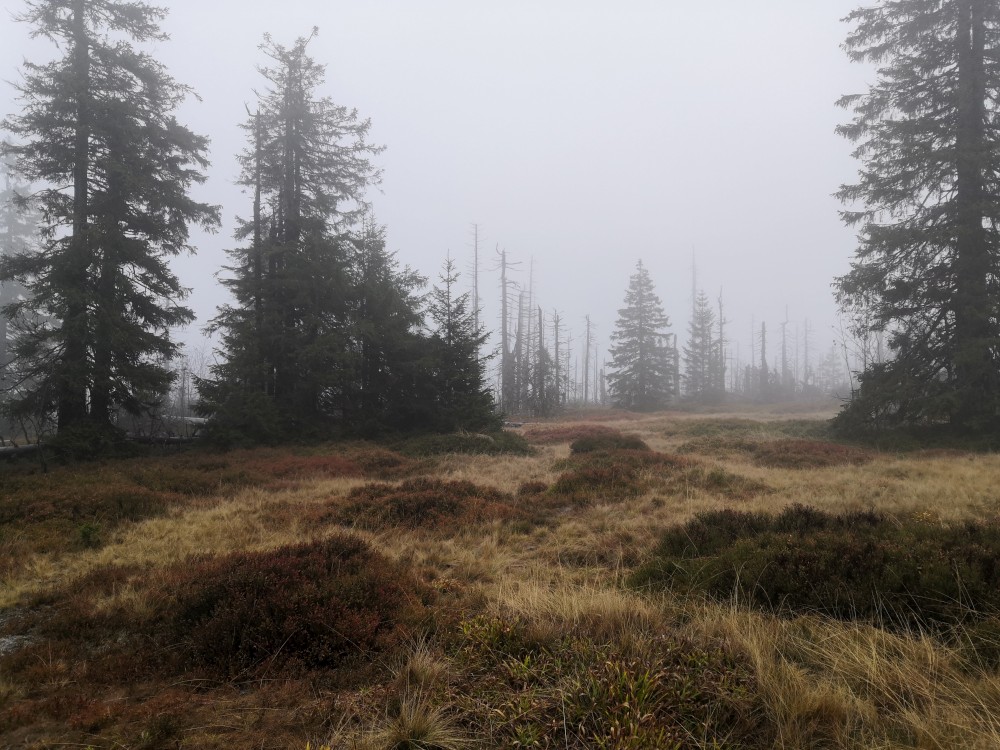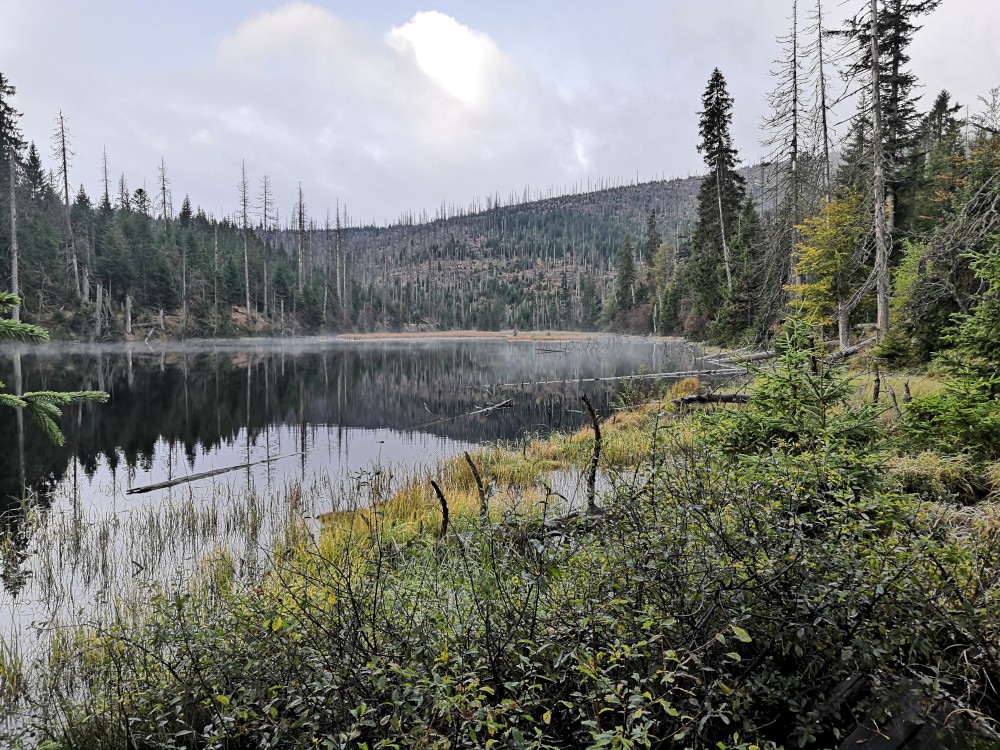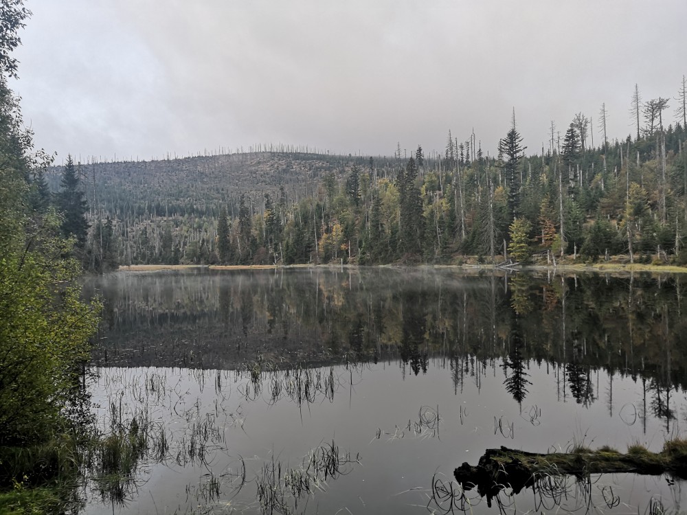 Jdu hodně svižně. U jezera Laka jsem kolem osmé. Dlouho se zde nezdržím a začínám stoupat červenou polomskou cestou. Těsně přes rozcestím Pod Polomem odbočuji doleva a stoupám až na Plesnou. Stoupání je poměrně ostré, naopak nahoře je v podstatě rovinka. Plesná je hora s plochým vrcholem. Nahoře jsem kolem deváte. Jdu se podívat ještě na německou stranu. Je velká mlha, není skoro nic vidět, začínám tedy klesat stejnou cestou dolů.