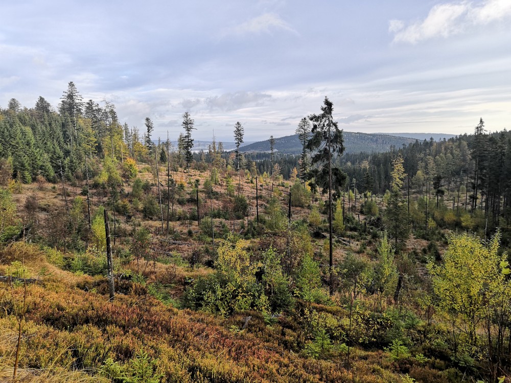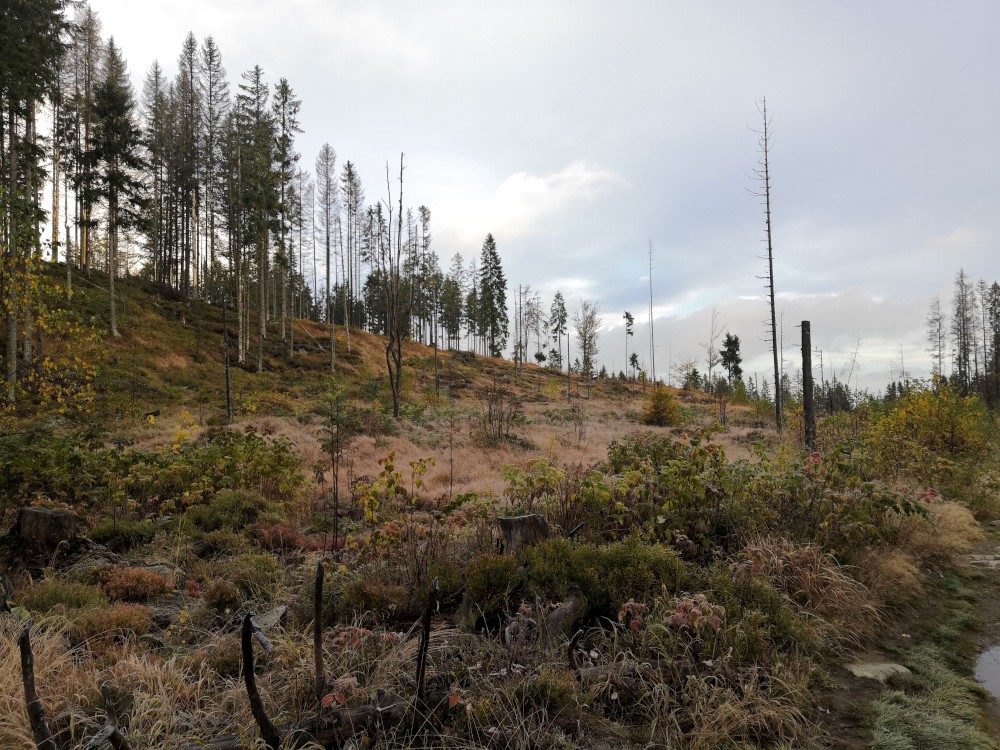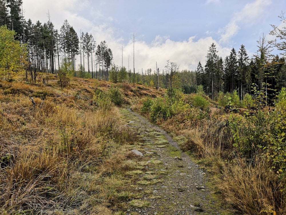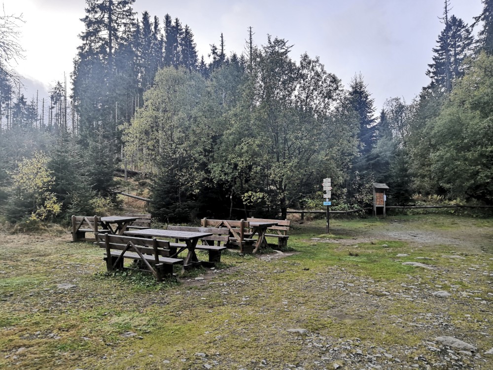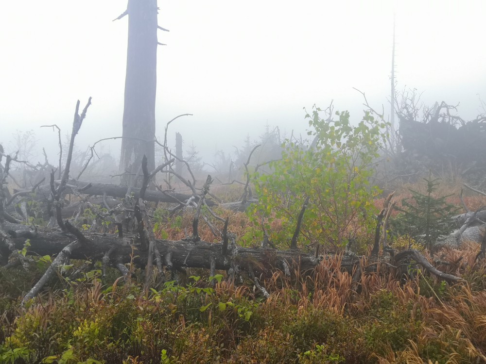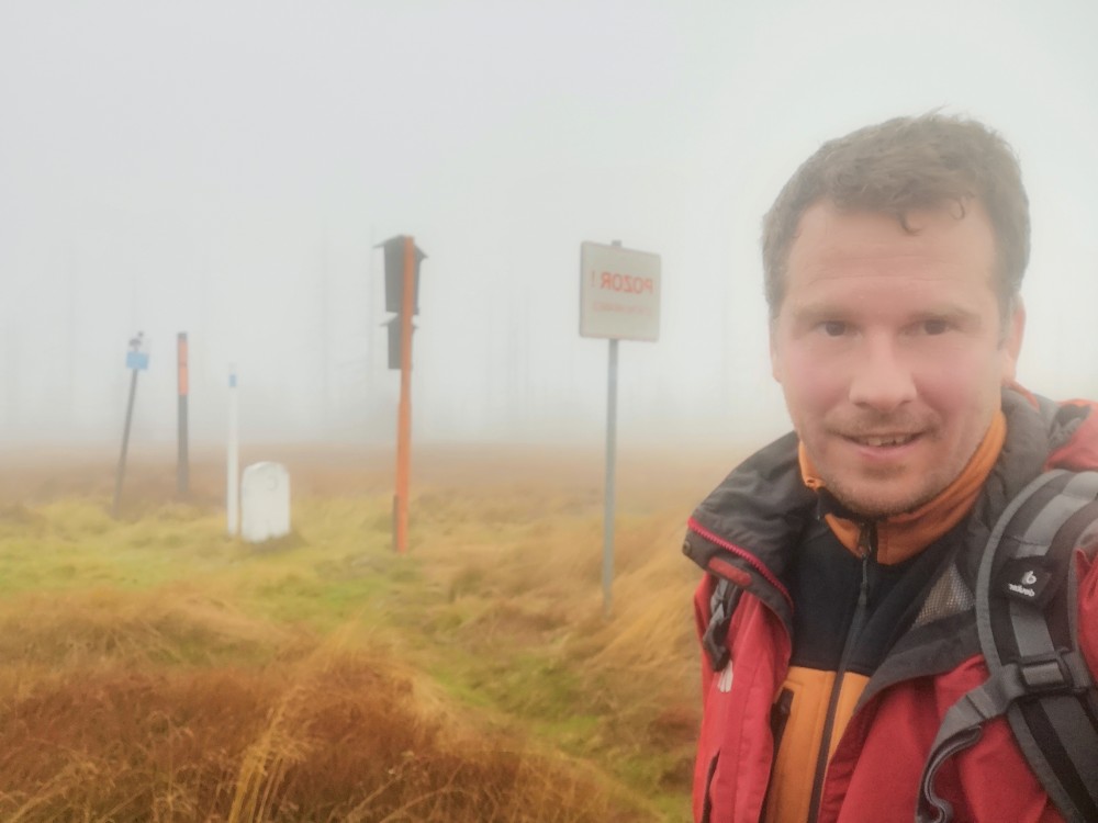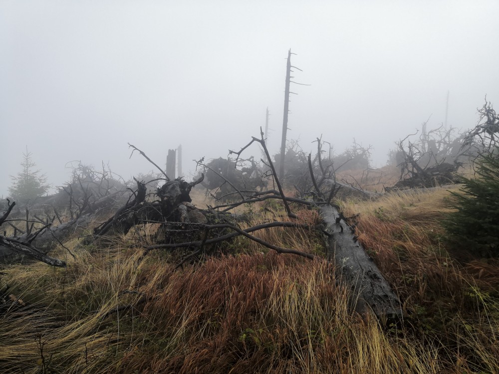 Jdu hodně svižně. U jezera Laka jsem kolem osmé. Dlouho se zde nezdržím a začínám stoupat červenou polomskou cestou. Těsně přes rozcestím Pod Polomem odbočuji doleva a stoupám až na Plesnou. Stoupání je poměrně ostré, naopak nahoře je v podstatě rovinka. Plesná je hora s plochým vrcholem. Nahoře jsem kolem deváte. Jdu se podívat ještě na německou stranu. Je velká mlha, není skoro nic vidět, začínám tedy klesat stejnou cestou dolů.