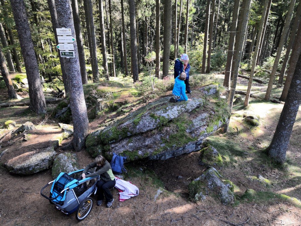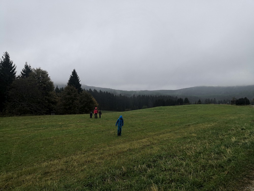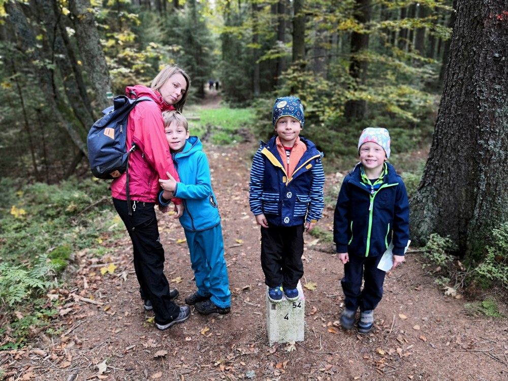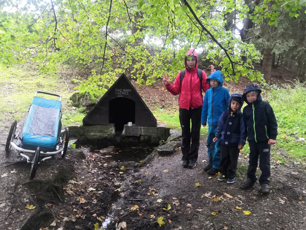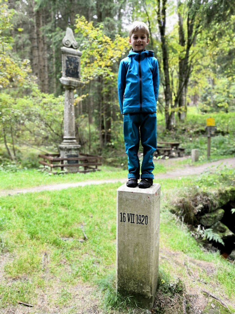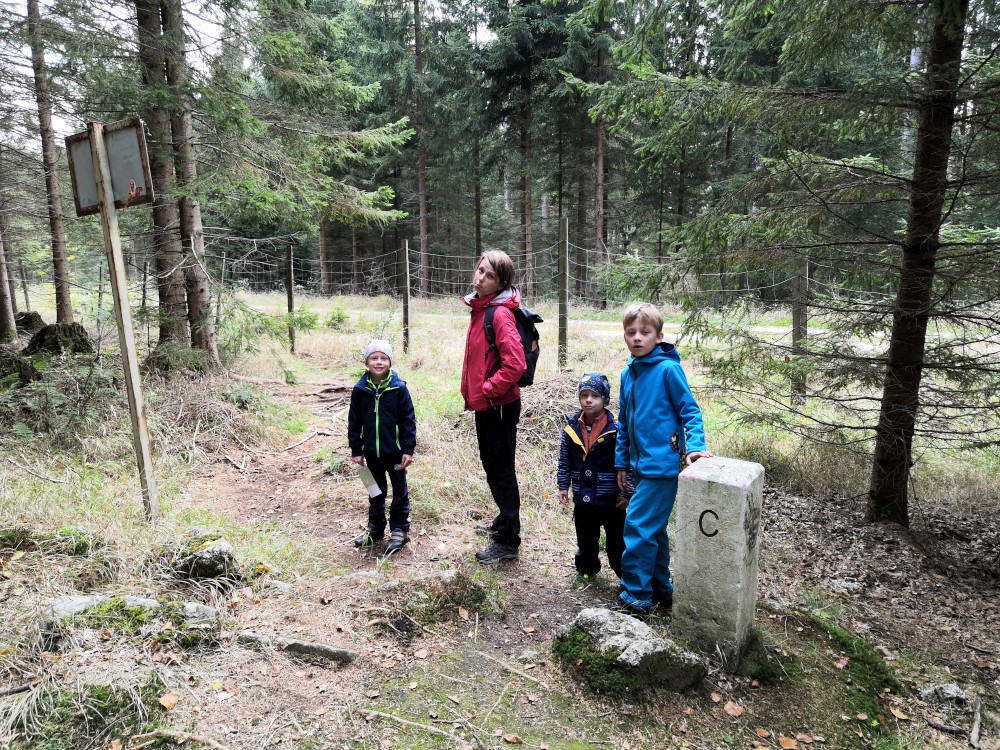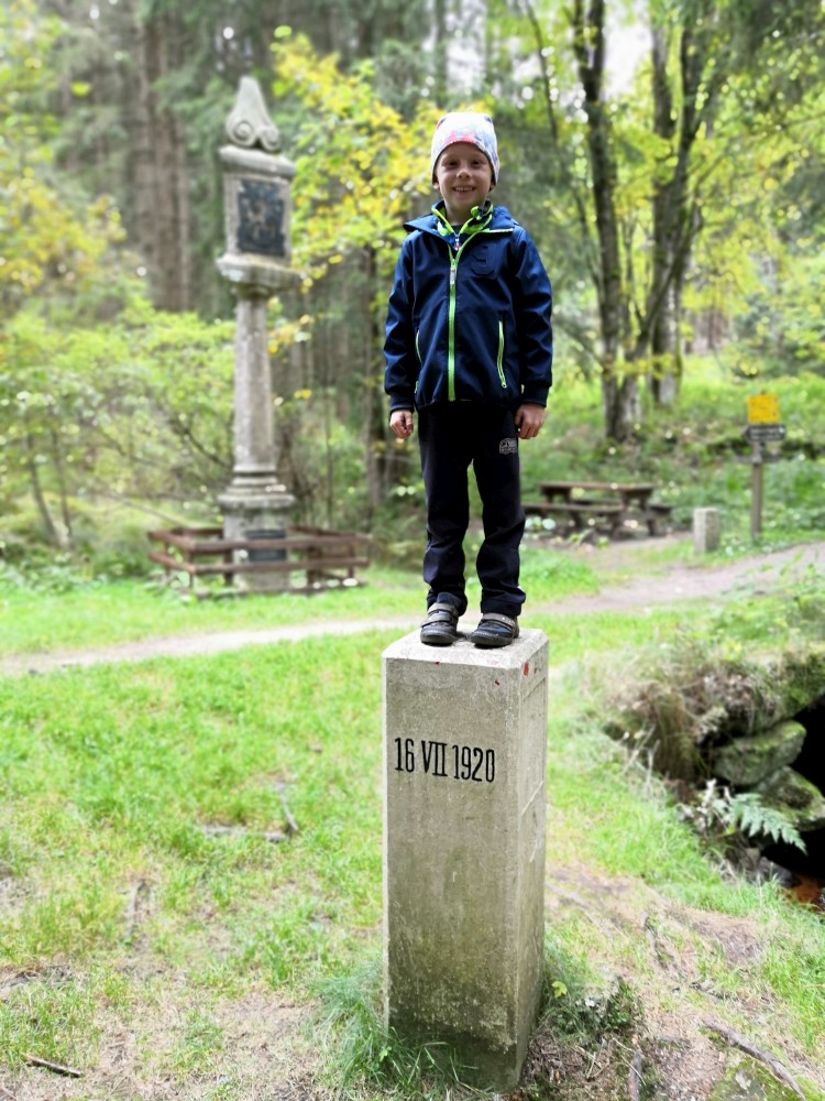 Dále zastavujeme u trojmezného kamene. Kluci na něj musí vylézt. Je tu také studánka. Další pauzu děláme u turistického přístřešku kousek u jezírka Weissensee. Začíná pršet. Jdeme dále po hranici až k českému prameni Lužnice. Dlouho se nezdržíme, klukům už je zima. Do Pohoří na Šumavě k autu už to máme kousek. Nasedáme a jedeme domů.