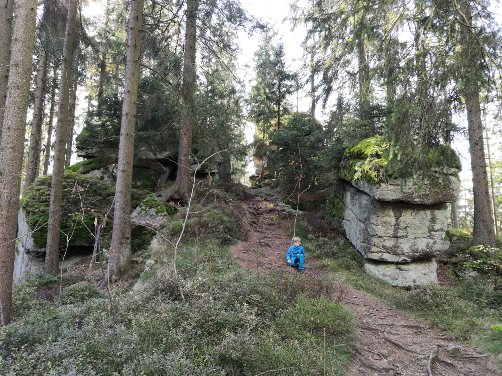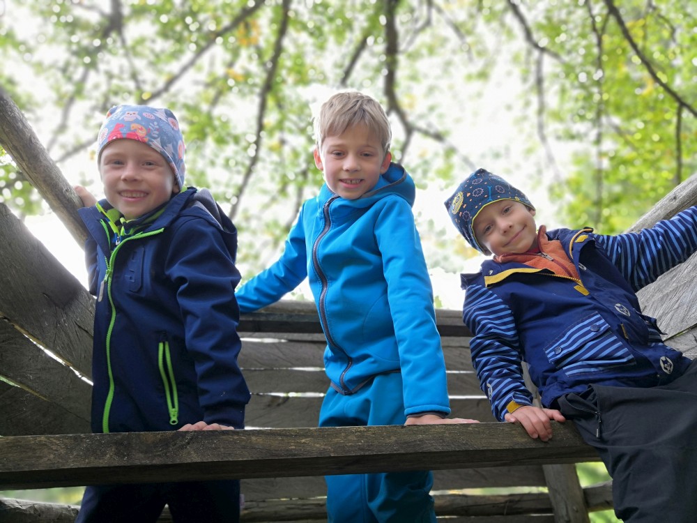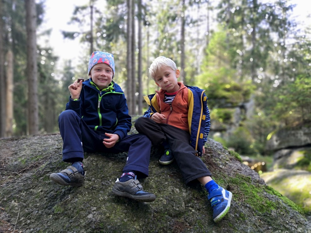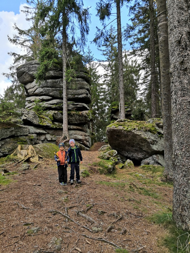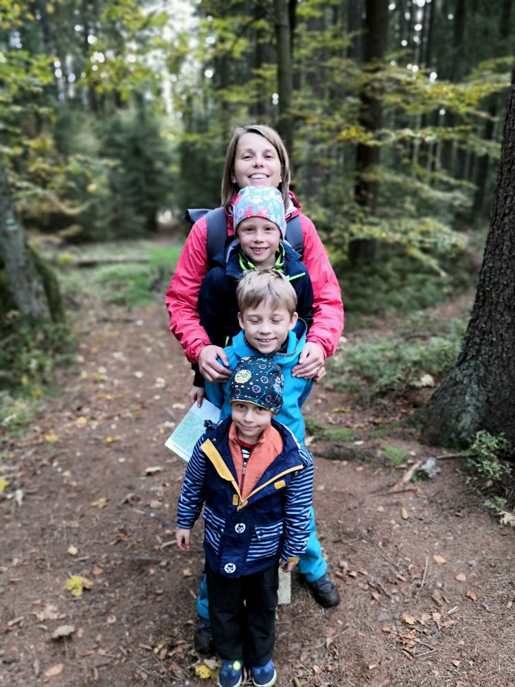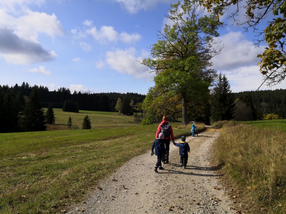 Dále zastavujeme u trojmezného kamene. Kluci na něj musí vylézt. Je tu také studánka. Další pauzu děláme u turistického přístřešku kousek u jezírka Weissensee. Začíná pršet. Jdeme dále po hranici až k českému prameni Lužnice. Dlouho se nezdržíme, klukům už je zima. Do Pohoří na Šumavě k autu už to máme kousek. Nasedáme a jedeme domů.
