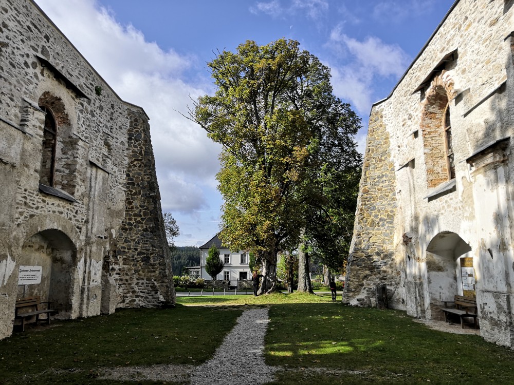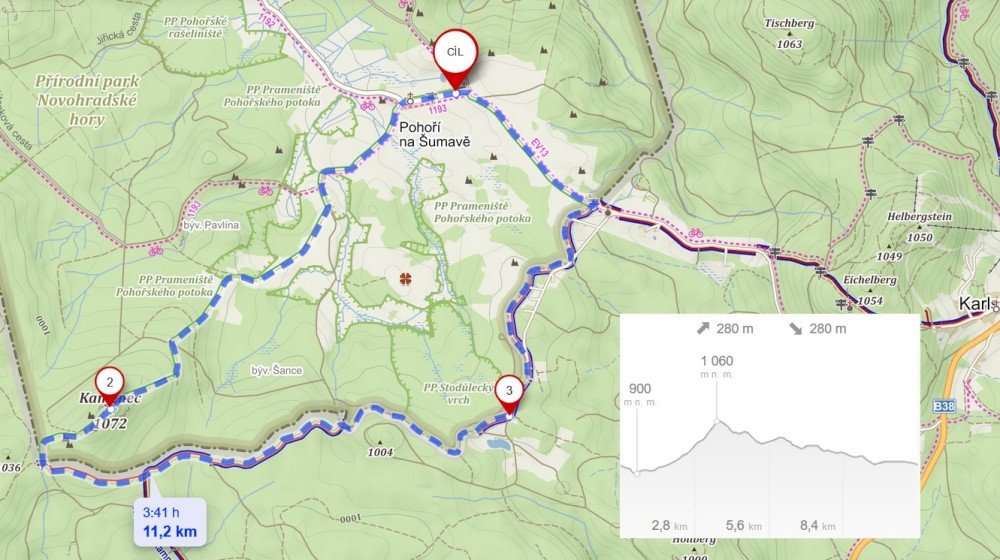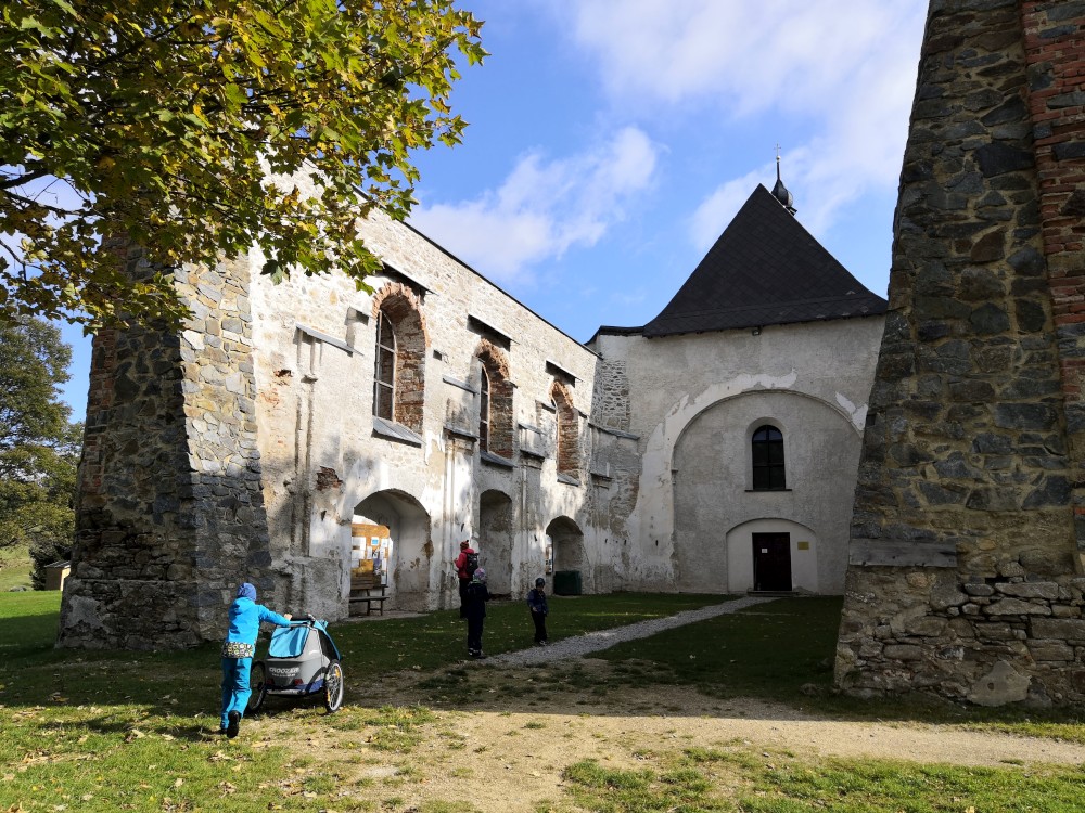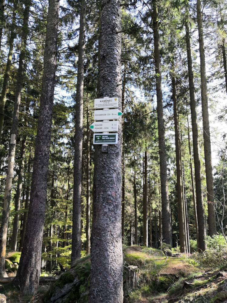 Jedeme do Novohradských hor. Auto necháváme v Pohoří na Šumavě. Prohlížíme si místní zřícený kostel. Pak jdeme po zelené na vrch Kamenec. Zastavujeme u pohořského zeravu. V 5ti se nám ho daří obejmou dokola. Na vrcholku Kamence dáváme svačinku a pokračujeme na hranice s Rakouskem.