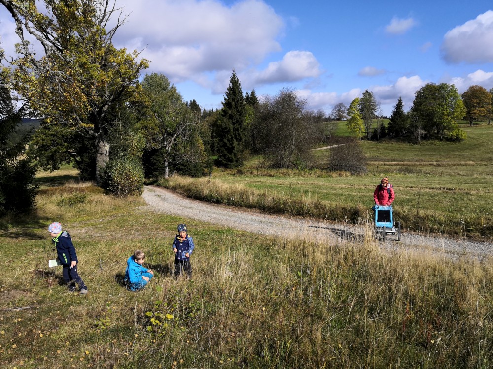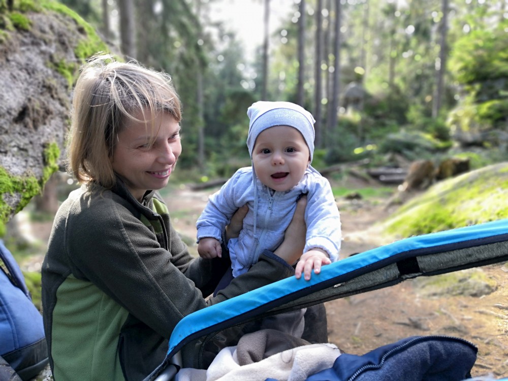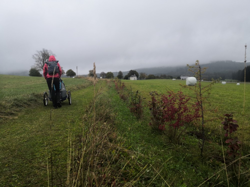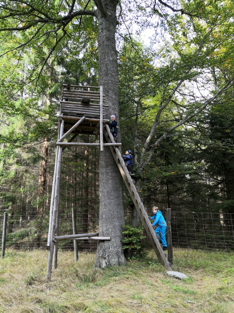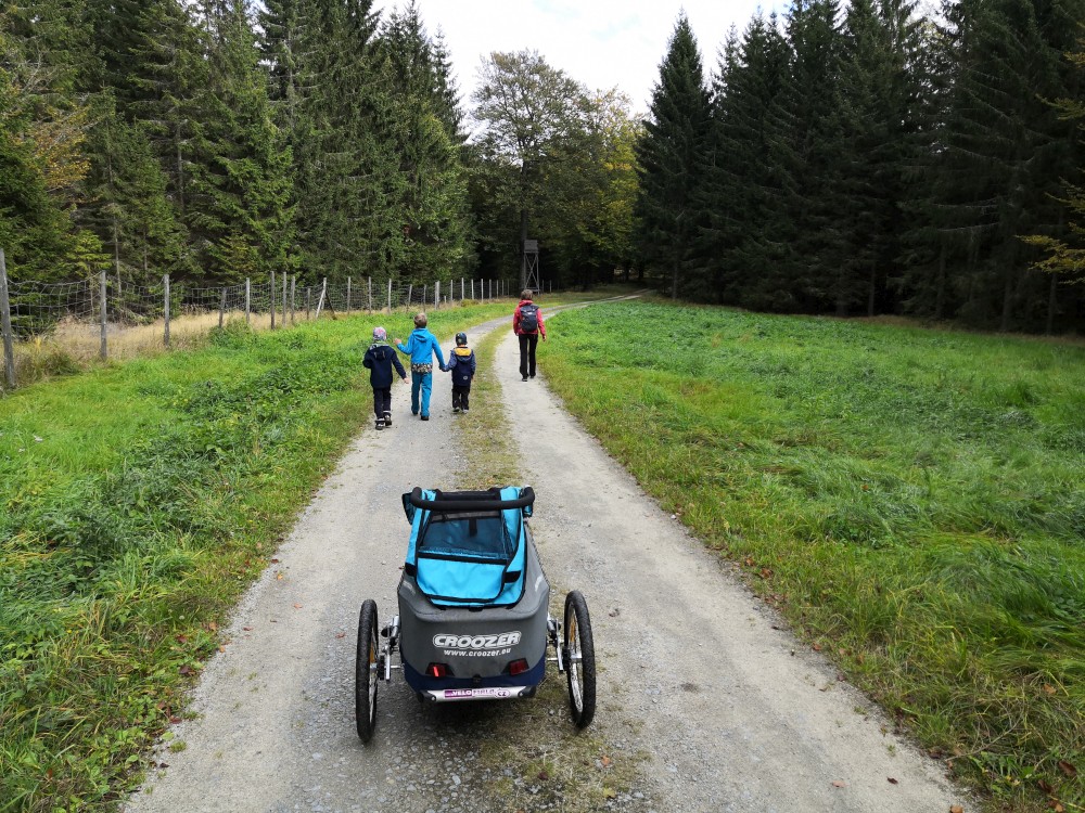 Jdeme po červené značce po Nordwaldkammweg podél hranic. Je to cesta jen pro pěší. Dvakrát se musíme dostat přes plot. Pěší projde, vozík neprojede. Musíme tedy Bětušku vyndat, složit vozík, projít a pak ho zase složit. Zastavujeme u vysokého posedu. Kluci lezou nahoru.