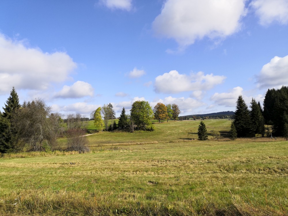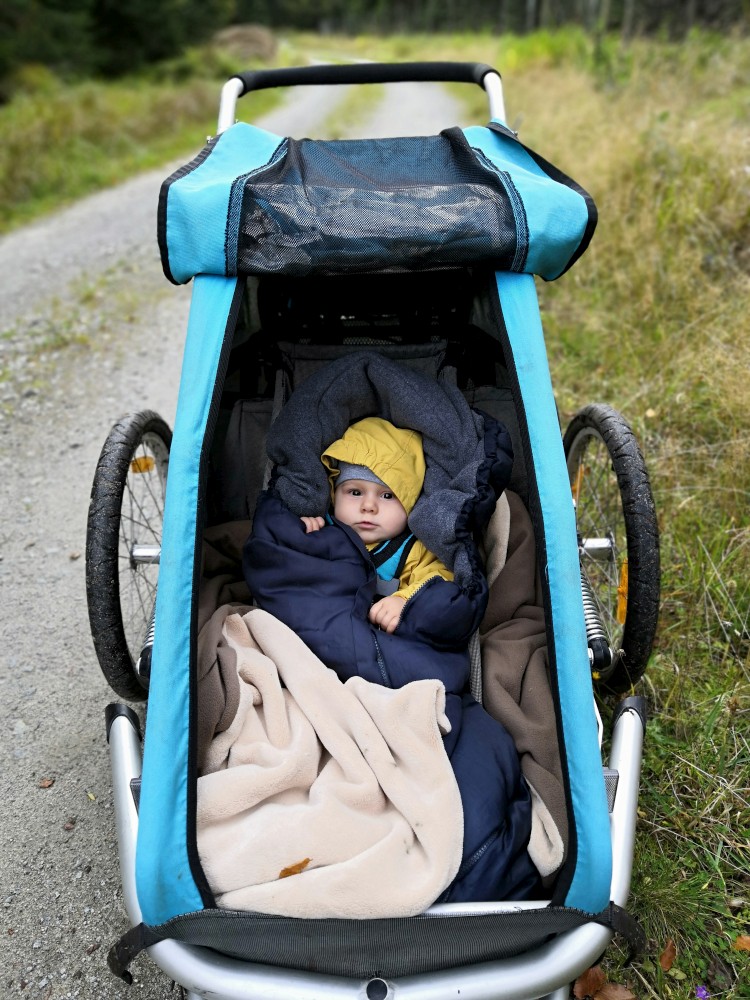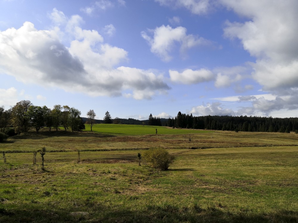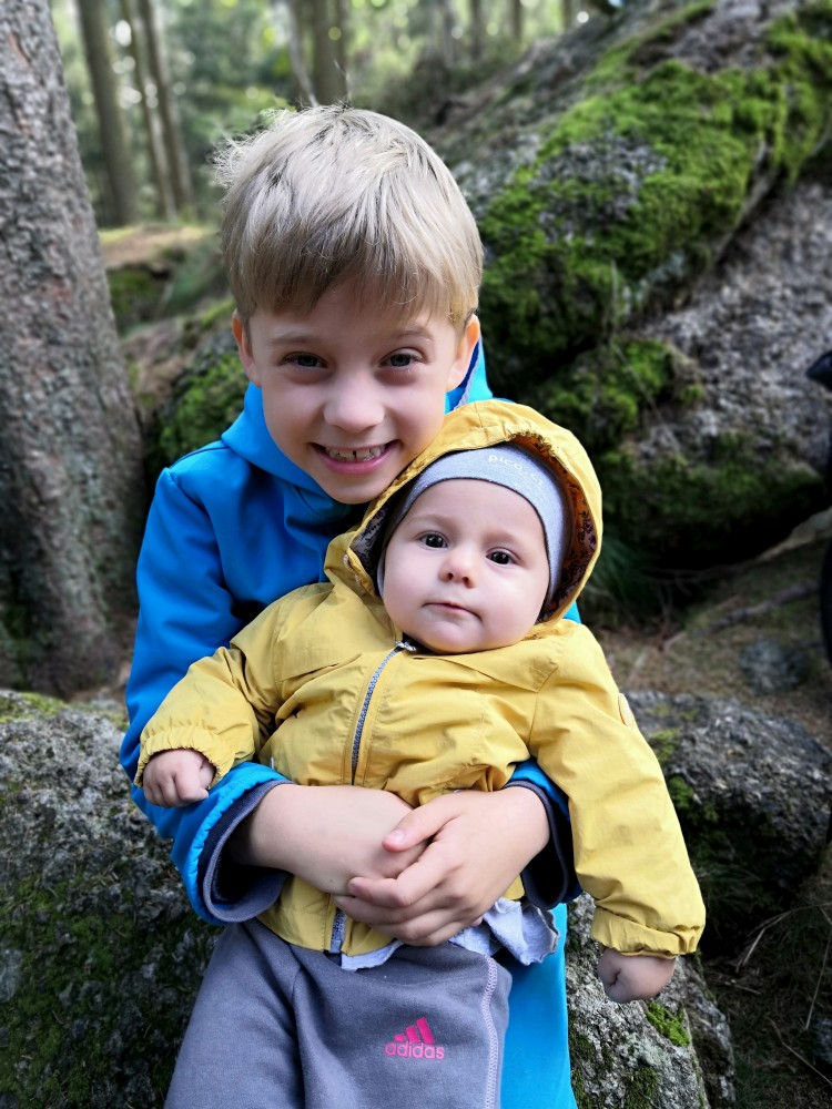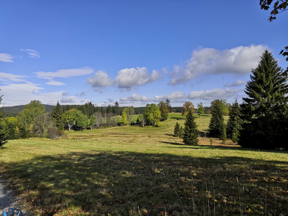 Jdeme po červené značce po Nordwaldkammweg podél hranic. Je to cesta jen pro pěší. Dvakrát se musíme dostat přes plot. Pěší projde, vozík neprojede. Musíme tedy Bětušku vyndat, složit vozík, projít a pak ho zase složit. Zastavujeme u vysokého posedu. Kluci lezou nahoru.