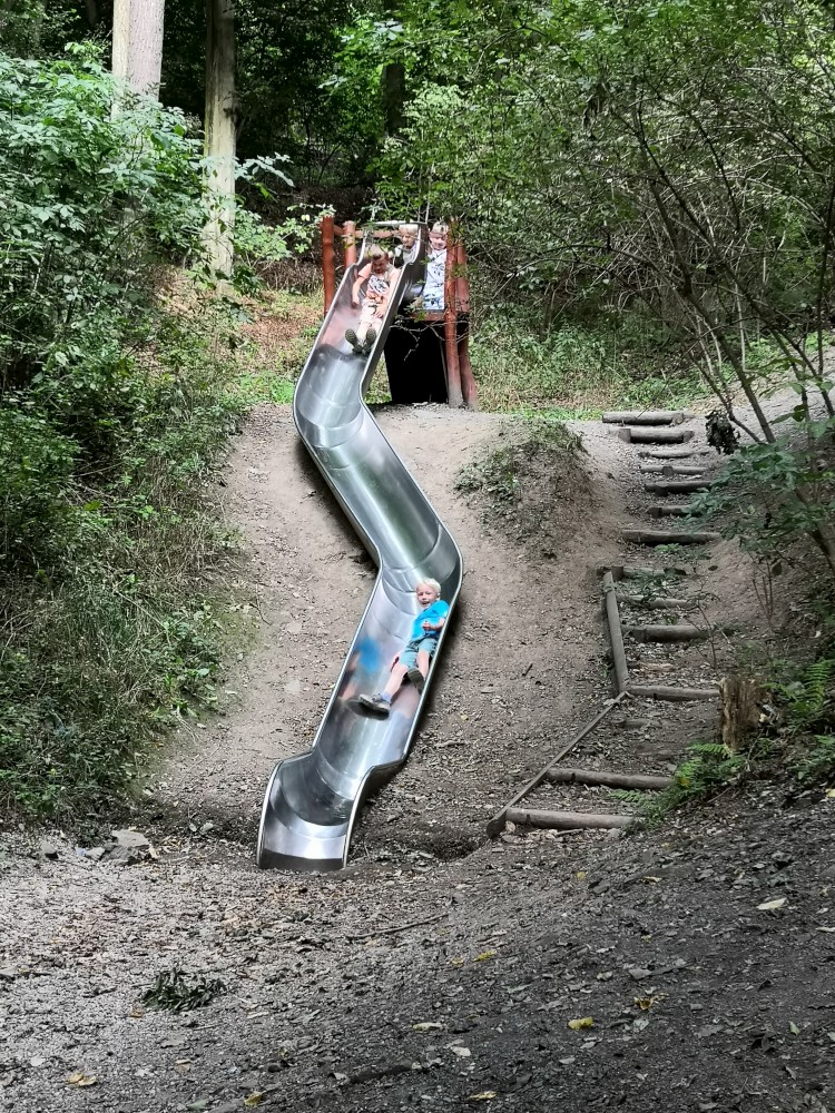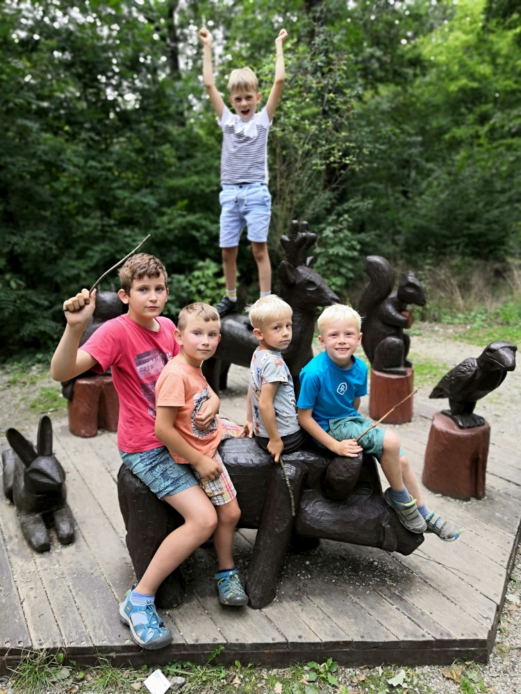 Po návštěvě hradu po červené do rekreačně naučného areálu Křivoklát. Jsou zde různé prolézačky, klouzačky a také dendrologická naučná stezka. Děláme zde poměrně dlouhý okruh - trochu jsme se ztratili :-). Blíží se velký slejvák, takže po modré stezce hodně spěcháme k autům.