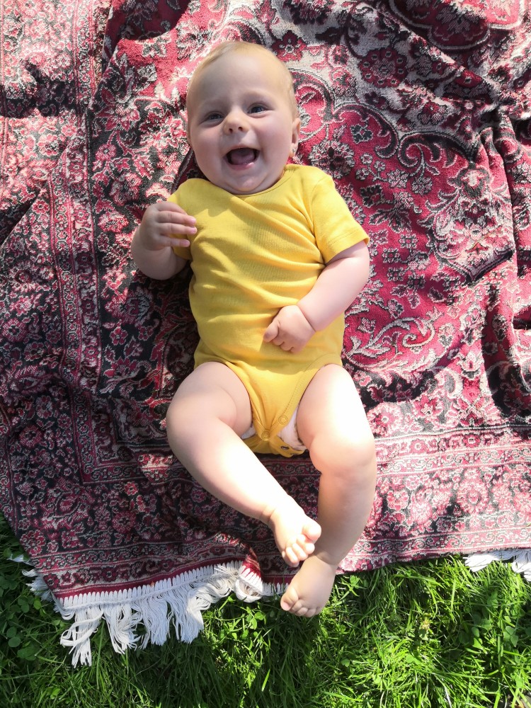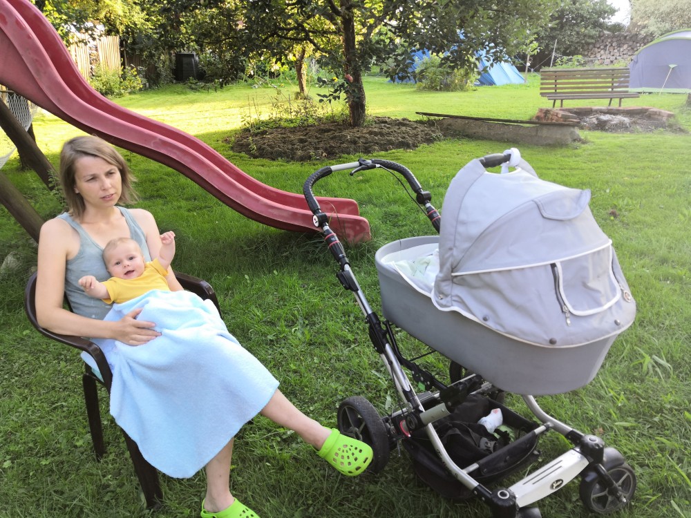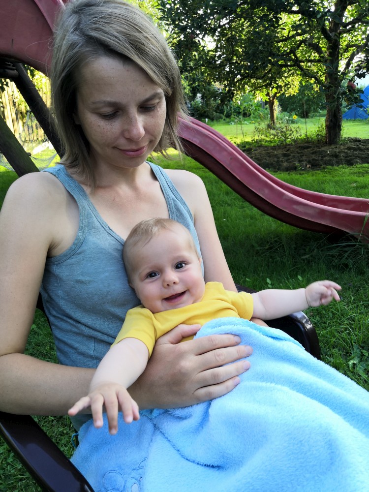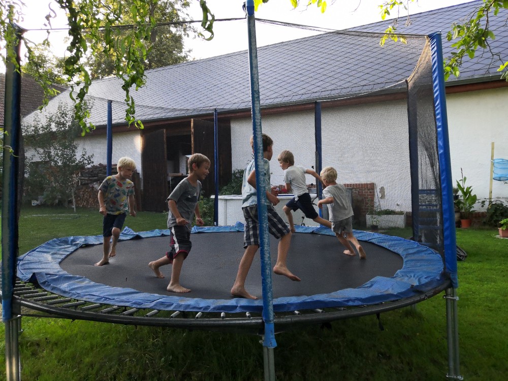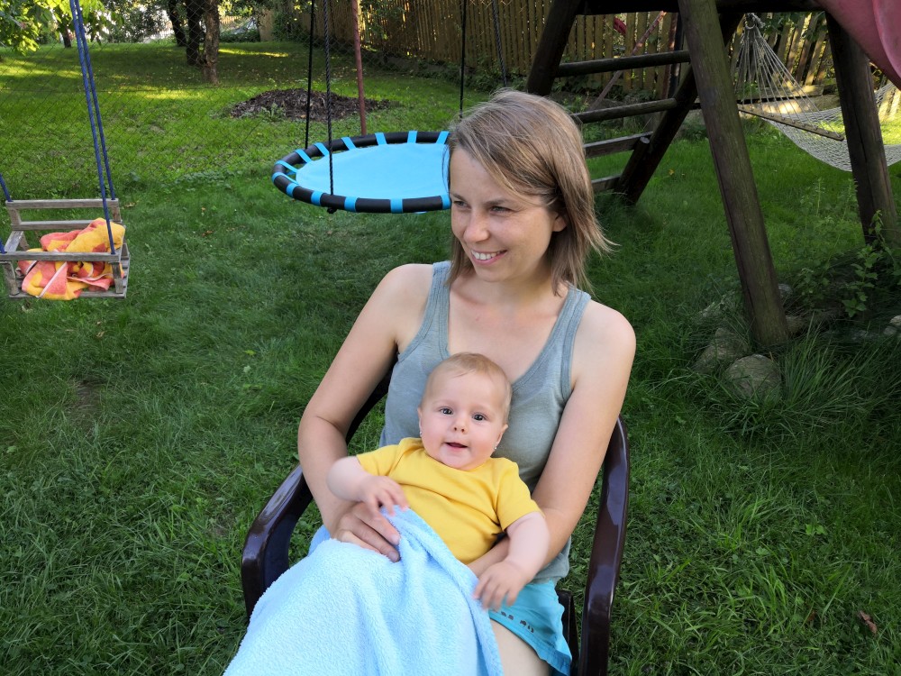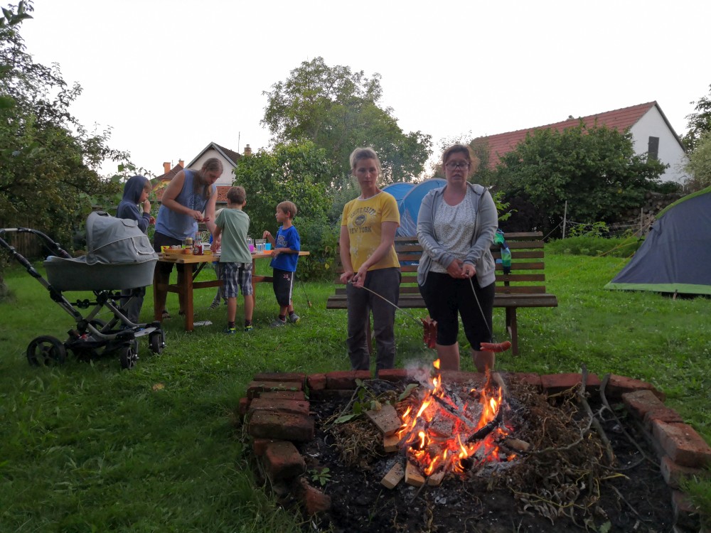 Pelcmanovi a Bára jsou tu celý týden. Dnes pečeme buřty na zahradě.