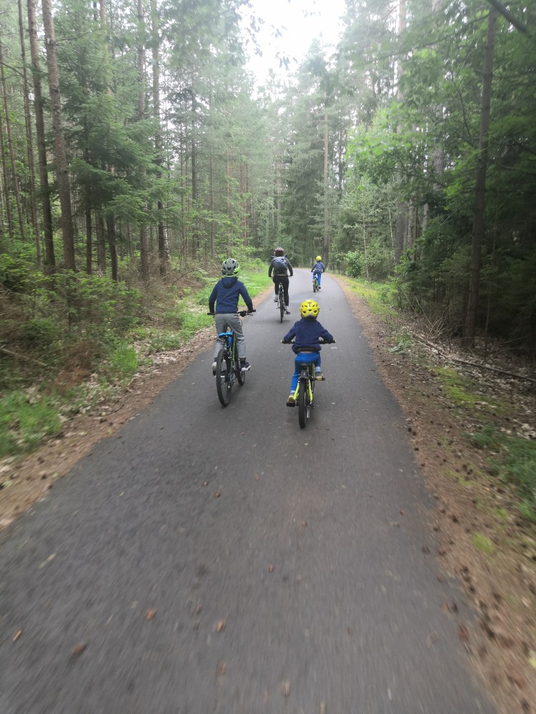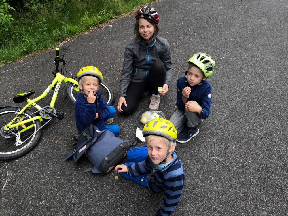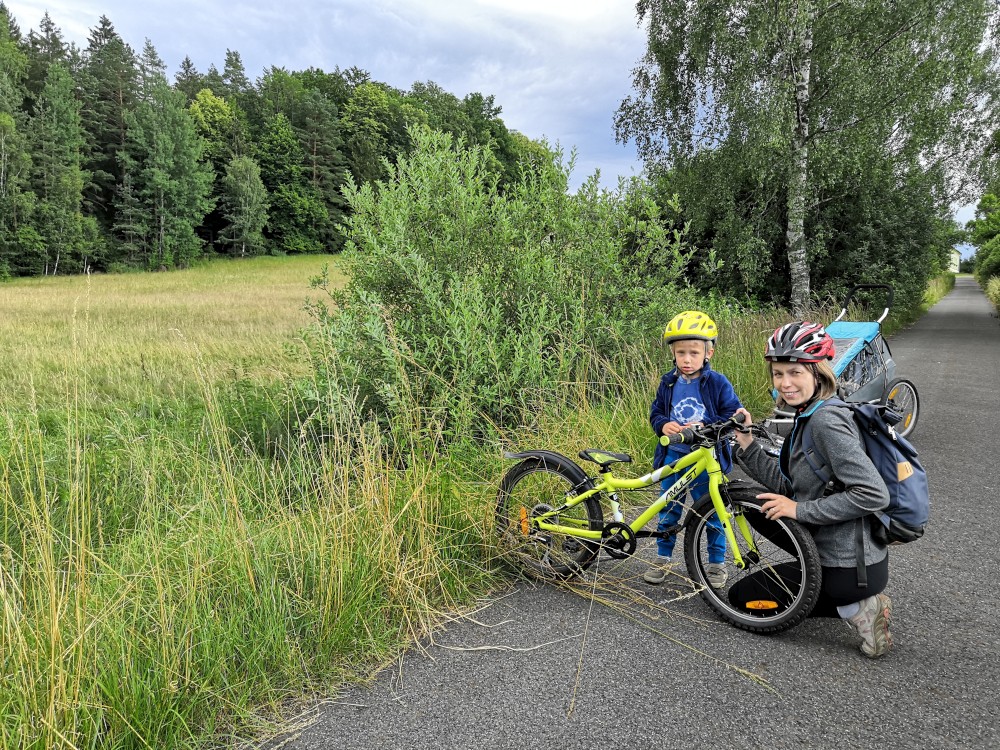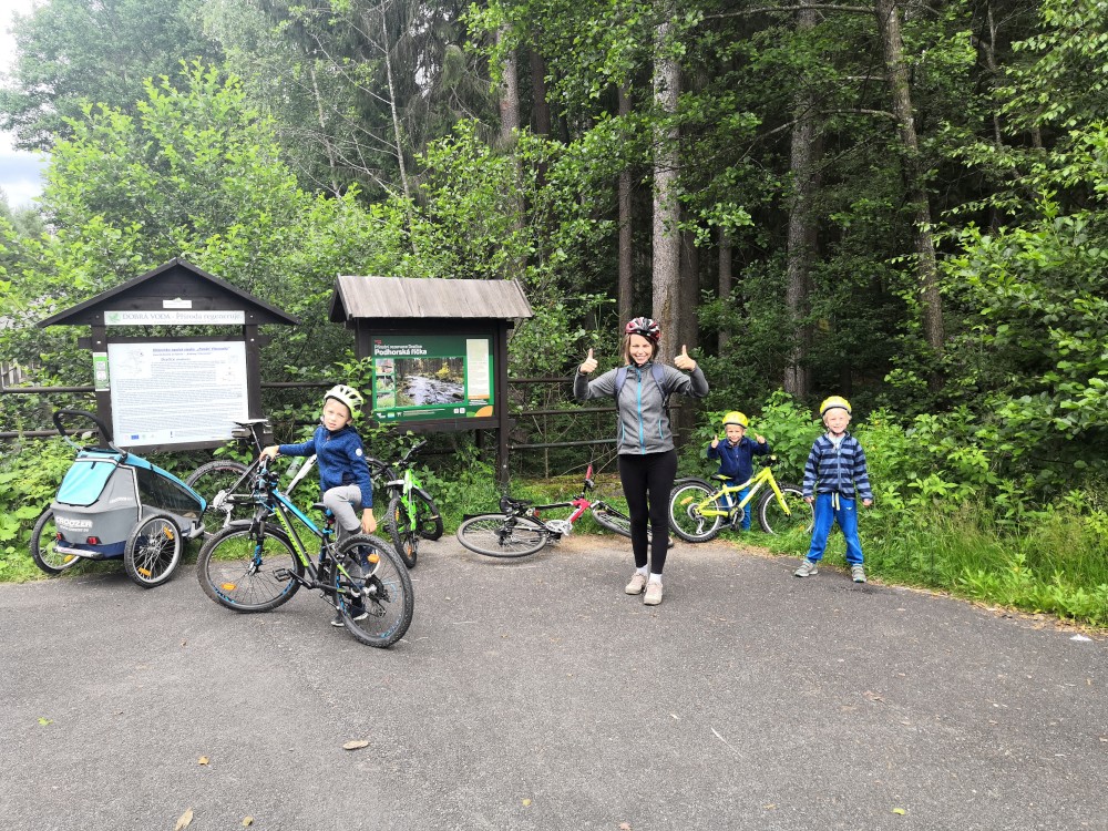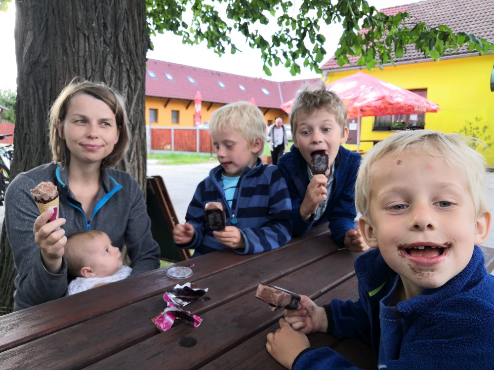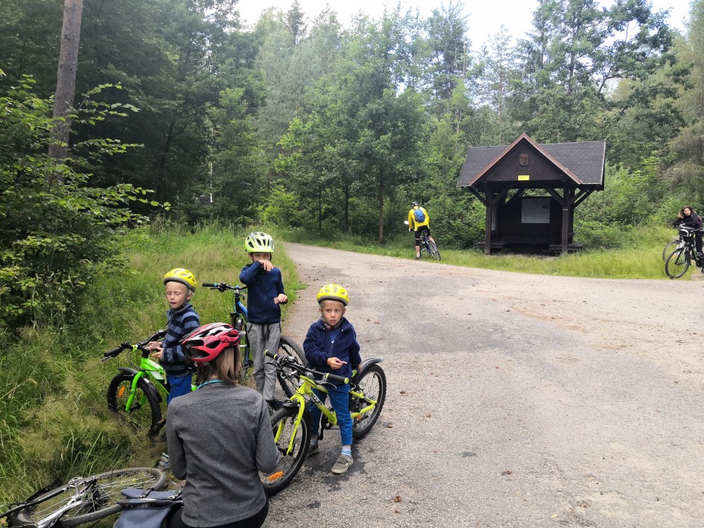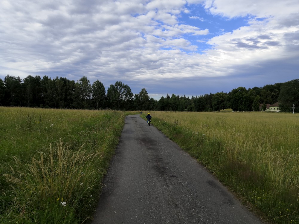 Jedeme na další cyklovýlet. Začínáme kousek od Chlumu u Třeboně na parkovišti Pele. Jedeme po cyklostezce na jih, kolem rybníka Svobodný až k mostu přes řeku Dračici, kde jsme byli na dětském čundru. Pokračujeme přes Velký London na červenou turistickou značku a po ní do Františkova. Zastavujeme se v hospůdce, co známe z čundru. Potkáváme Libora :-).