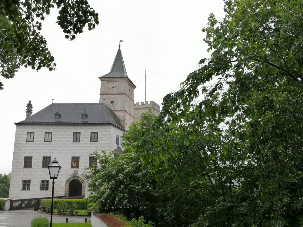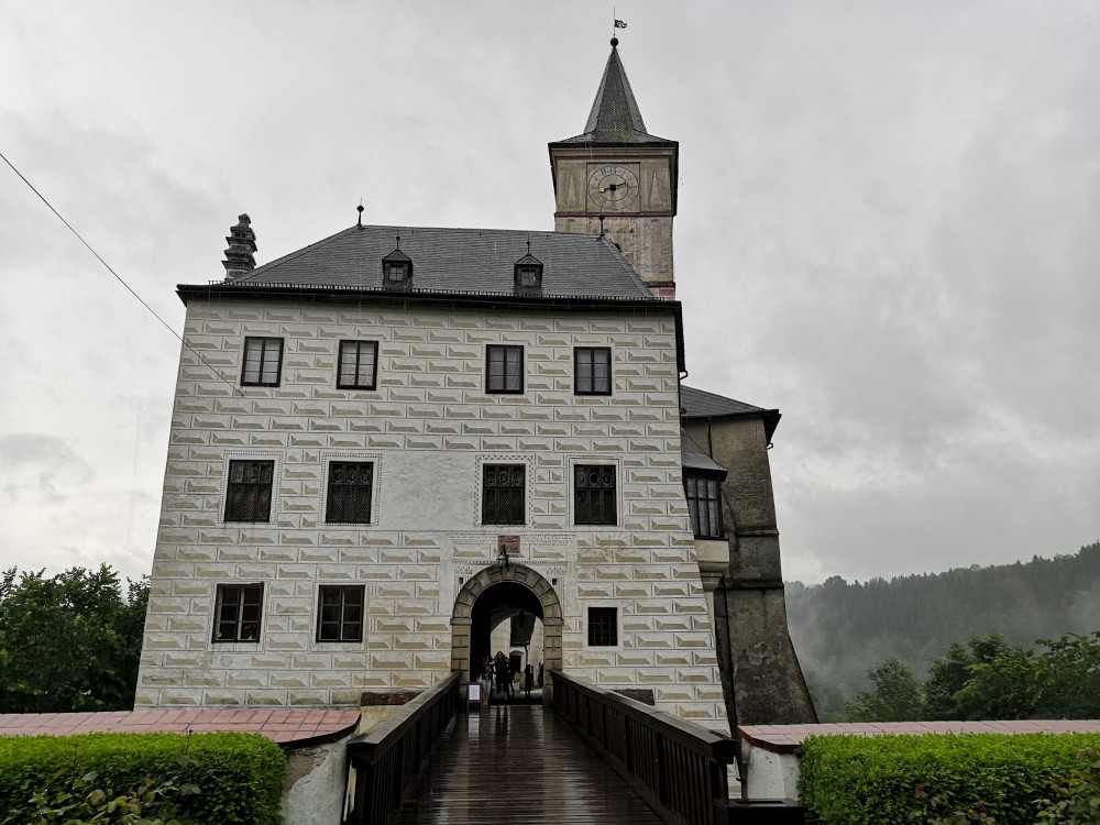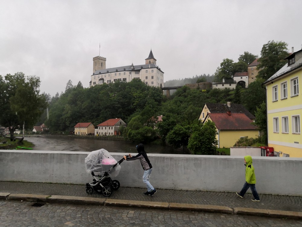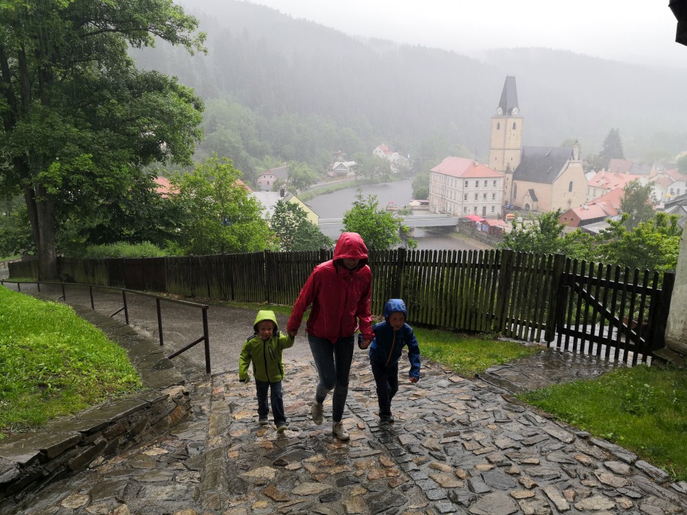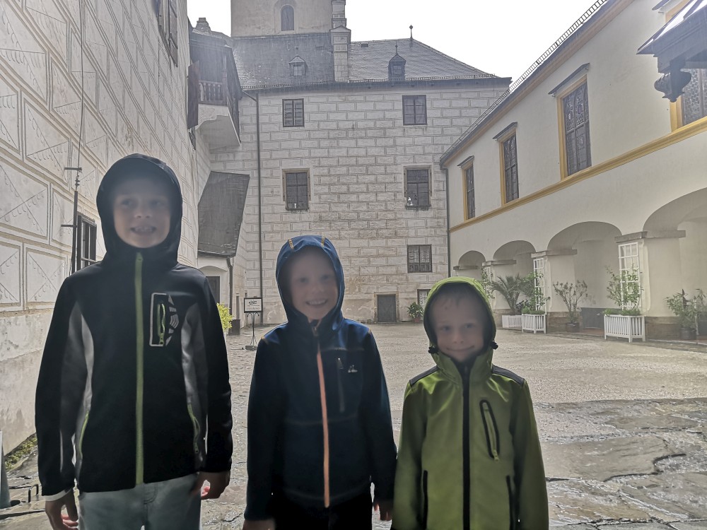Jedeme na výlet na hrad Rožmberk. Začínáme obědem v restauraci Orel a zamlouváme lístky na prohlídku hradu. Zrovna když se už musíme přesunout nahoru na hrad začíná vydatně pršet. Nic jiného nám nezbývá, musíme to přeběhnout. Na hrad dorážíme slušně promoklí.