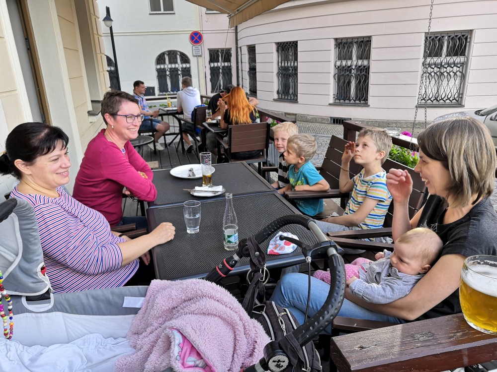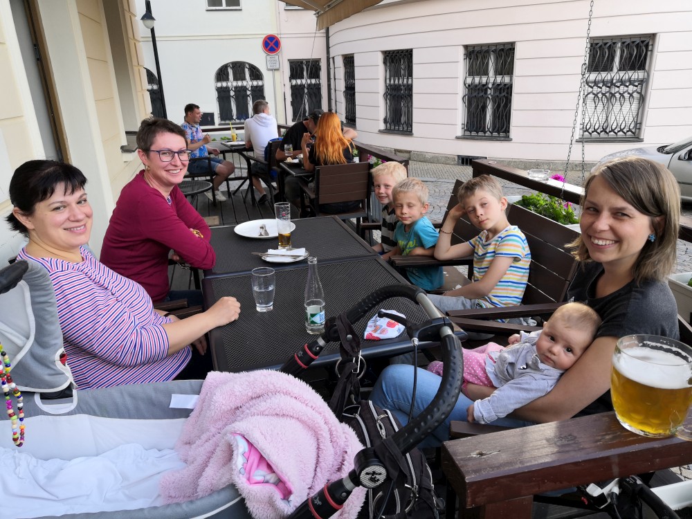Jana si jde s holkama sednout do města na terasu indické restaurace. Já s klukama jedu na cyklo vyjížďku. Zastavujeme se chvilku na náměstí a chvilku s holkama posedíme. Pak jedeme dál.