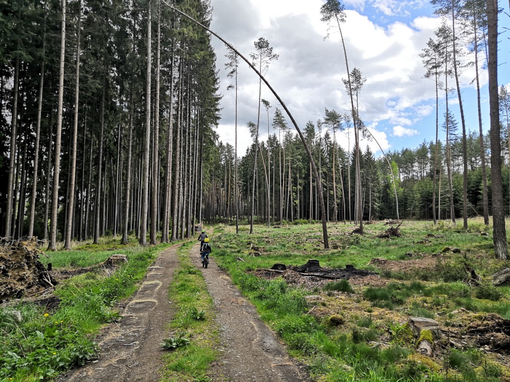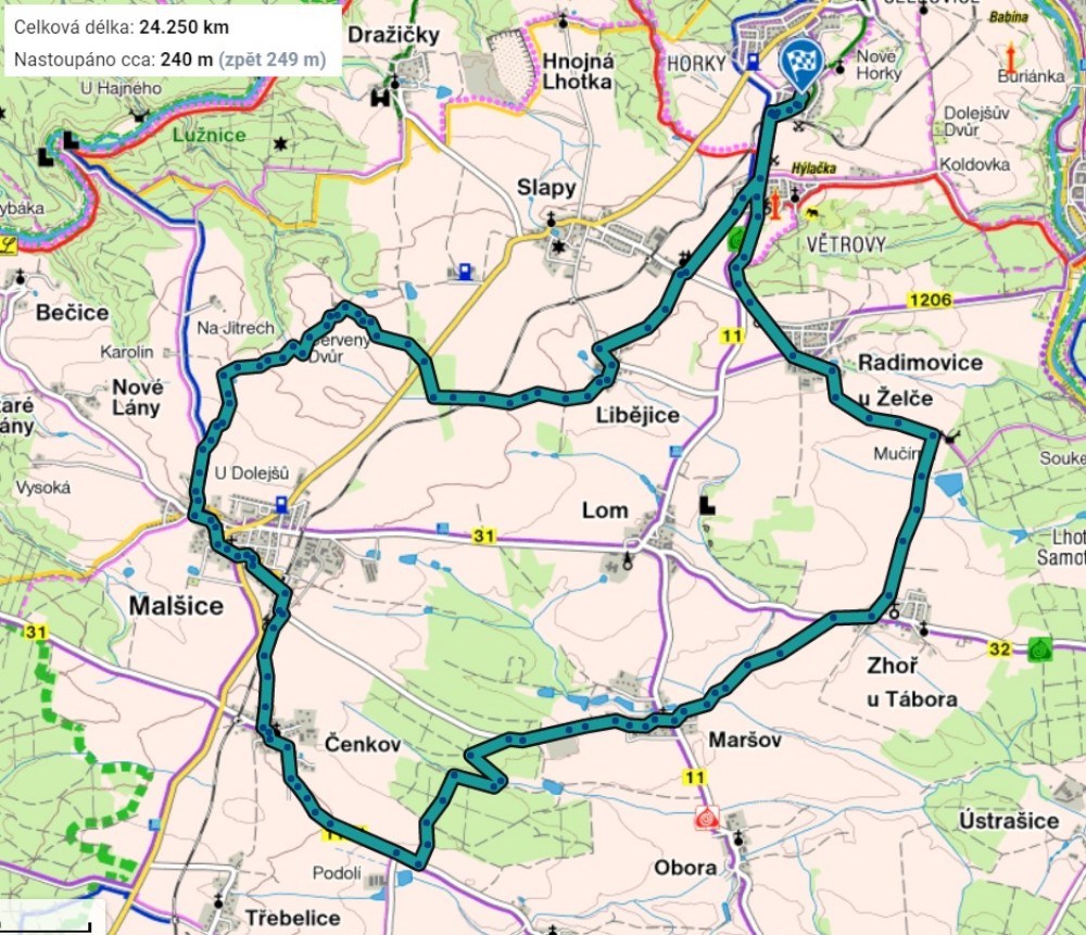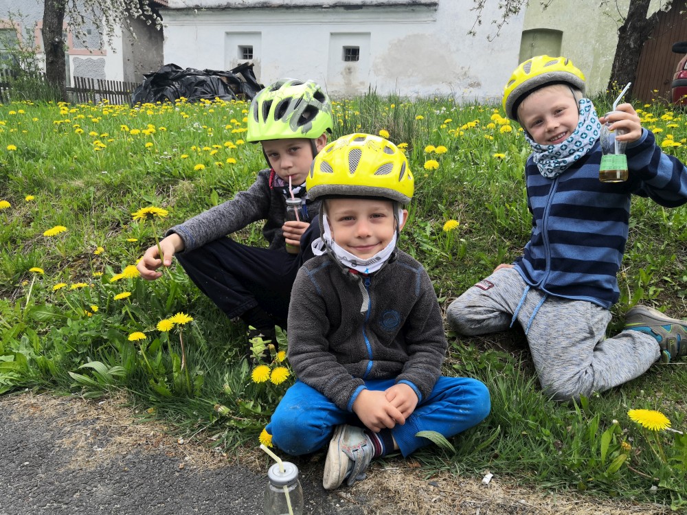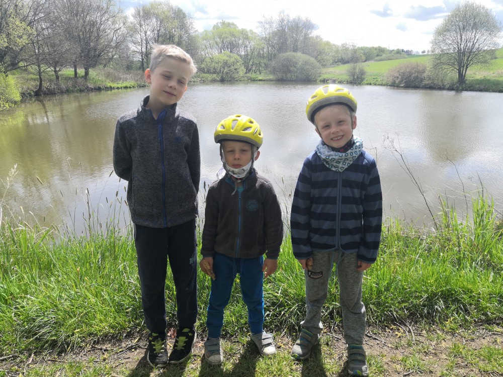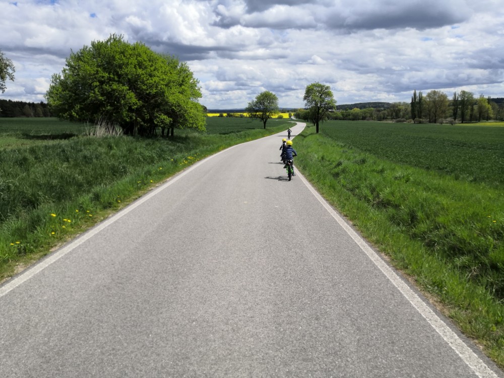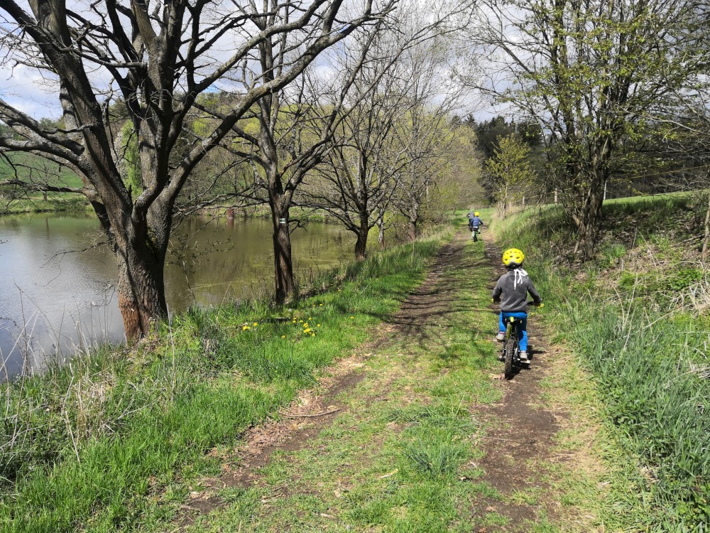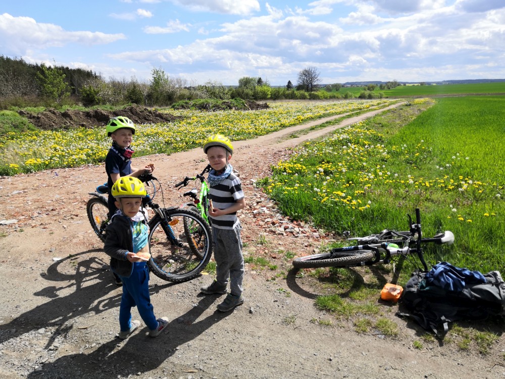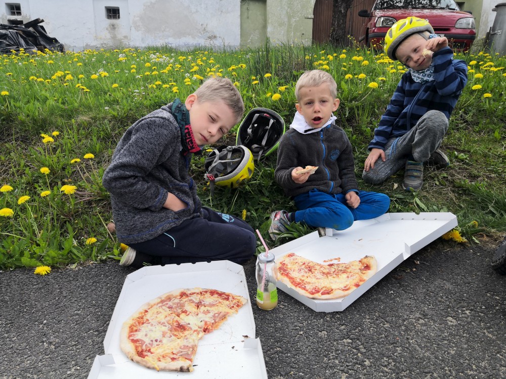 Jedu s klukama na vyjížďku na kole. Již se postupně otevírají restaurace. Vyrážíme před polednem a náš cíl je čenkovská pizzeria. Jedeme přes Červený dvůr. V Čenkově si u okýnka kupujeme pizzu (dovnitř se ještě nesmí). Pak se vracíme domů přes lesy, Maršov, Zhoř a Radimovice.