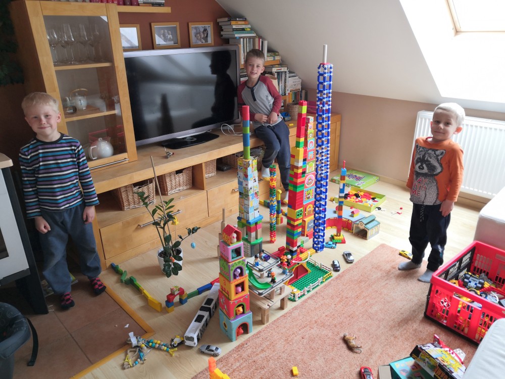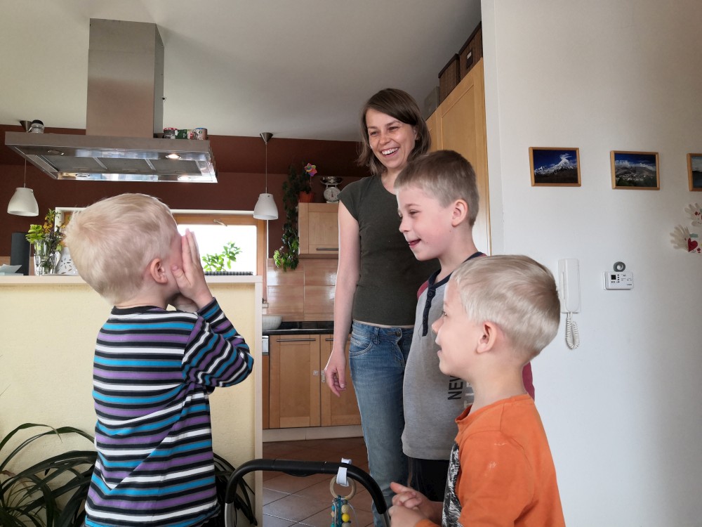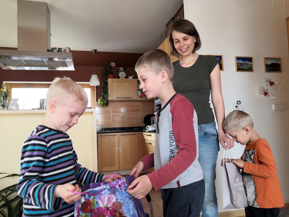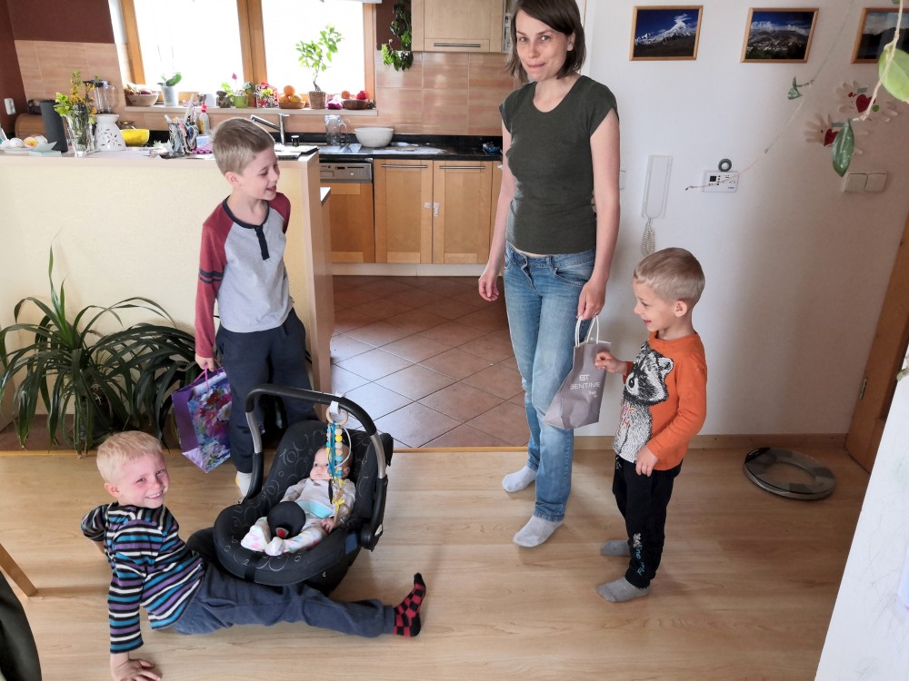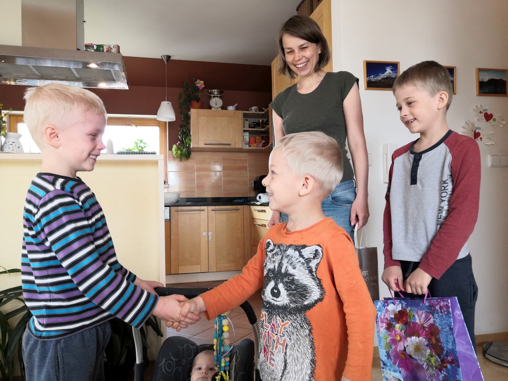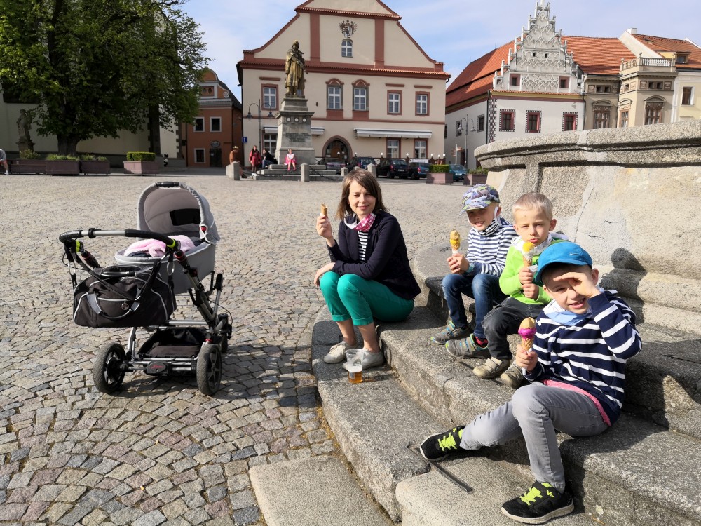 Jiřík má dneska svátek. Přejeme mu. Pak jdeme na zmrzlinu do města.
