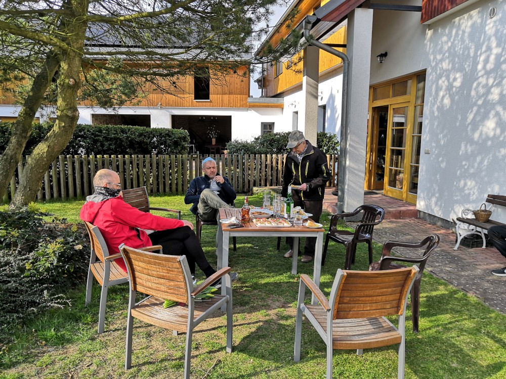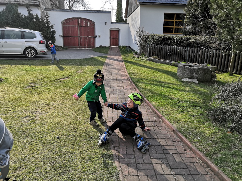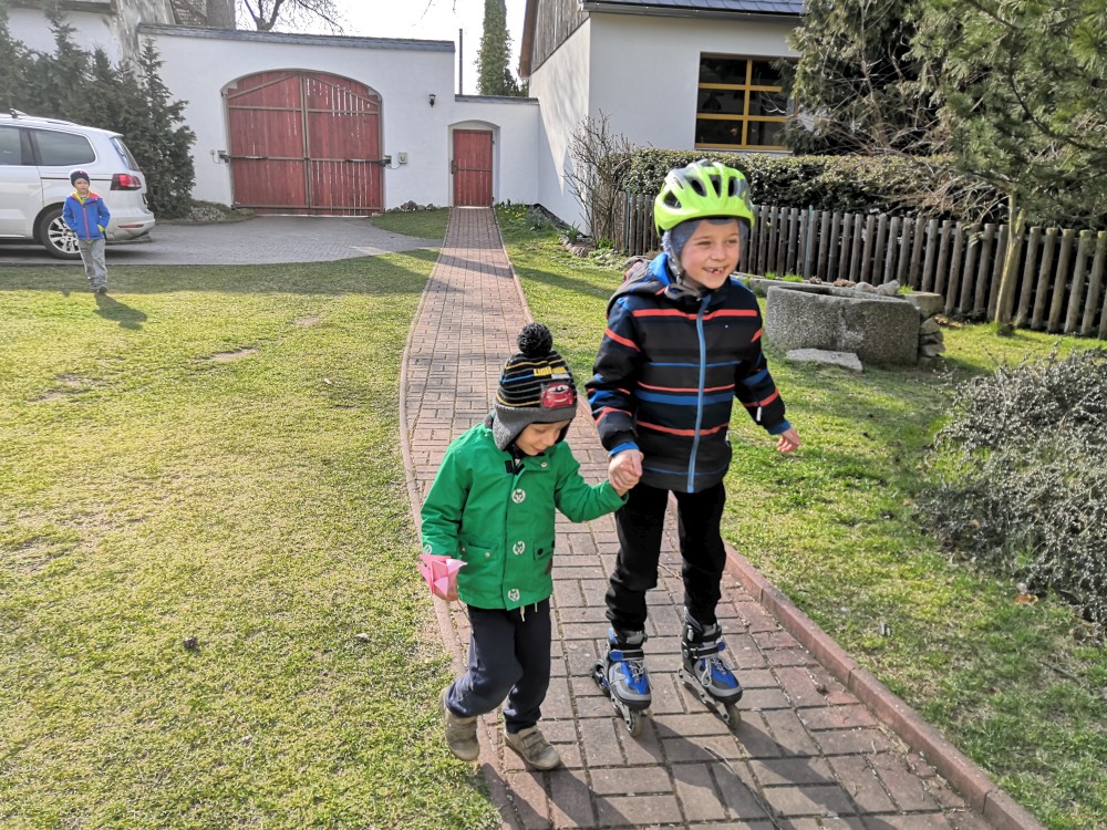 Dnes odpoledne máme karanténní poradu. Prostě takový večírek pro sociální kontakt s rouškama :-). Kluci zkouší brusle po Kryštůfkovi.