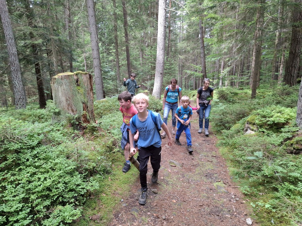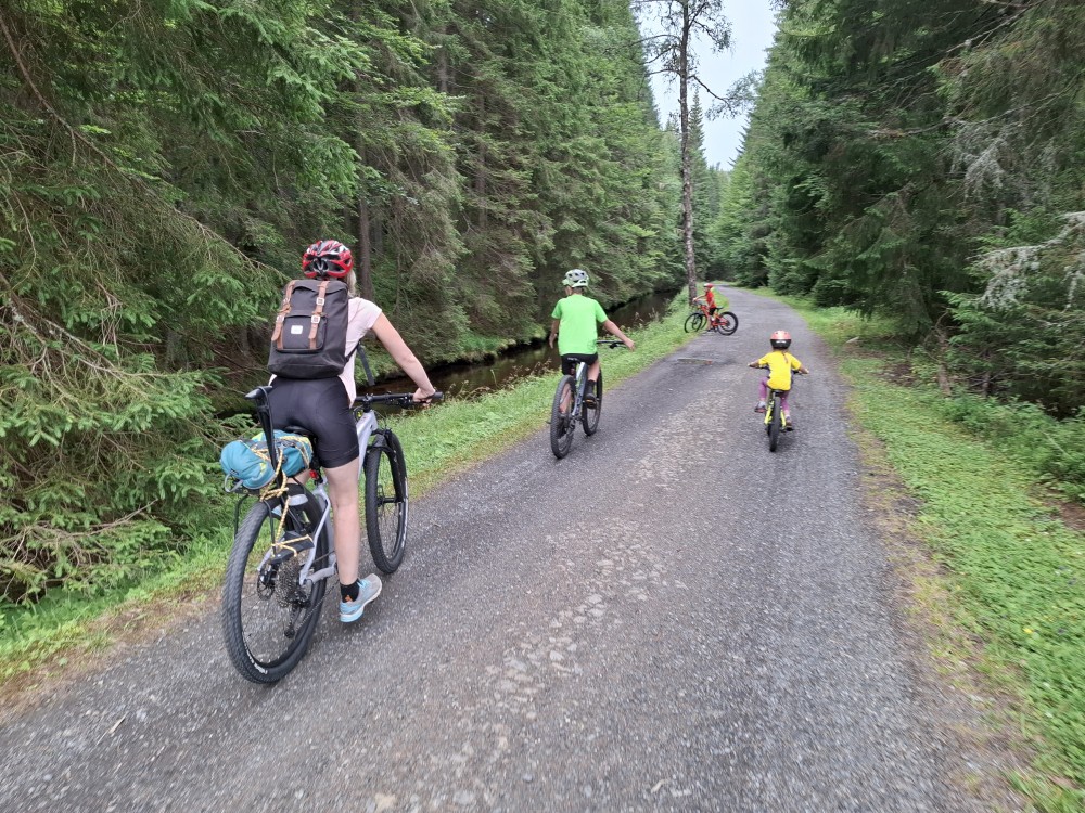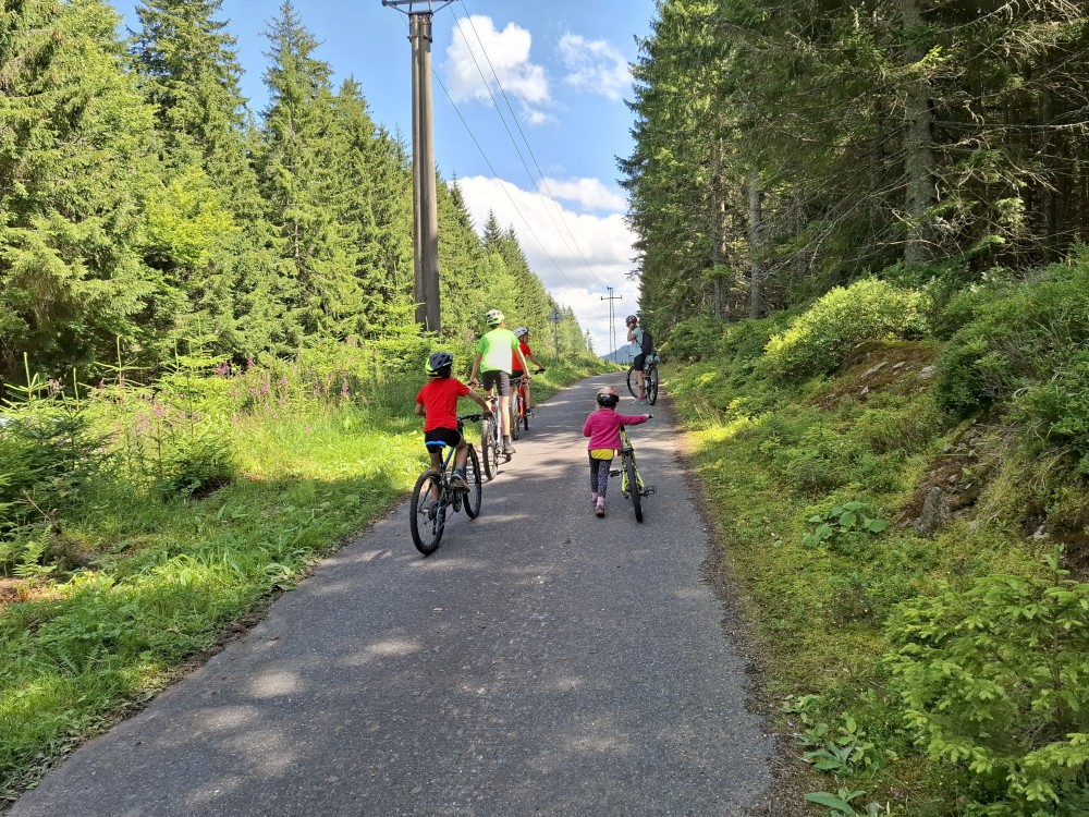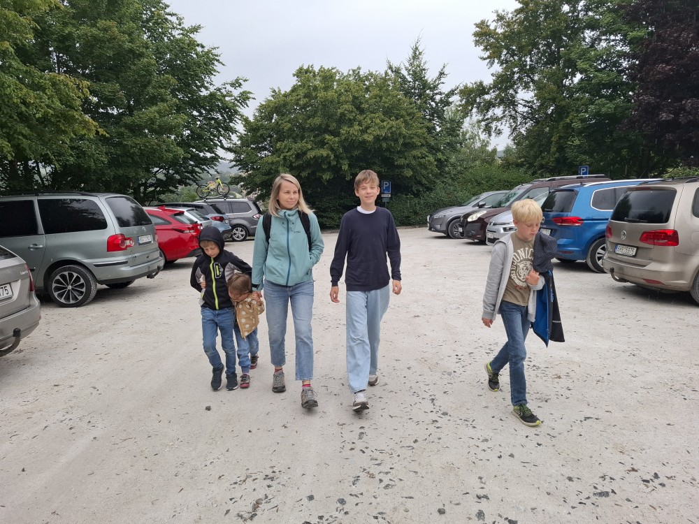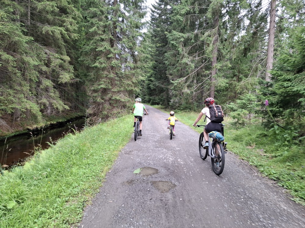 Ráno zase nikam nespěcháme. Já dělám skoro celé dopoledne dřevo. Jana s dětma hrají hry. Pak Jana vaří oběd (těstoviny bolognese). Po obědě vyrážíme na výlet na kola. Jedeme oběma auty. Jany auto necháváme v Srní, platíme parkování na recepci u místního hotelu.