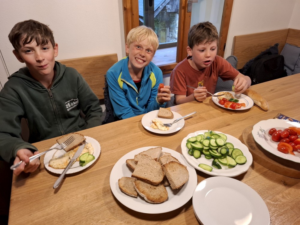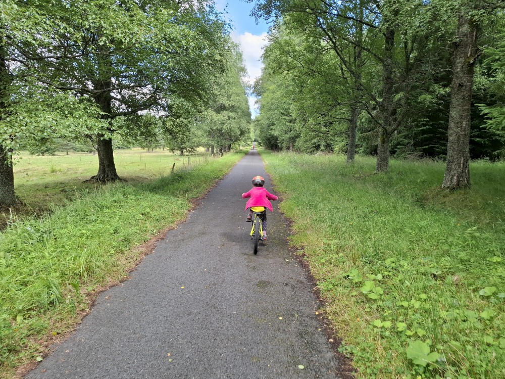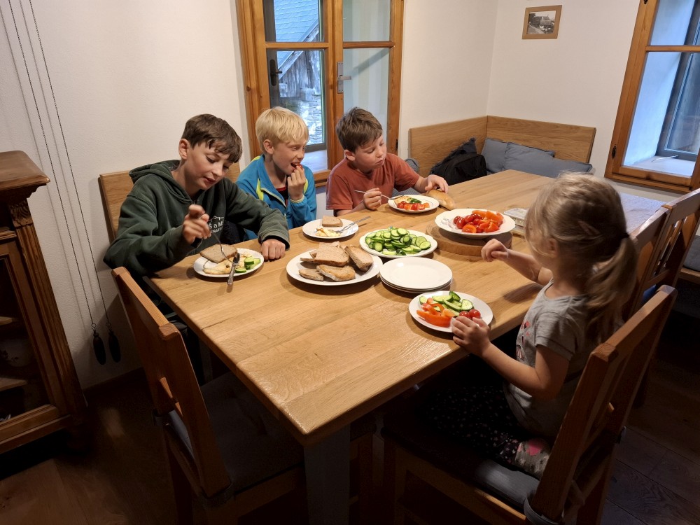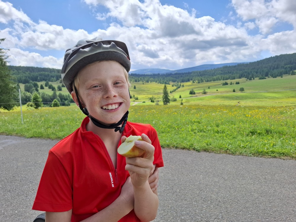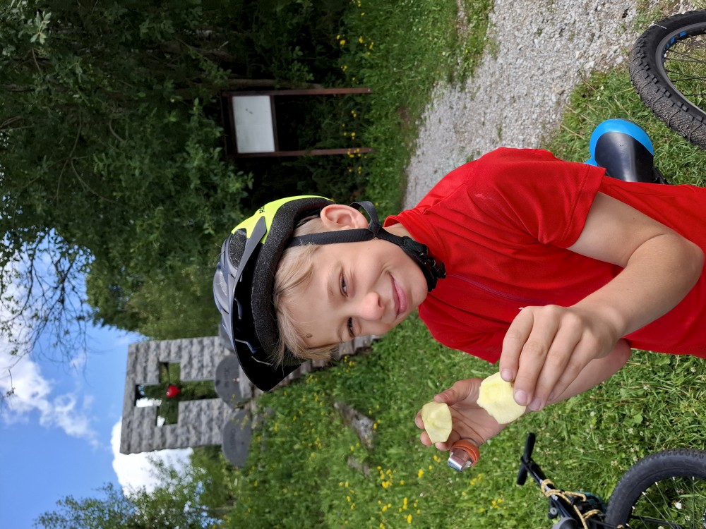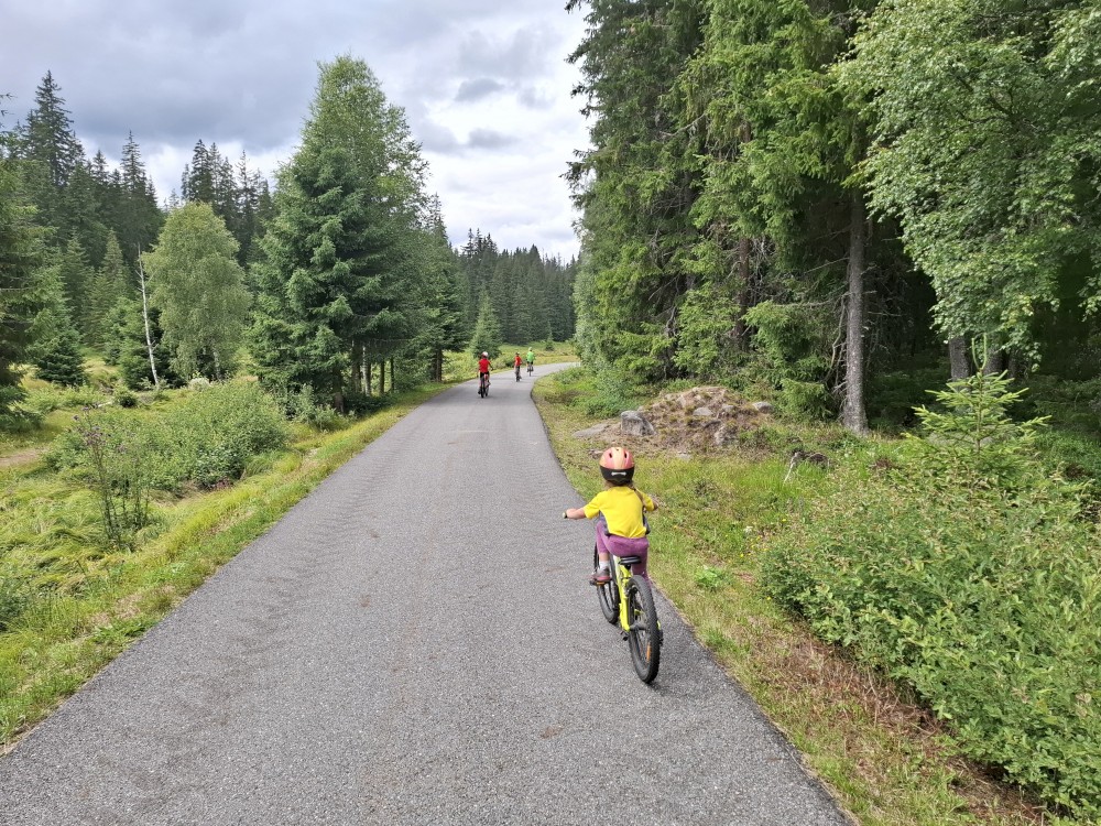 Ráno zase nikam nespěcháme. Já dělám skoro celé dopoledne dřevo. Jana s dětma hrají hry. Pak Jana vaří oběd (těstoviny bolognese). Po obědě vyrážíme na výlet na kola. Jedeme oběma auty. Jany auto necháváme v Srní, platíme parkování na recepci u místního hotelu.