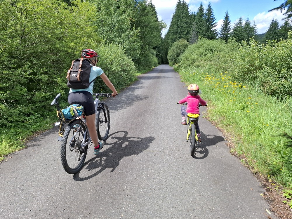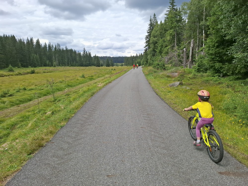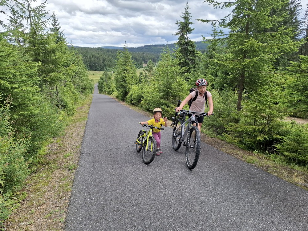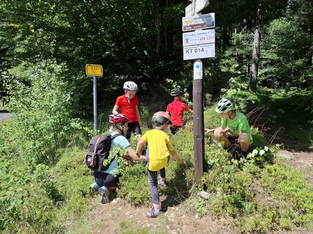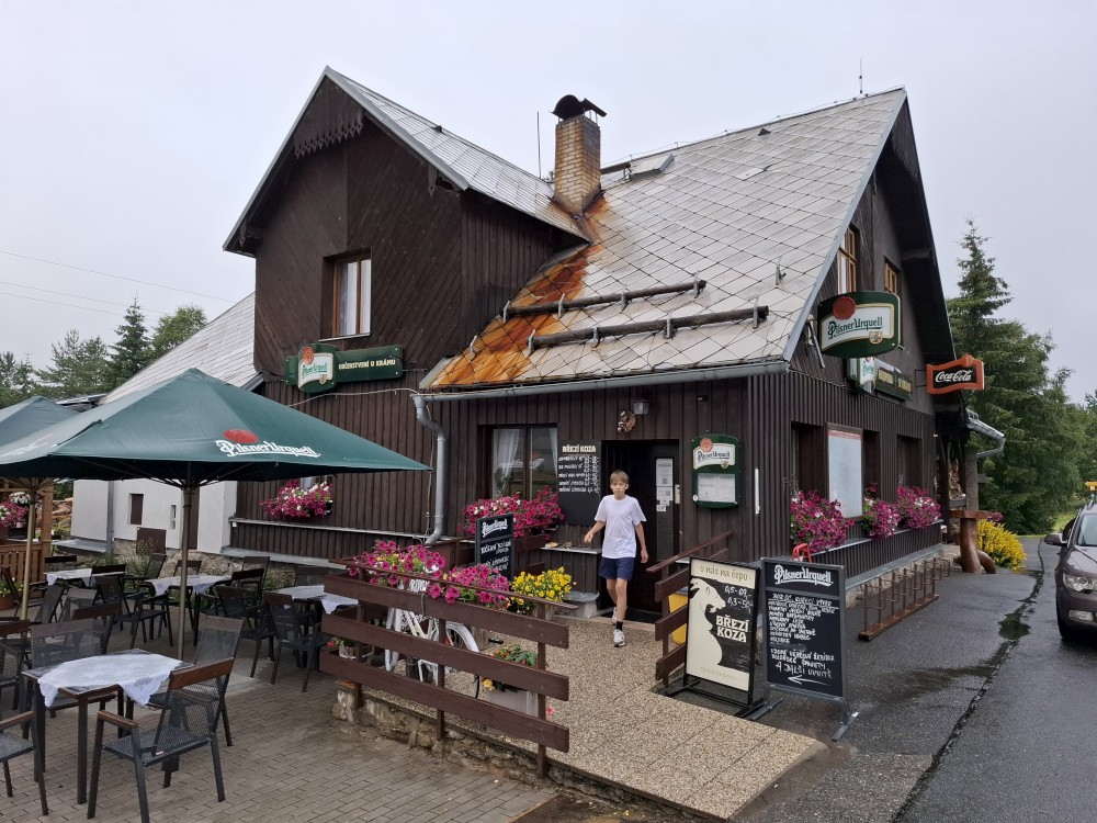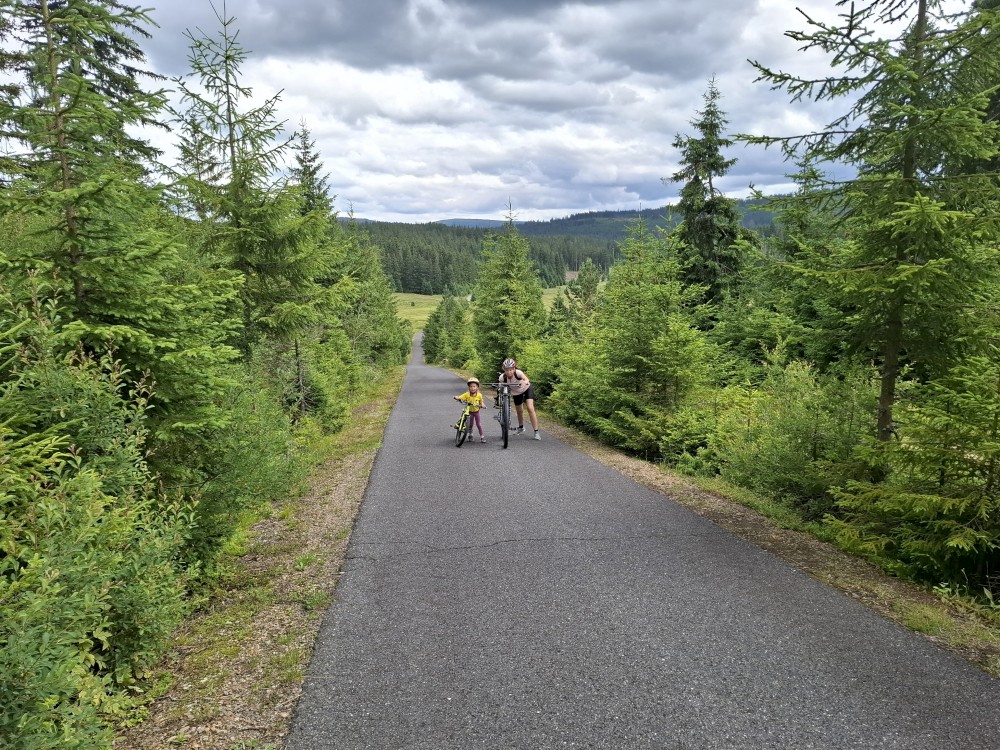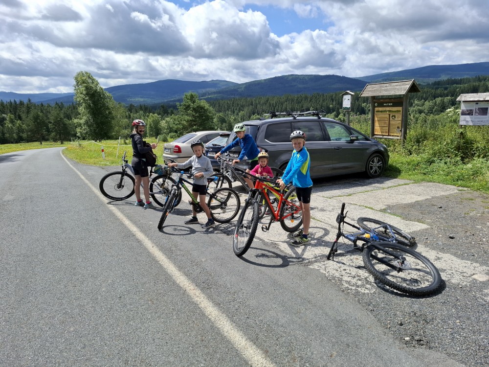 Pak se přes Slučí tah dostáváme k závěrečnému kopci k autu. Jsme rádi, že jsme tu. Bětuška má rekordní vzálenost ujetou na kole. Nakládáme kola a vyrážíme na velmi pozdní oběd. Jedeme do naší oblíbené hospůdky U Krámu na Horské Kvildě.