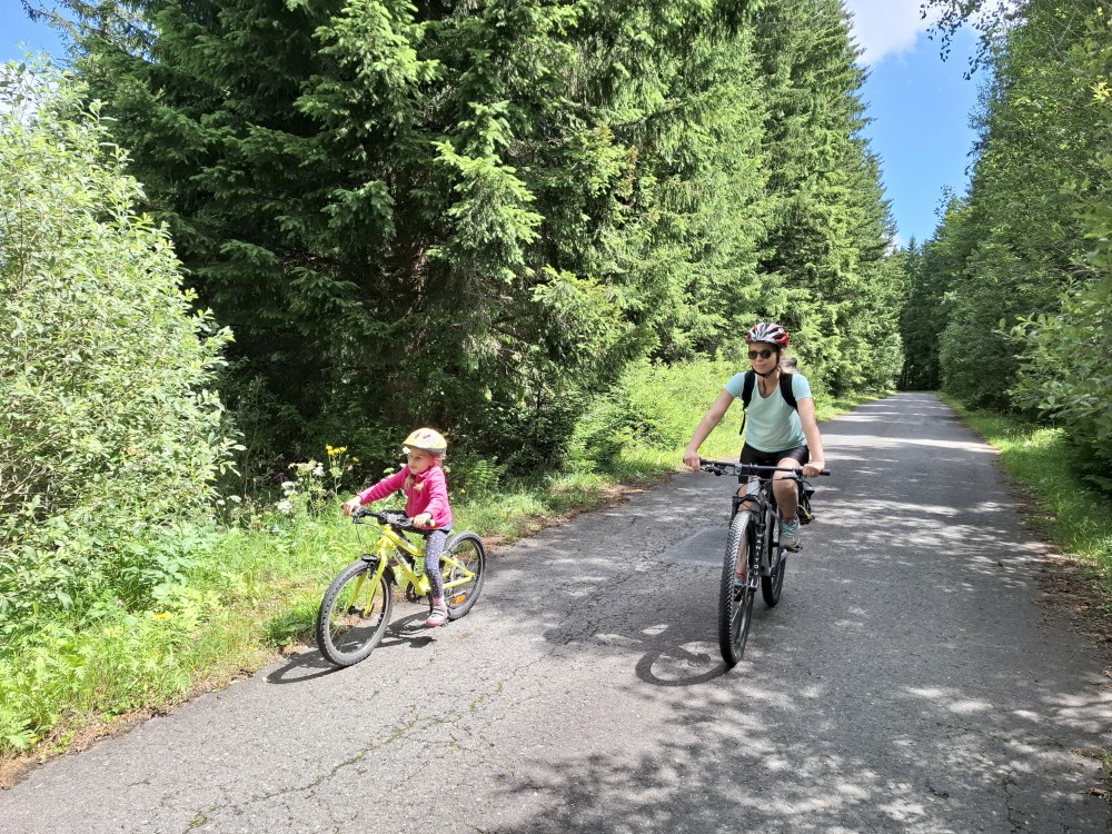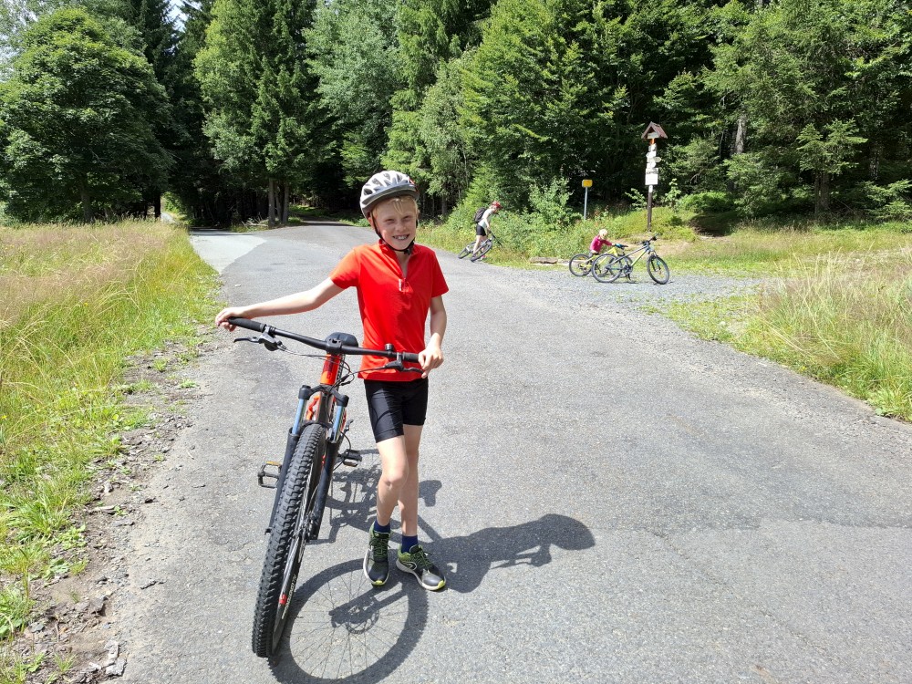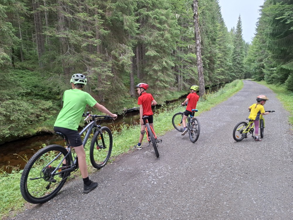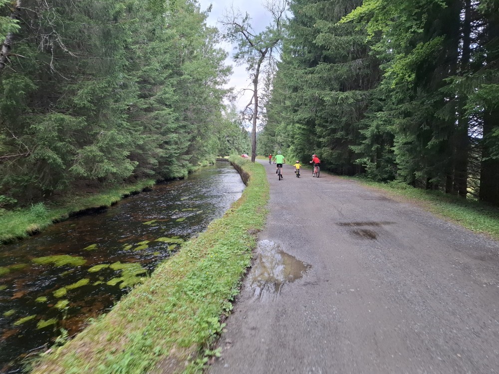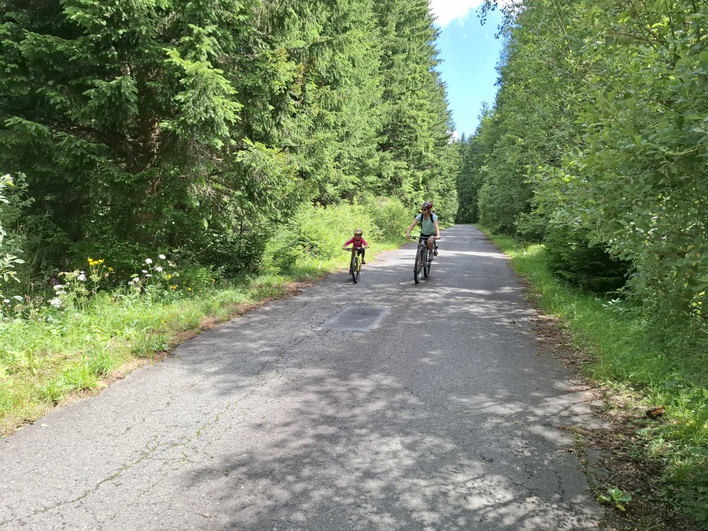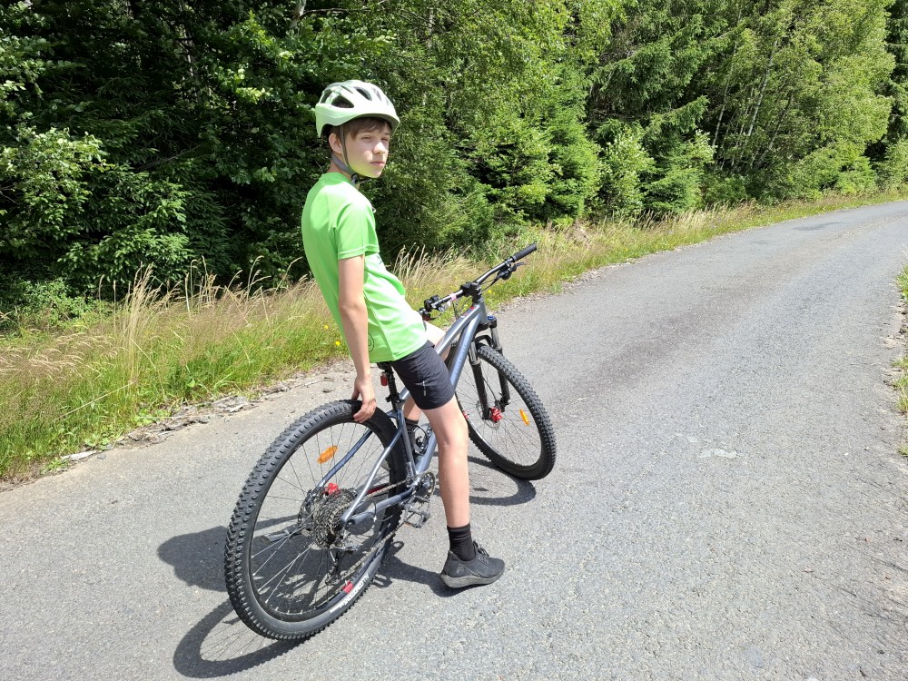 Pak se přes Slučí tah dostáváme k závěrečnému kopci k autu. Jsme rádi, že jsme tu. Bětuška má rekordní vzálenost ujetou na kole. Nakládáme kola a vyrážíme na velmi pozdní oběd. Jedeme do naší oblíbené hospůdky U Krámu na Horské Kvildě.