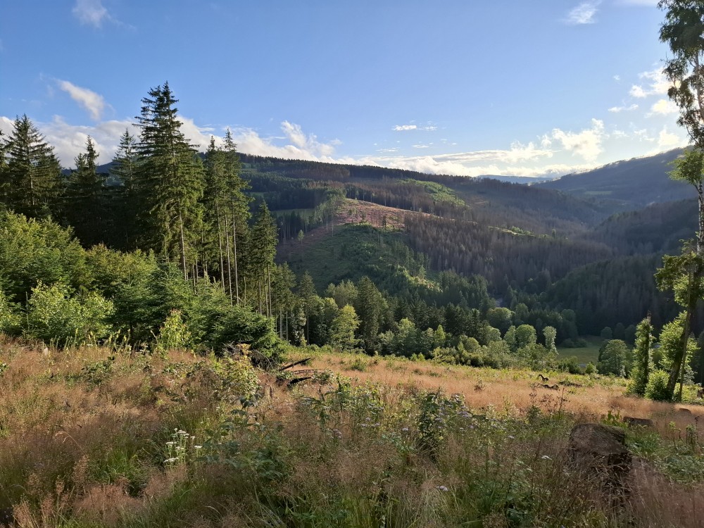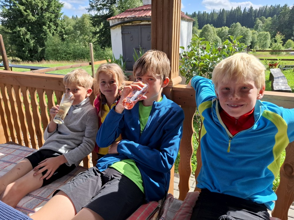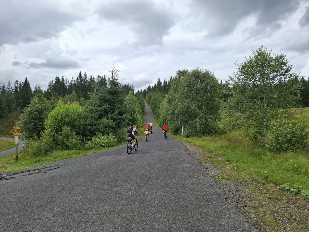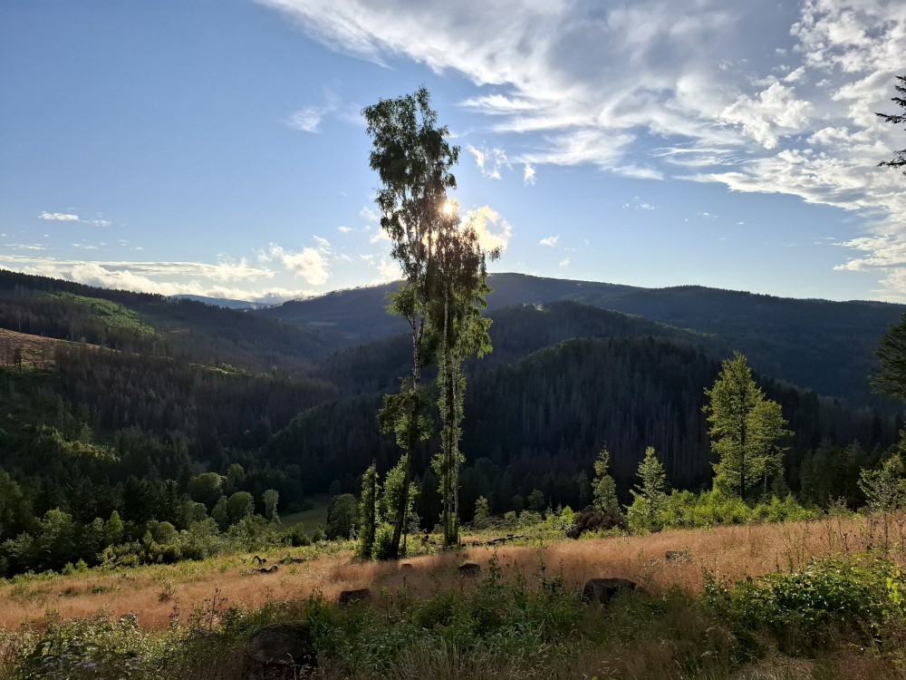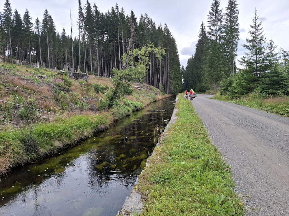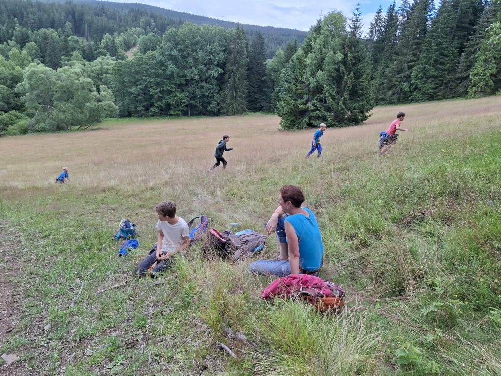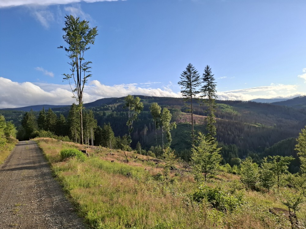 Pak se přes Slučí tah dostáváme k závěrečnému kopci k autu. Jsme rádi, že jsme tu. Bětuška má rekordní vzálenost ujetou na kole. Nakládáme kola a vyrážíme na velmi pozdní oběd. Jedeme do naší oblíbené hospůdky U Krámu na Horské Kvildě.