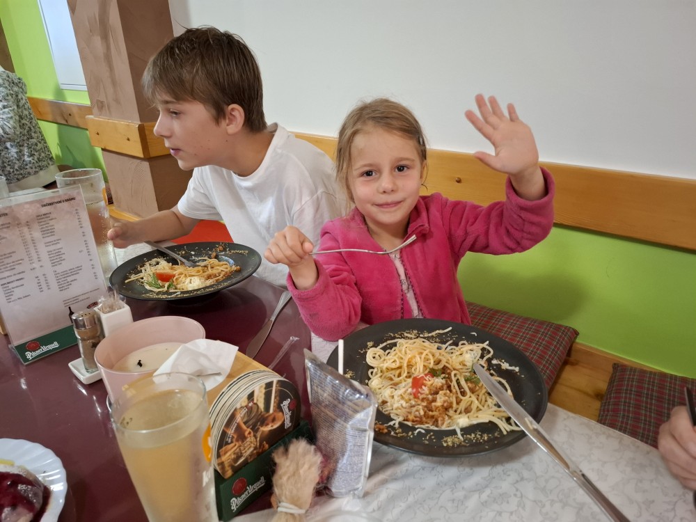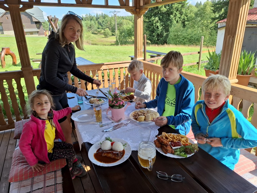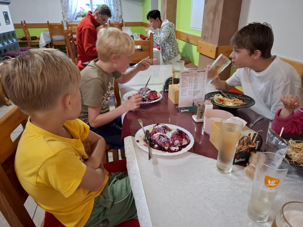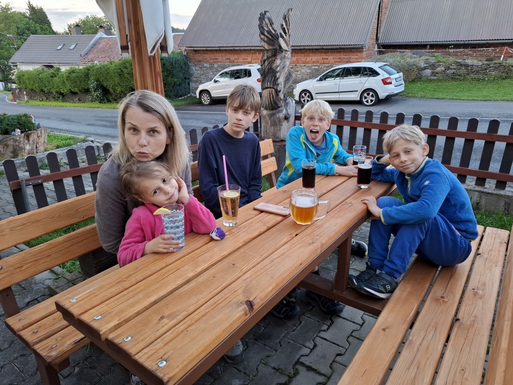 Jedeme do Kašperských hor, kde si dáváme společně oběd v restauraci Na solné stezce. Také nekupujeme nějaké drobnosti v obchodě. Loučíme se s Kultovkou, která se vrací s dětma do Tábora a jedeme do Jelenova.