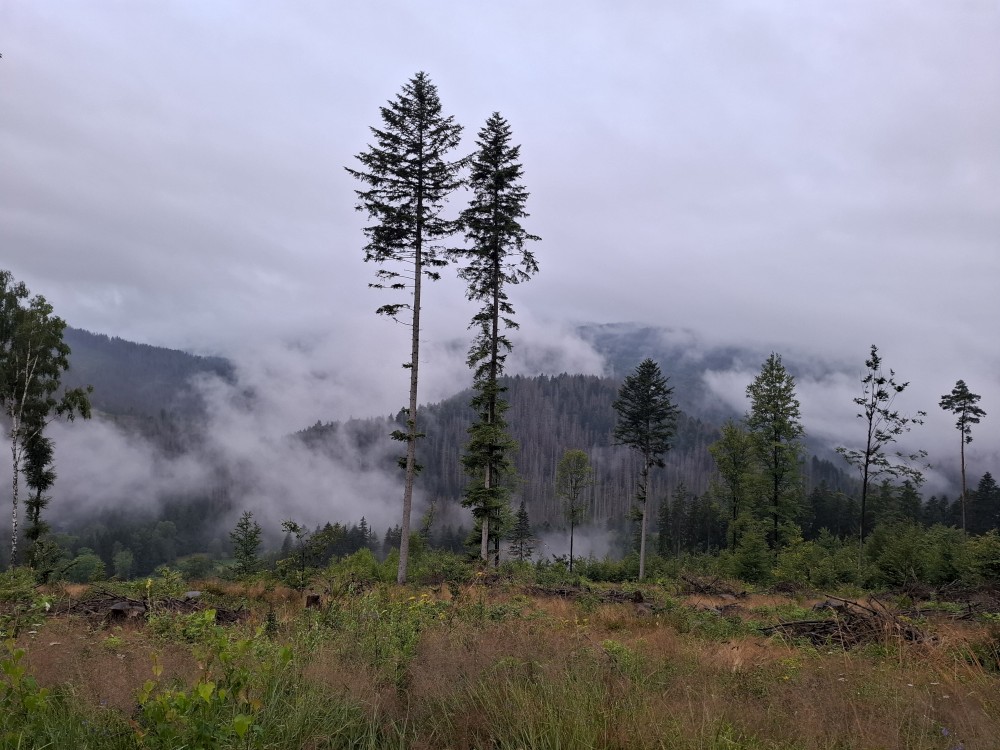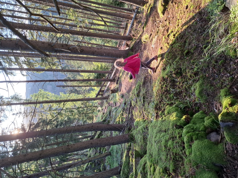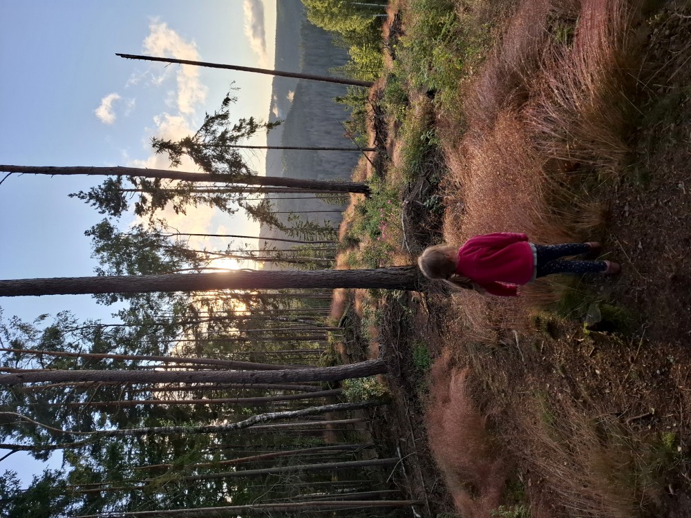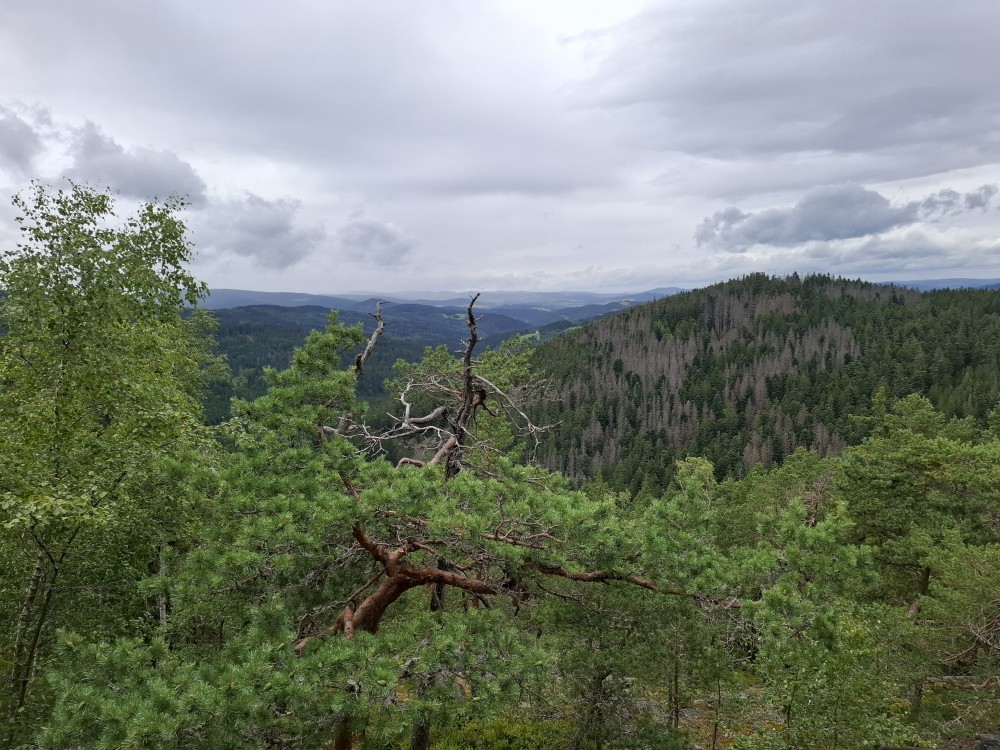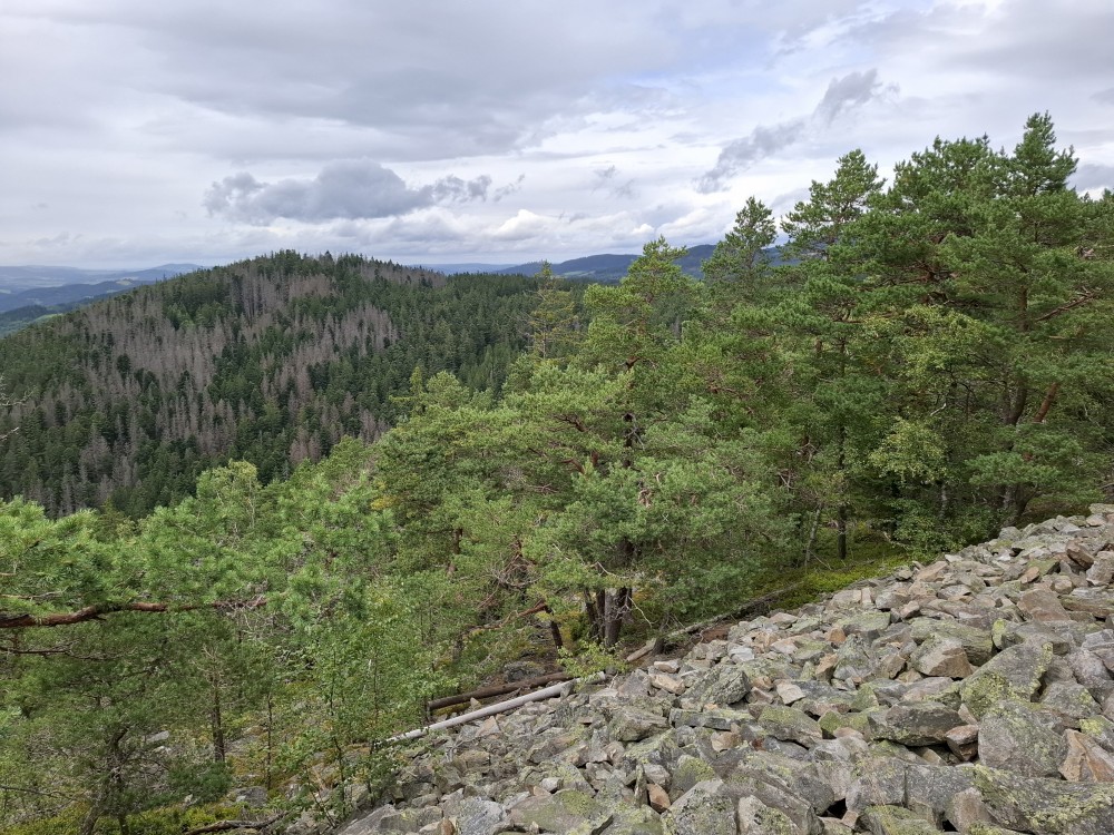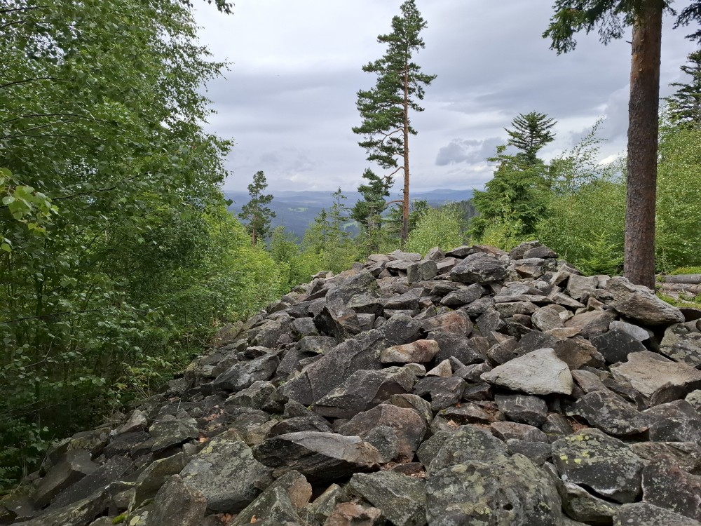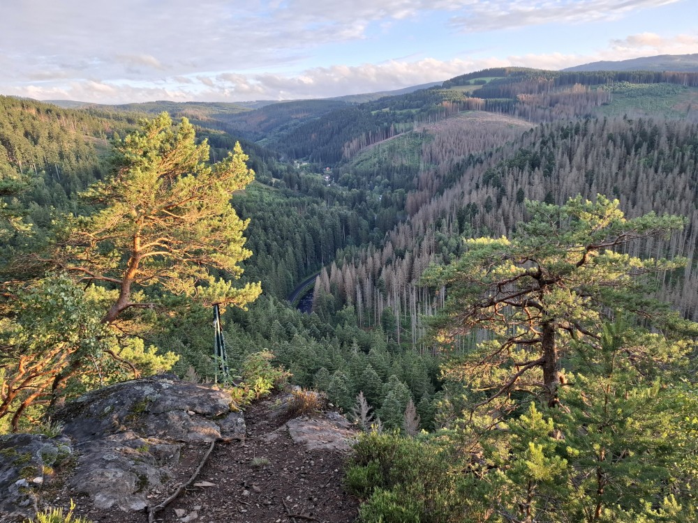 Je nyní fakt krásně, tak se rozhodujeme, že se půjdeme ještě podívat na Dračí skály. Cestou jíme maliny a užíváme si prosluněné výhledy do vlhké krajiny ze které stoupá pára. Chvilku posedíme na vyhlídce. Někdo zde urval kovový kříž. Pak se vracíme na chalupu.