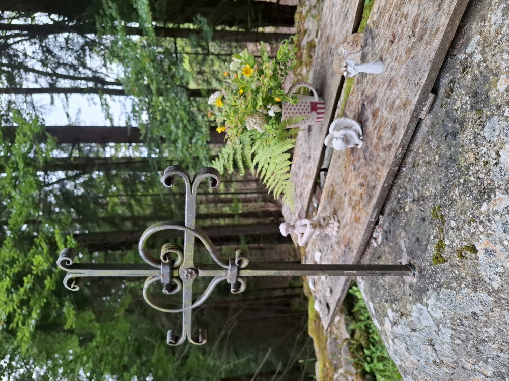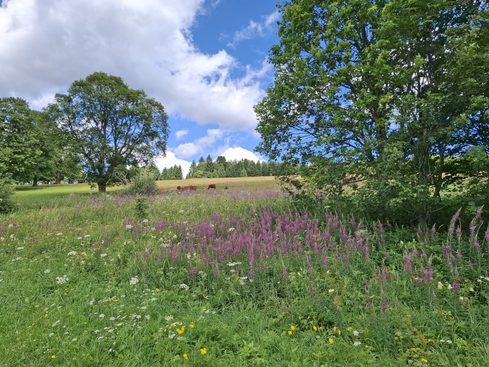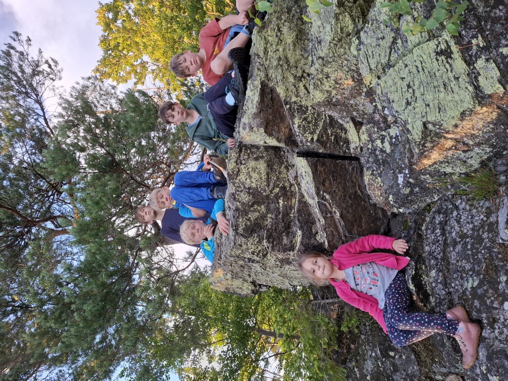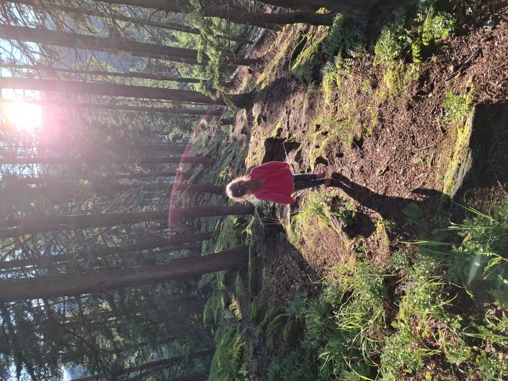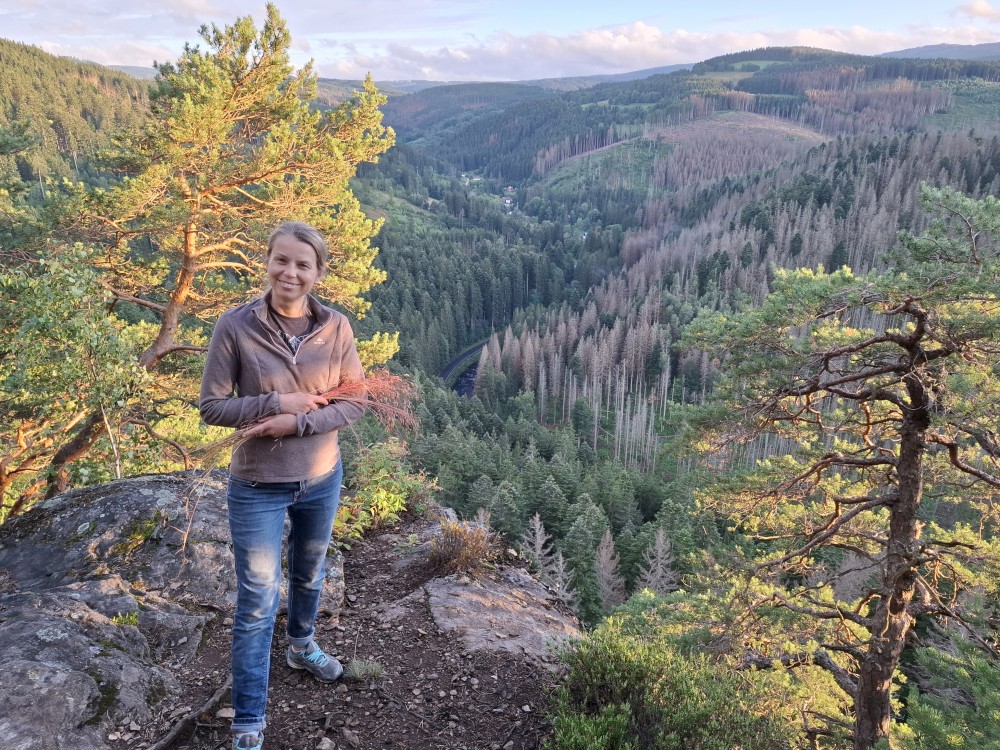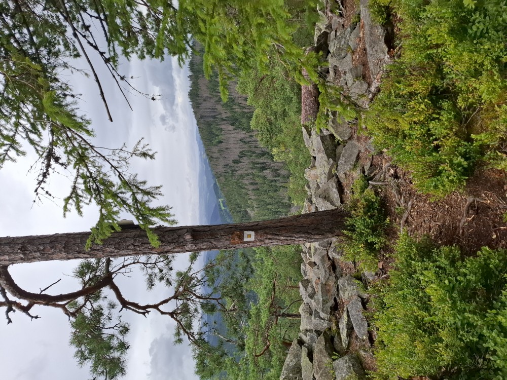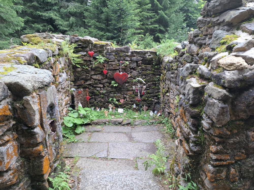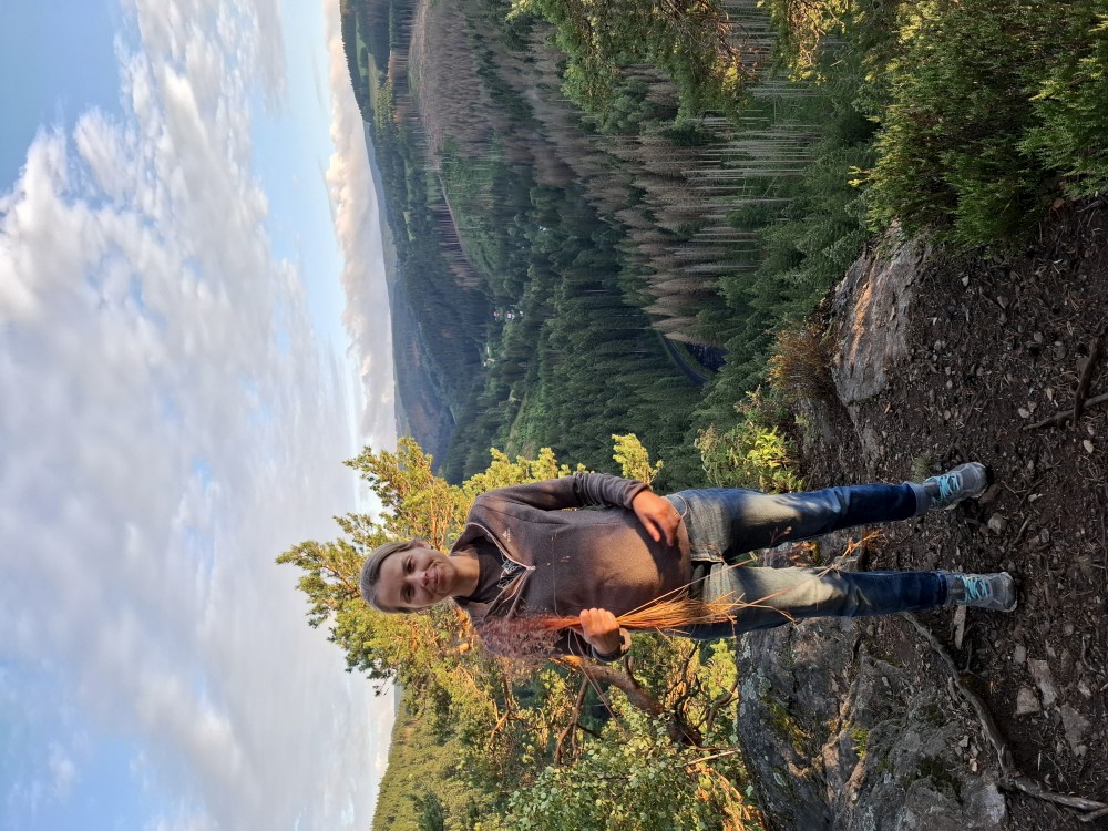 Je nyní fakt krásně, tak se rozhodujeme, že se půjdeme ještě podívat na Dračí skály. Cestou jíme maliny a užíváme si prosluněné výhledy do vlhké krajiny ze které stoupá pára. Chvilku posedíme na vyhlídce. Někdo zde urval kovový kříž. Pak se vracíme na chalupu.