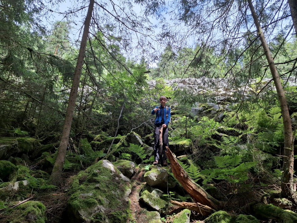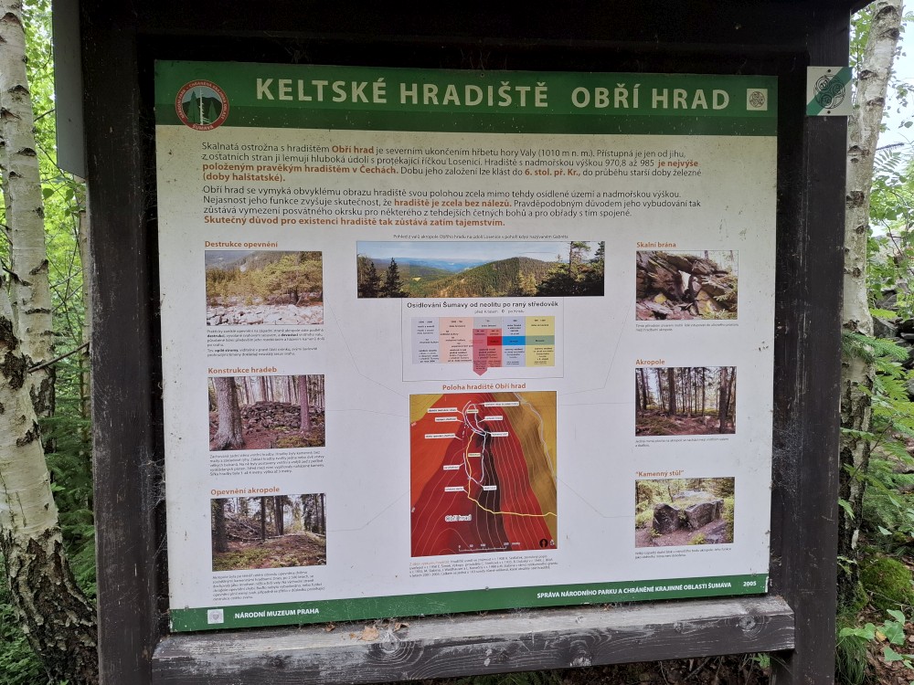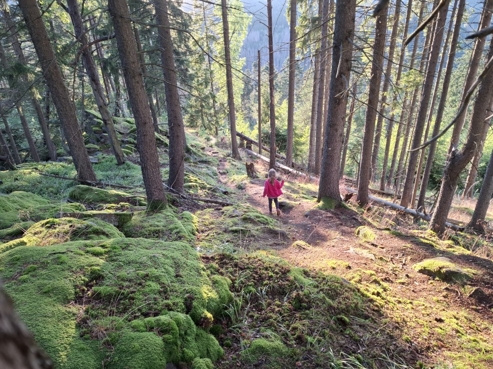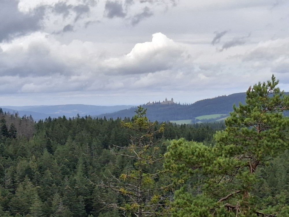Pak ppokračujeme na Obří hrad. Cestou hrajeme nálety. Na Obřím hradě se jdeme podívat na vyhlídku na hrad Kašperk. Začíná trochu pršet. Vracíme se po lesních cestách zpět k autu.
