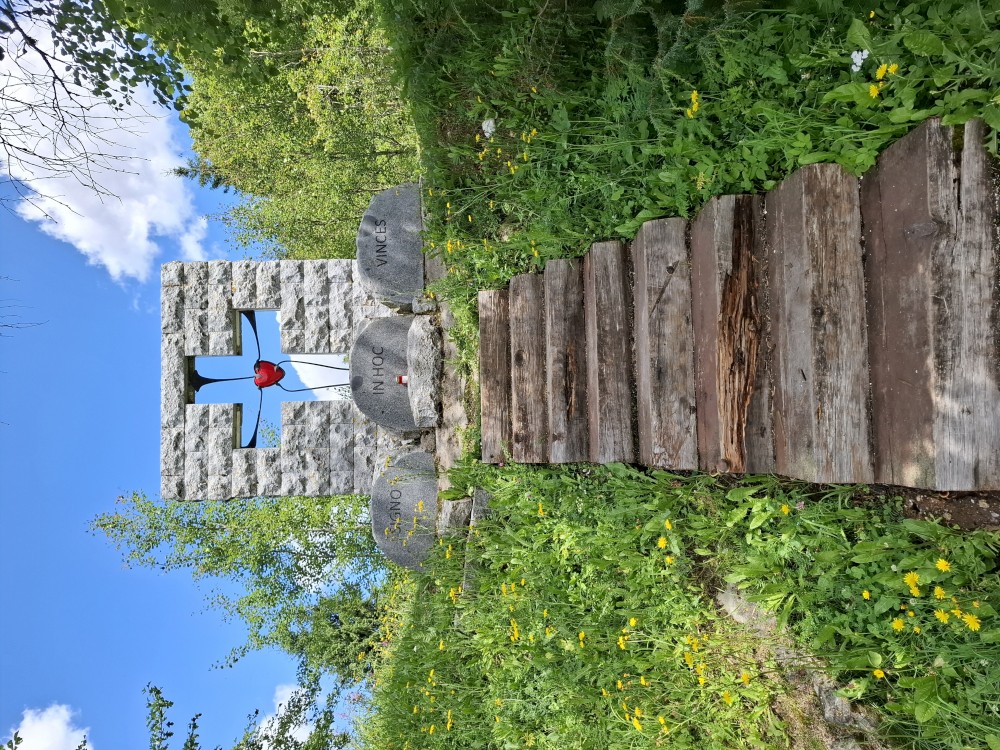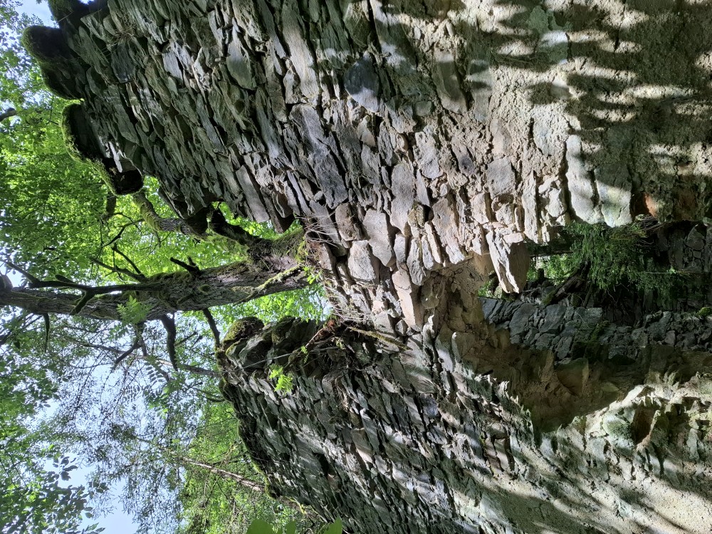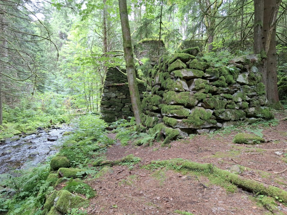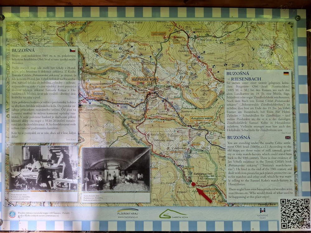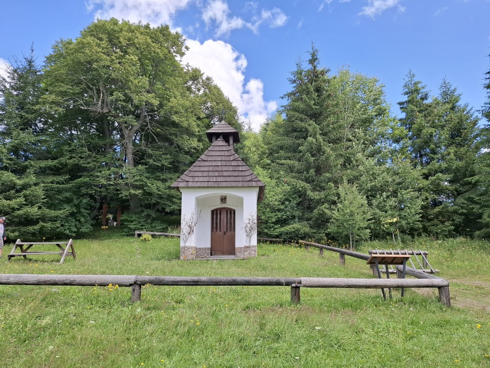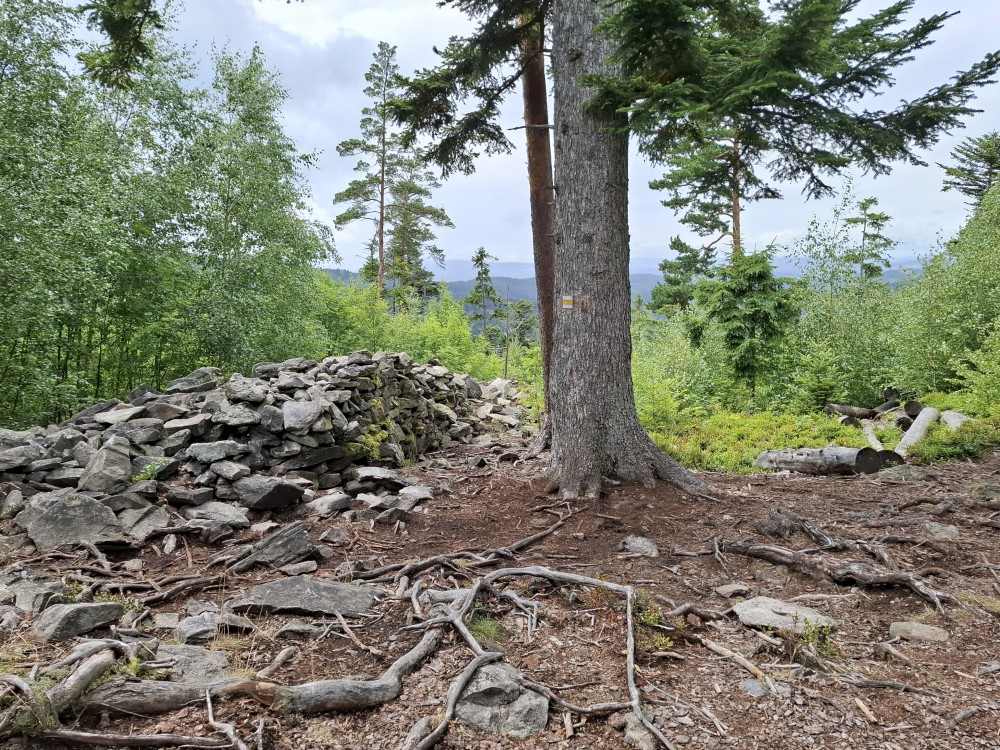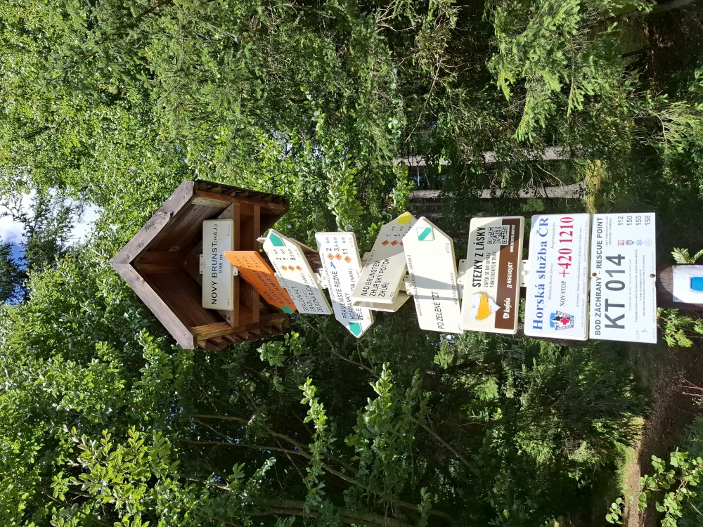 Pokračujeme na bývalý Starý Burnst. Odtud musím asi kilometr po rušné silnici, ze které odbočujeme na rozcestí U obrázku. Odtud nejprve klesáme ke Křemelné a pak stoupáme pořádným kopcem na nejvyšší bod naší cesty, k rozcestí Nad Burnstem. Je to asi 1050 m.n.m.