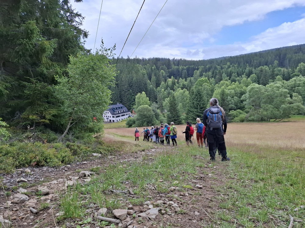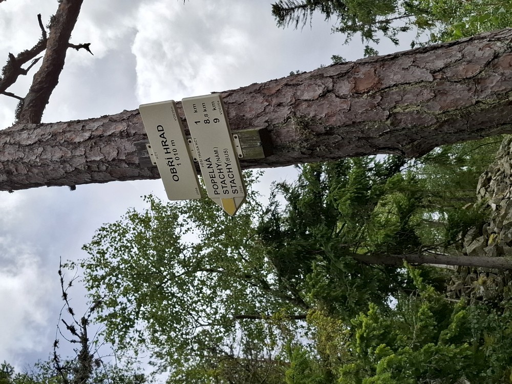 Jdeme po červené turistické značce kolem bývalého Klostermannova mlýna až na Popelnou. Odtud pokračujeme po žluté značce směr Obří hrad. Pod místním vlekem na louce si dáváme sváču. Potkáváme skupinku 17ti důchodců, kteří jdou spořádaně v zástupu.