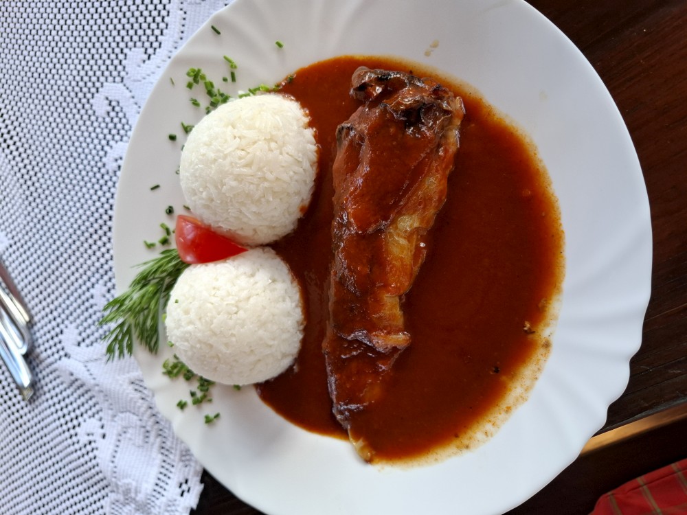 Kluci si dávají řízečky (Jiřík s Martínkem), Víťa knedlo vepřo zelo (špatná volba, moc mu to nejede), Jana s Bětuškou špagety a já plněnou papriku s rýží a pivo. Pak už sedáme do auta a jedeme do Jelenova.