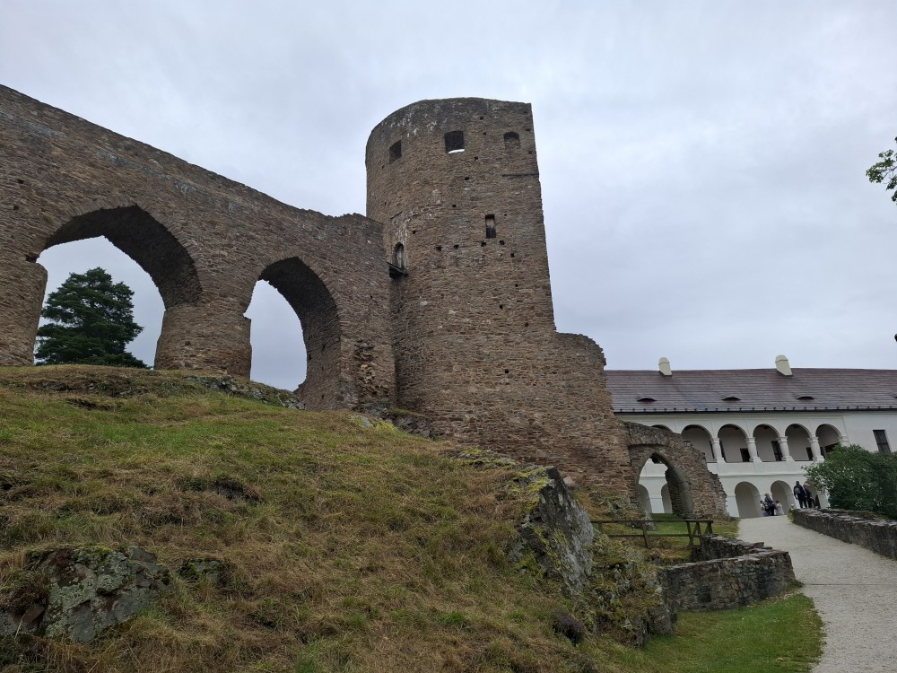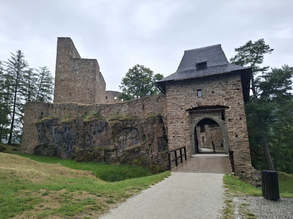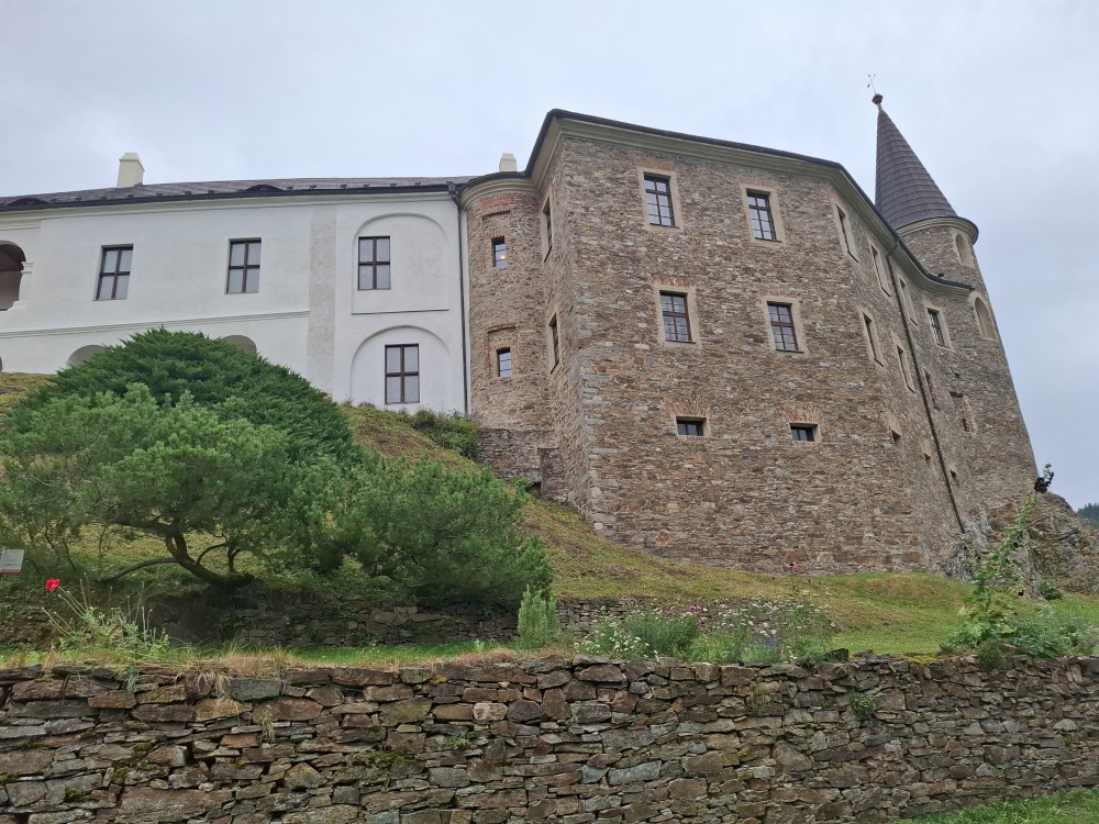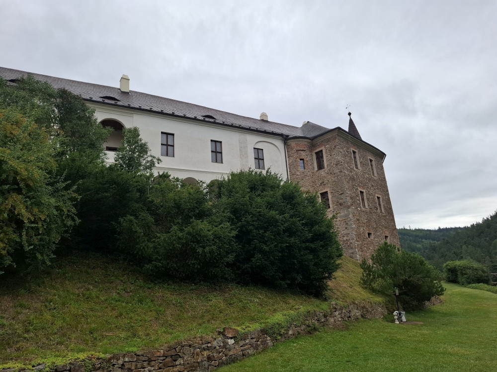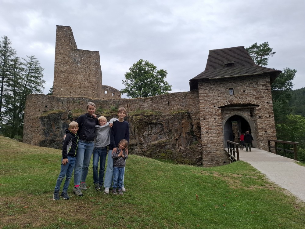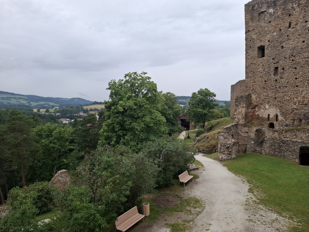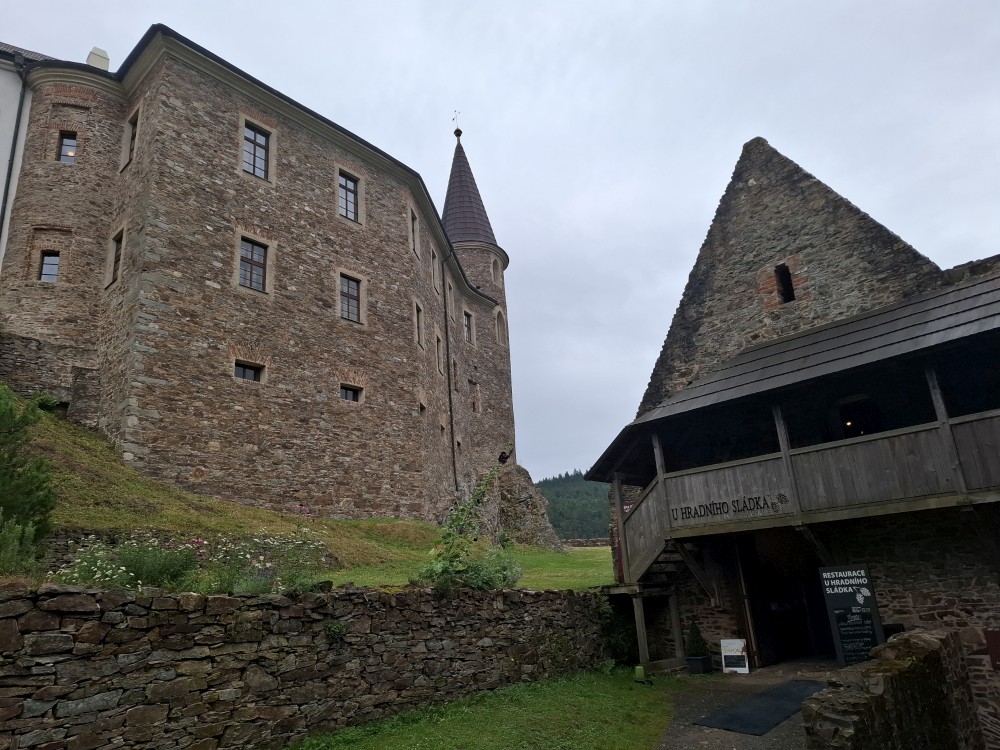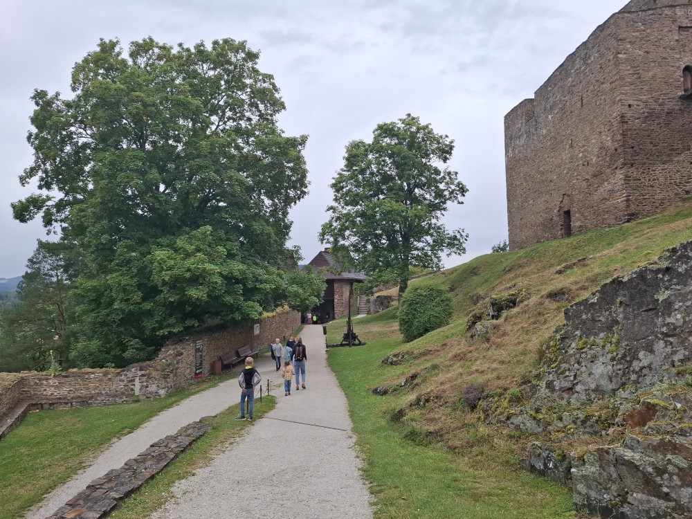Odpoledne přemýšlíme, co bychom v dešti podnikli. Voláme na zámek do Velhartic a zamlouváme si zámecký okruh na 16:00. Před třetí hodinou vyrážíme z chalupy, na hradě Velhartice jsme kolem půl čtvrté. U kasy platíme za prohlídku a jdeme na zmrzlinu a kávu do místní restaurace.