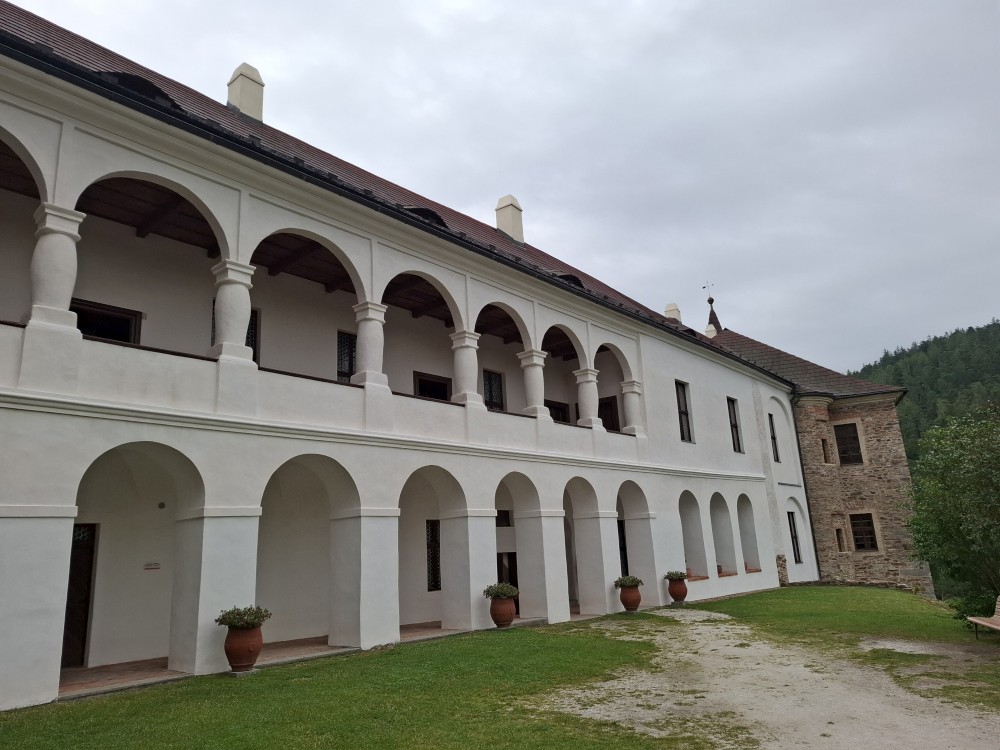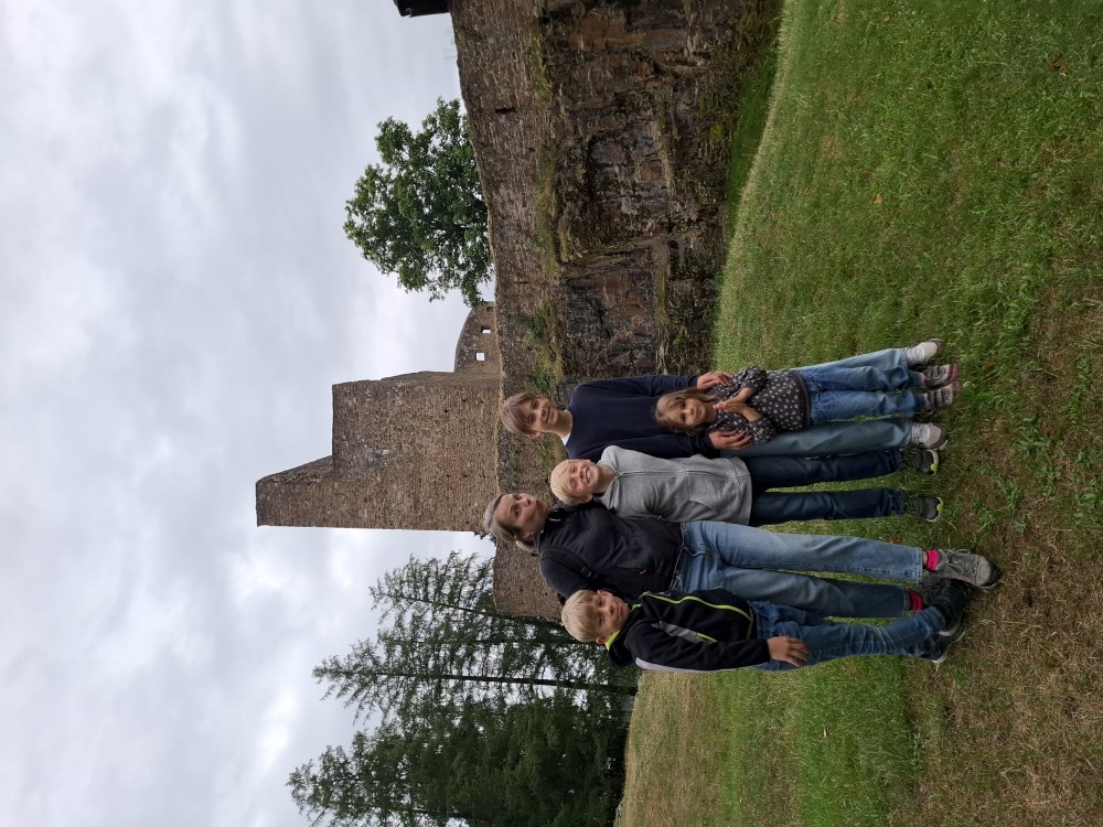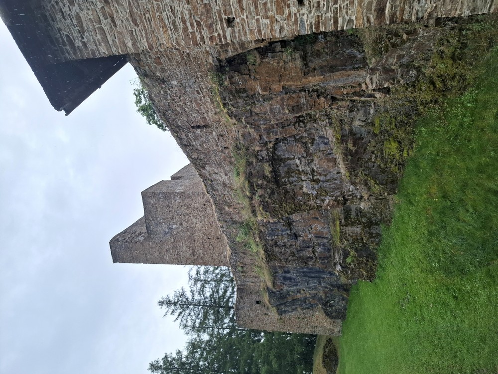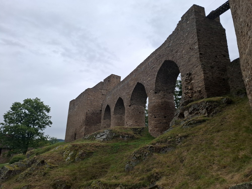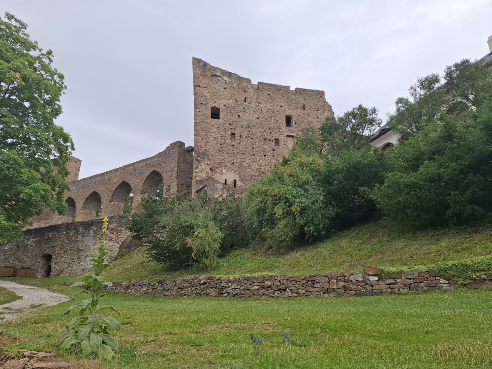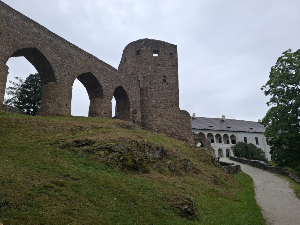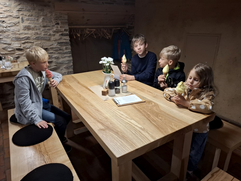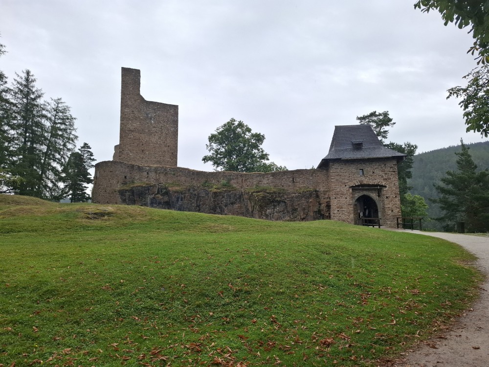 Odpoledne přemýšlíme, co bychom v dešti podnikli. Voláme na zámek do Velhartic a zamlouváme si zámecký okruh na 16:00. Před třetí hodinou vyrážíme z chalupy, na hradě Velhartice jsme kolem půl čtvrté. U kasy platíme za prohlídku a jdeme na zmrzlinu a kávu do místní restaurace.