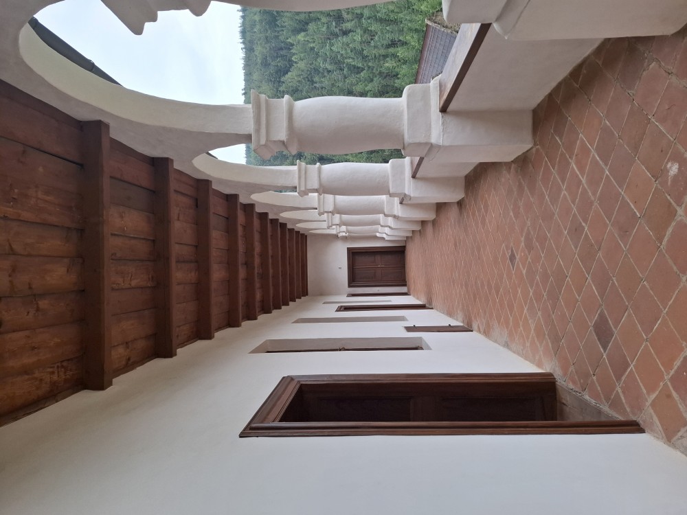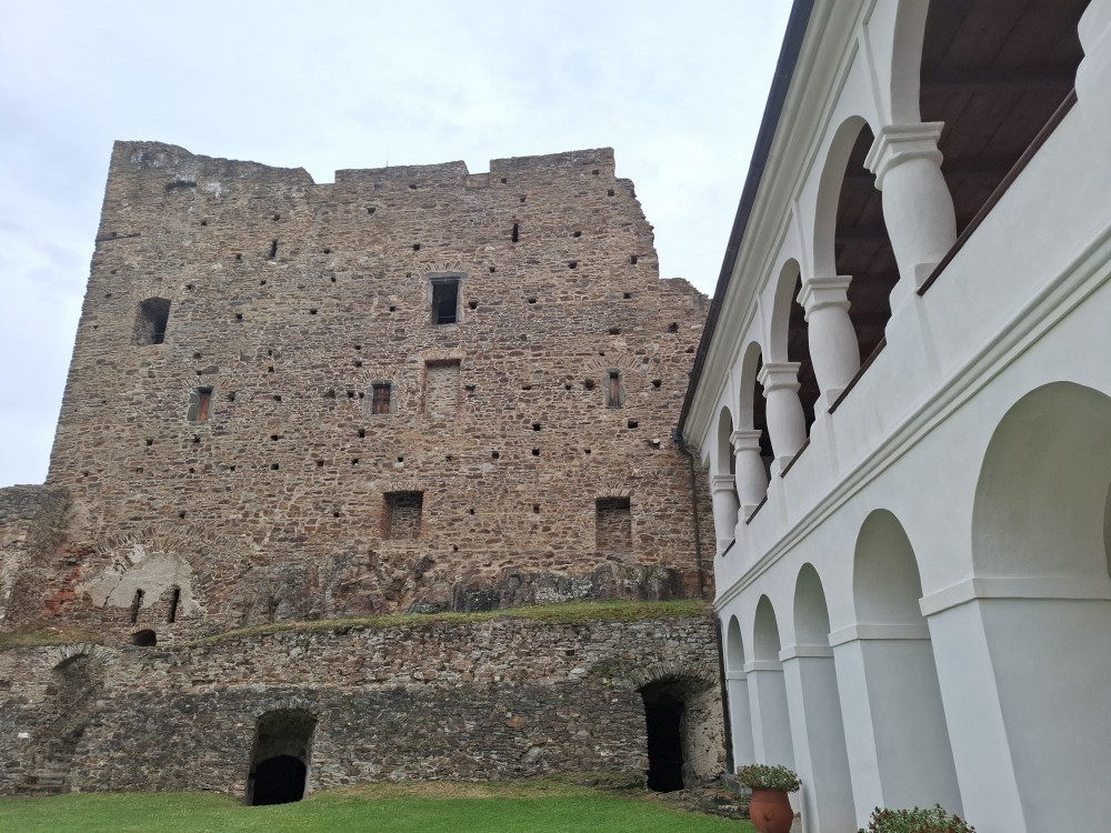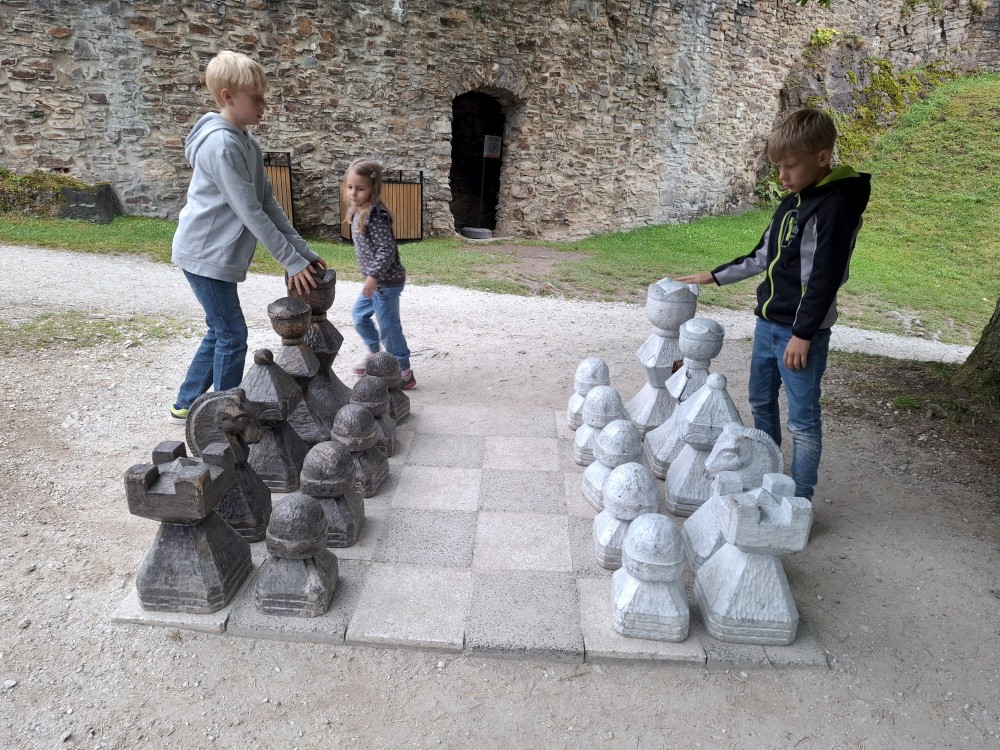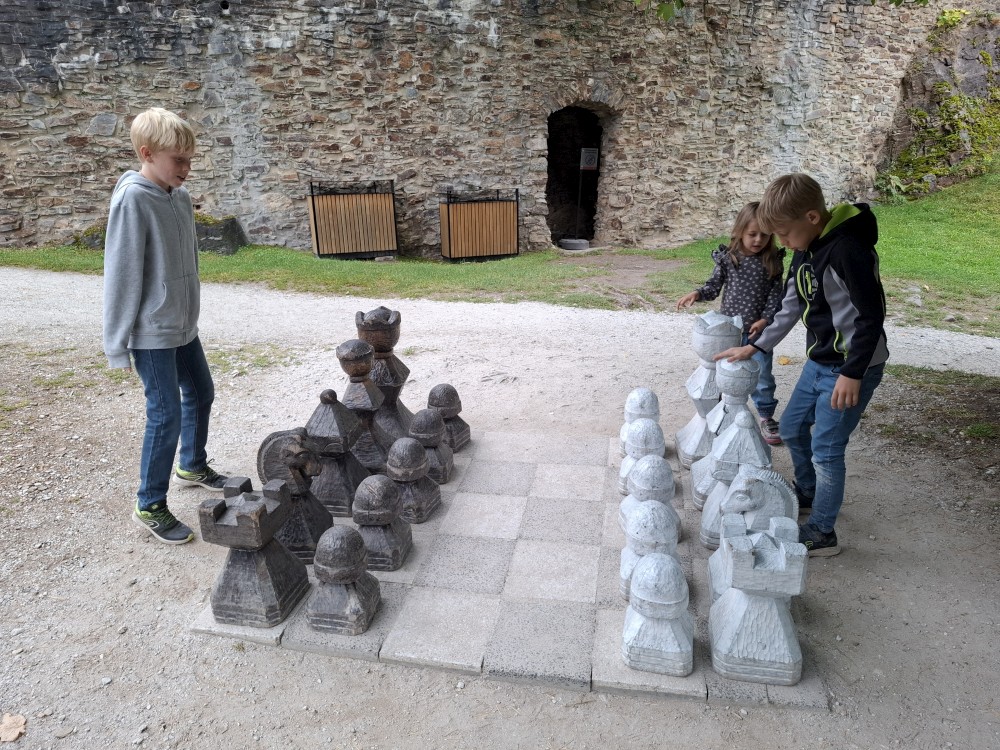 Po prohlídce jdeme hrát na nádvoří šachy 6x6. Ve hře je jen jeden kůň a střelec. Je to docela zajímavé. Docela se do toho ponoříme a hrajeme různě proti sobě asi hodinu. Dokonce nás personál hradu vyhání, že už se zavírá hradní brána.
