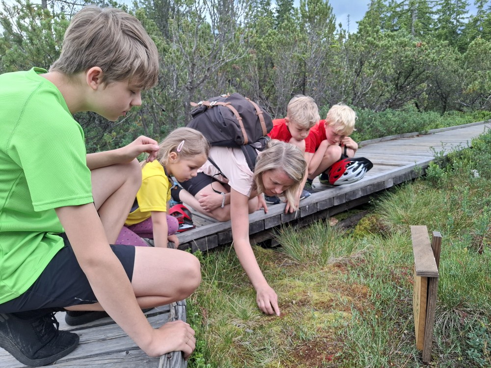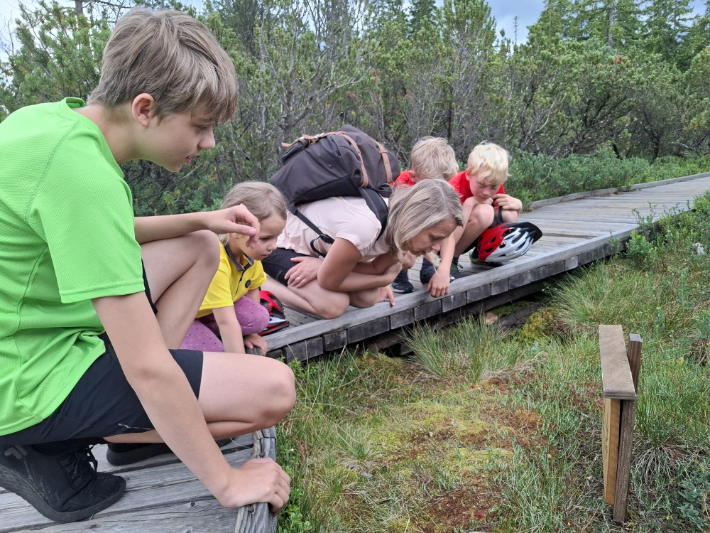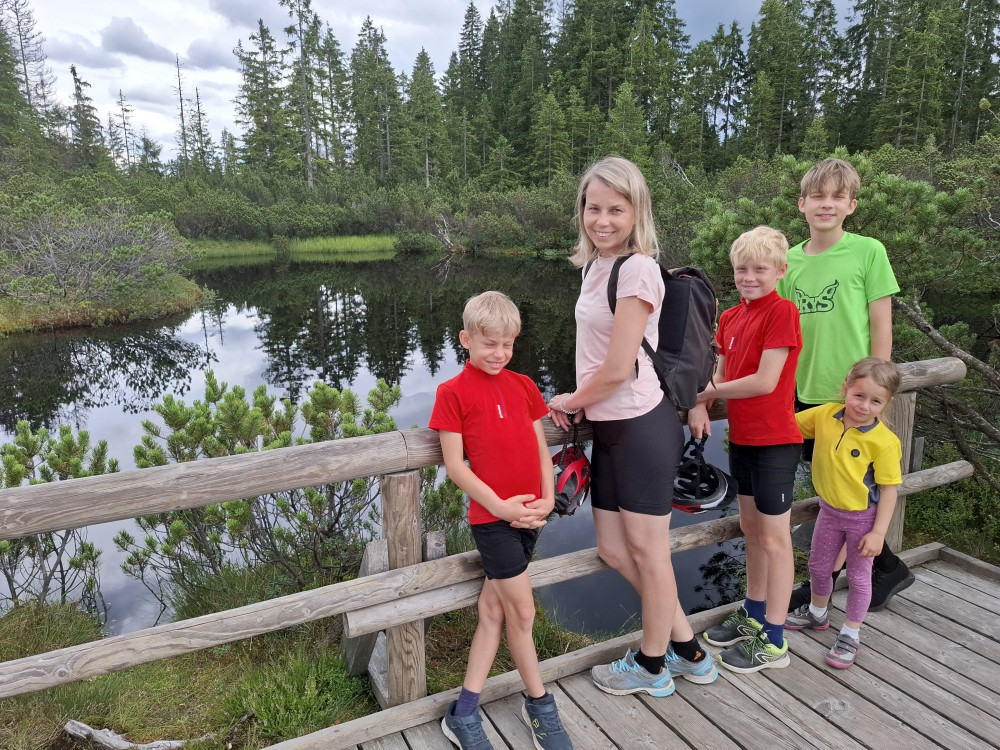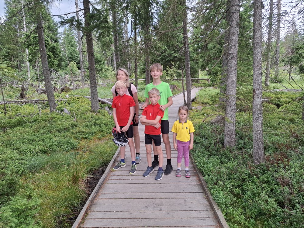 Pokračujeme na Modravu, parkujeme na místním velkém parkovišti. Sundaváme kola a vyrážíme. Jedeme na Tříjezerní slať. Od Rybárny jedeme do hodně prudkého kopce. Bětuška to statečně vytlačila. Po obhlídce slatě, kde pozorujeme masožravé Rosnatky, pokračujeme z kopce na Rokytu a pak kolem Vchynicko-tetovského kanálu v Hauswaldské kapli.
