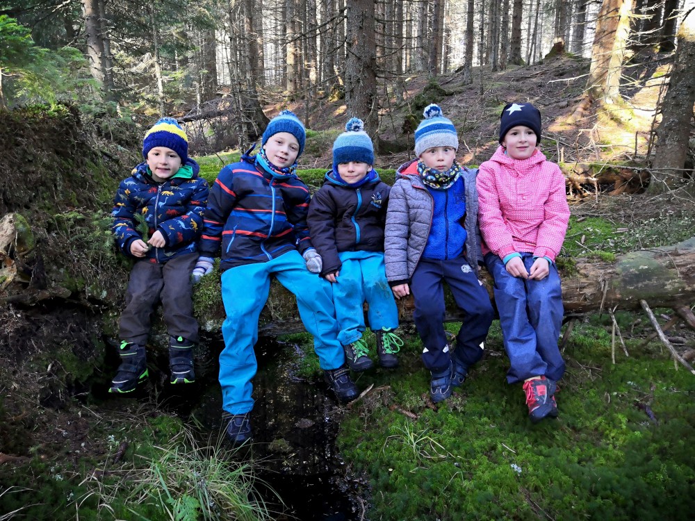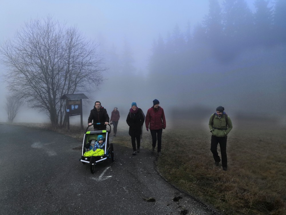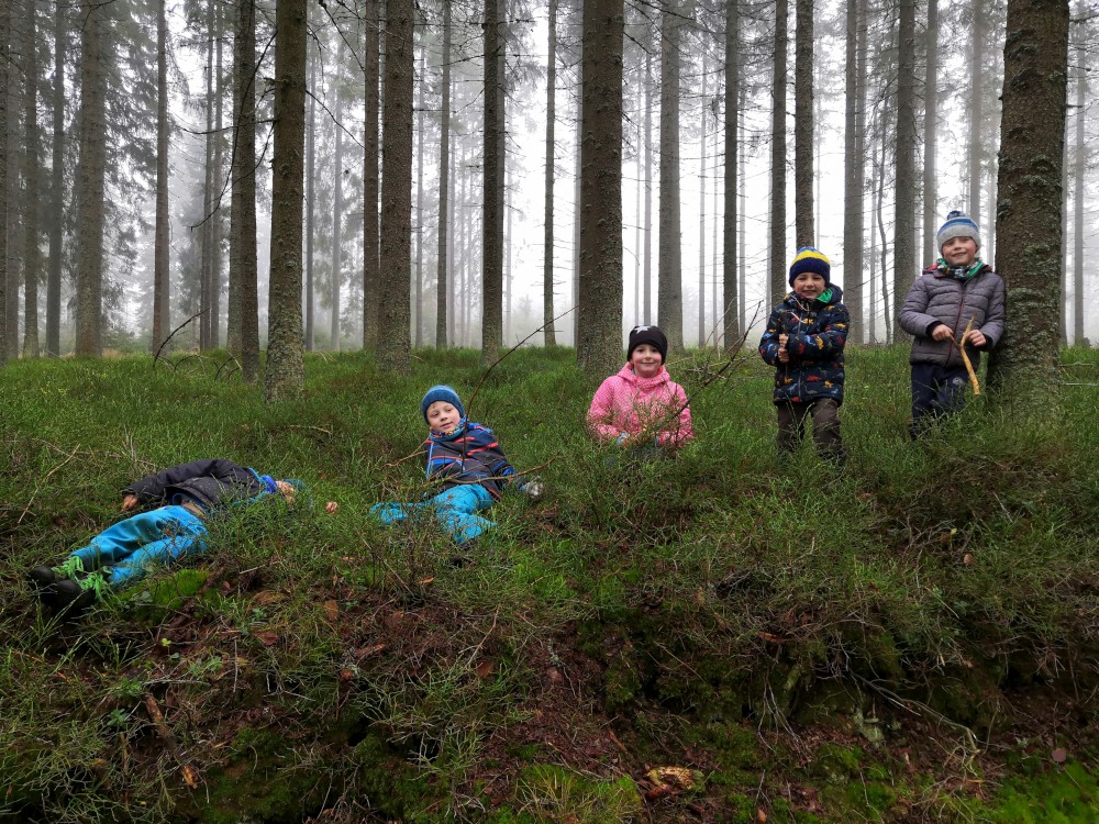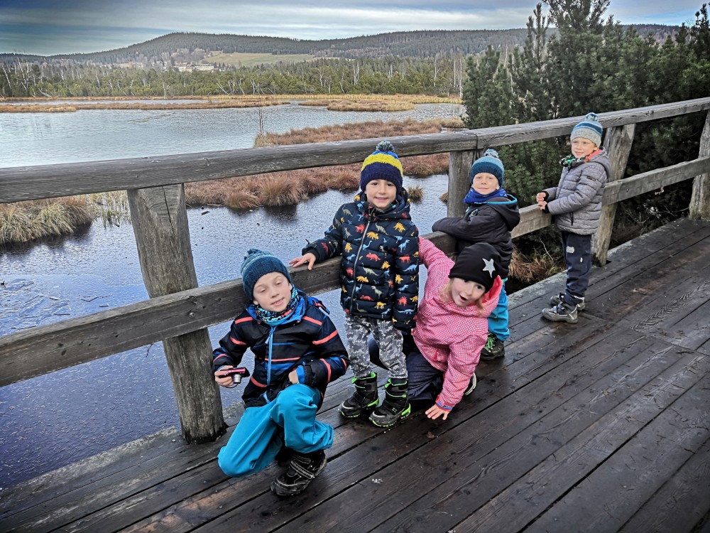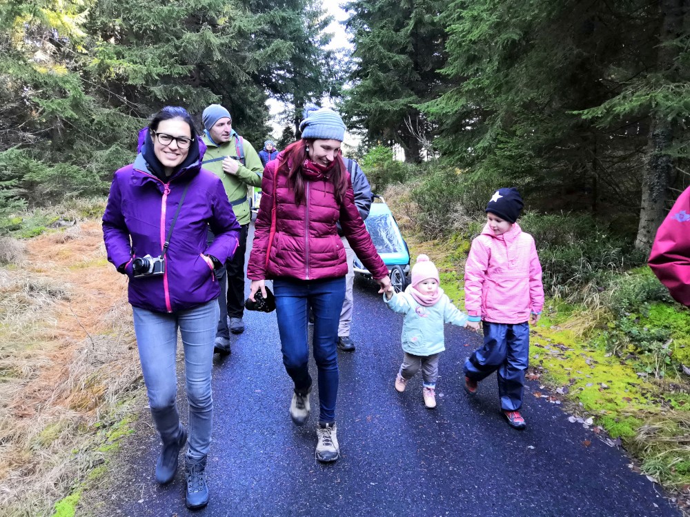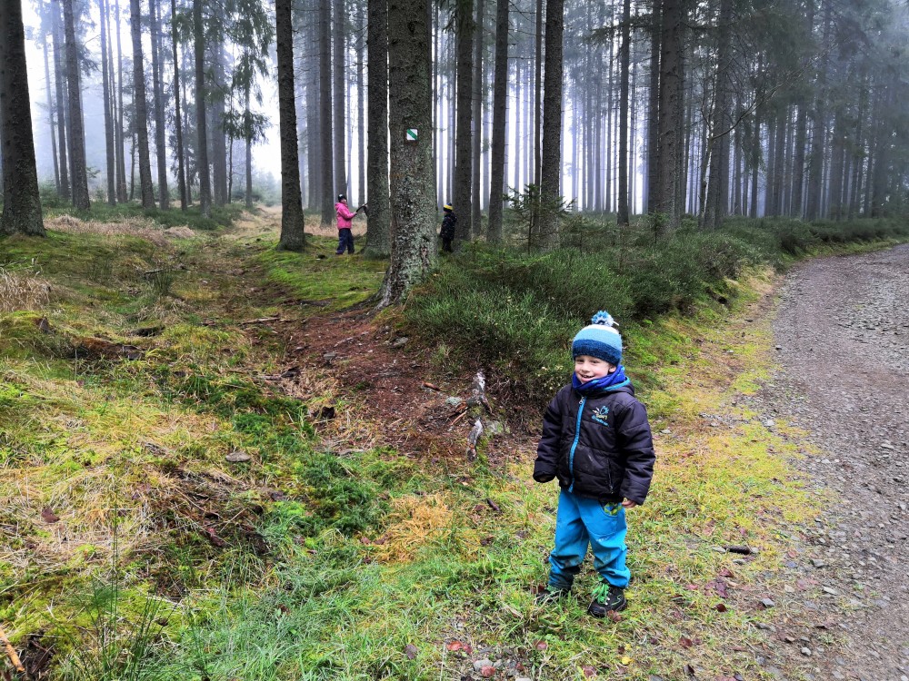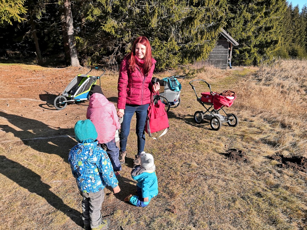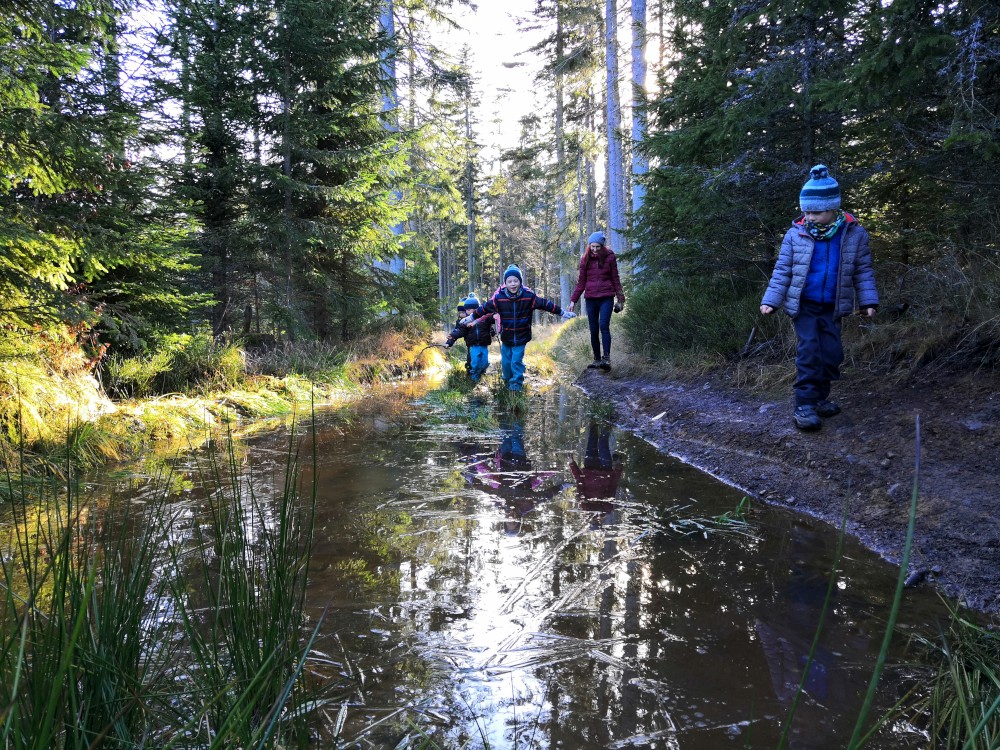 V sobotu si děti hrají u vyschlého rybníčka. Domlouváme výlet, sedáme do aut a přejíždíme na Churáňovské chalupy. Odtud vyrážíme po modré kolem Churáňovského vrchu na Zlatou studnu.