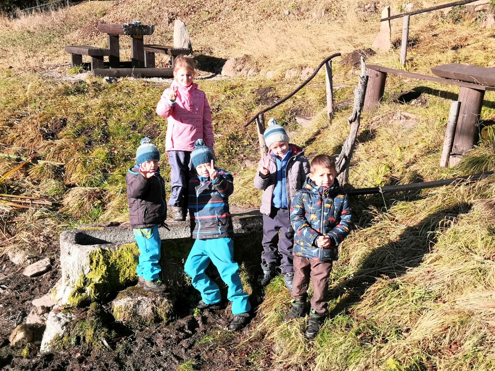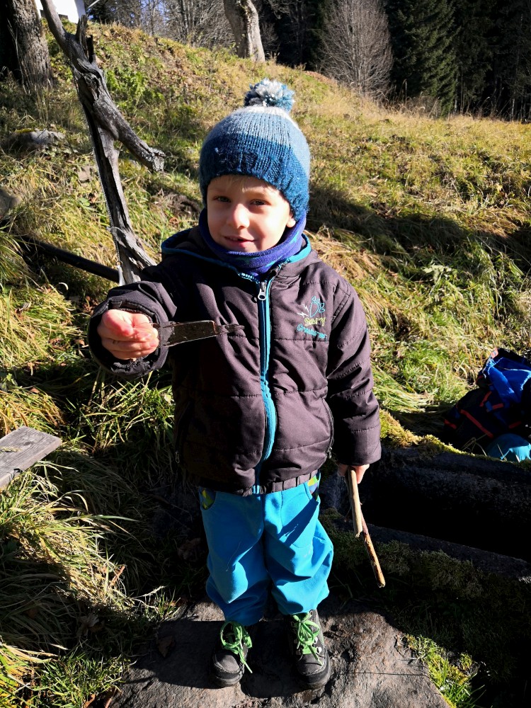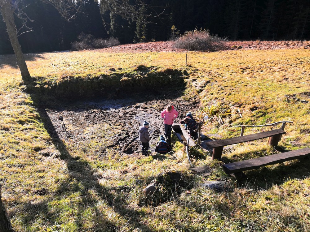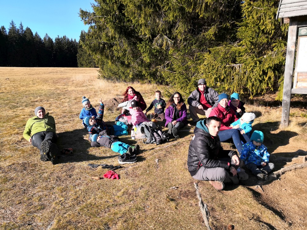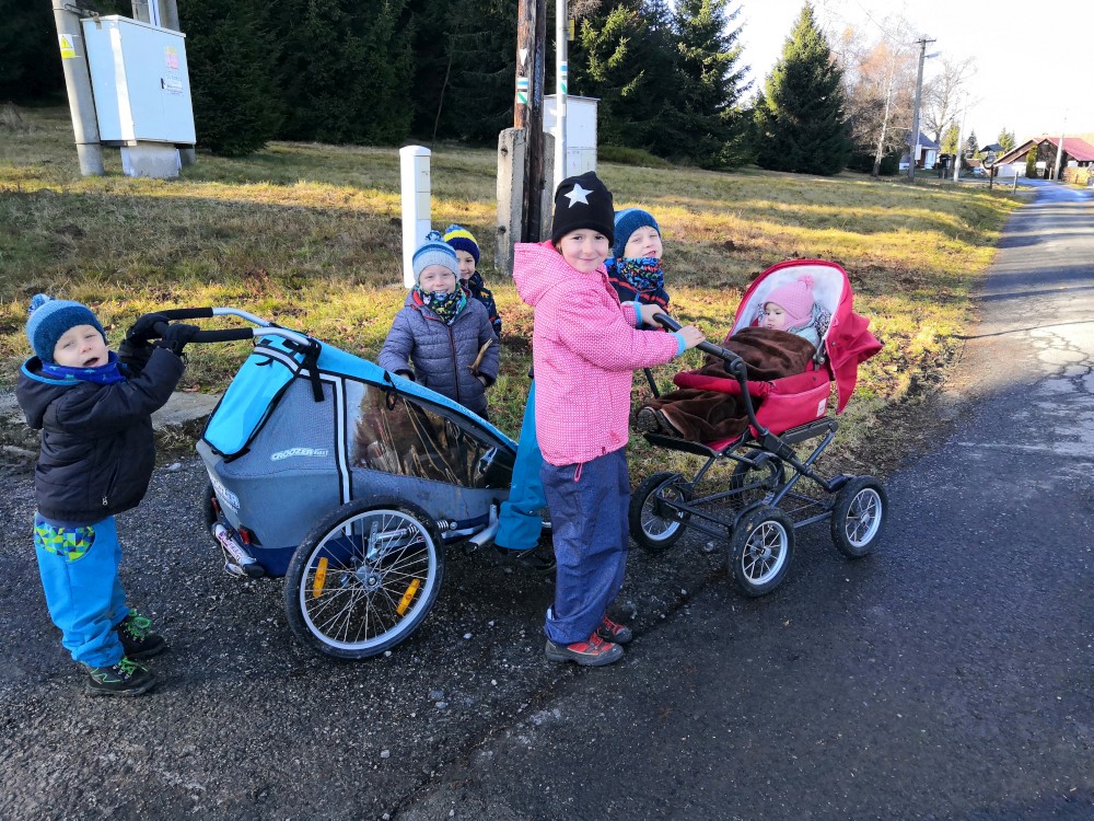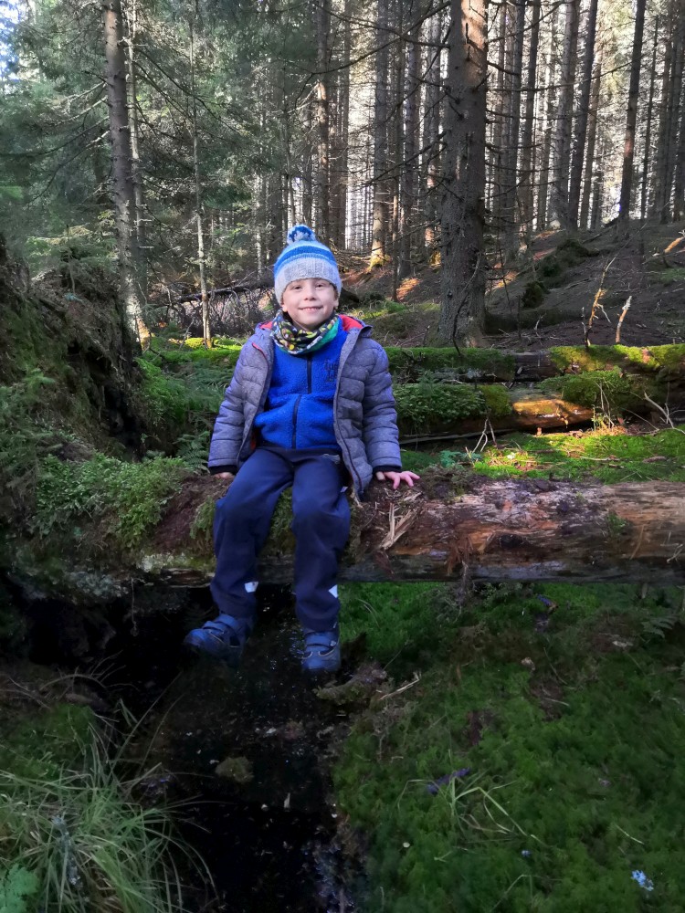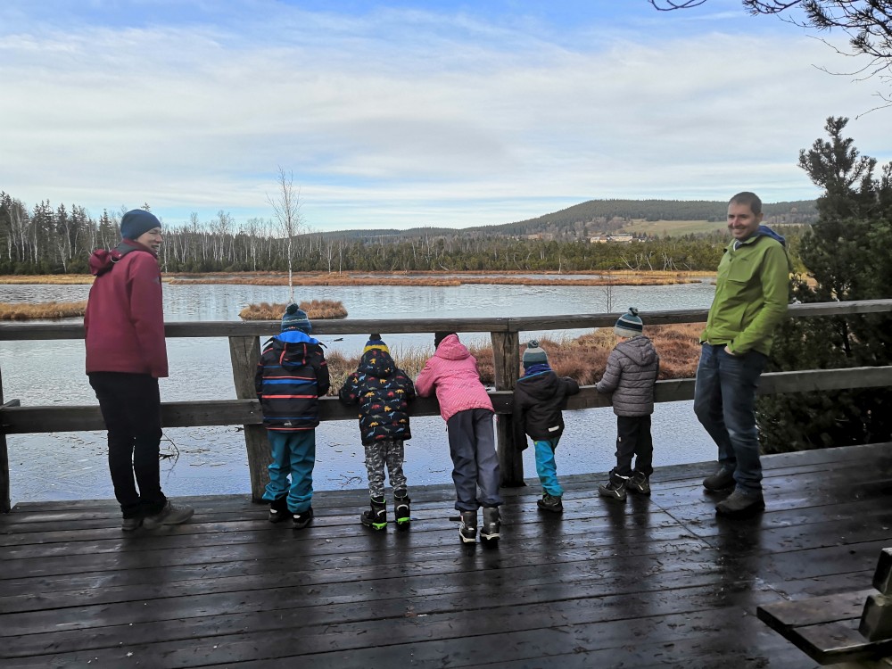 V sobotu si děti hrají u vyschlého rybníčka. Domlouváme výlet, sedáme do aut a přejíždíme na Churáňovské chalupy. Odtud vyrážíme po modré kolem Churáňovského vrchu na Zlatou studnu.
