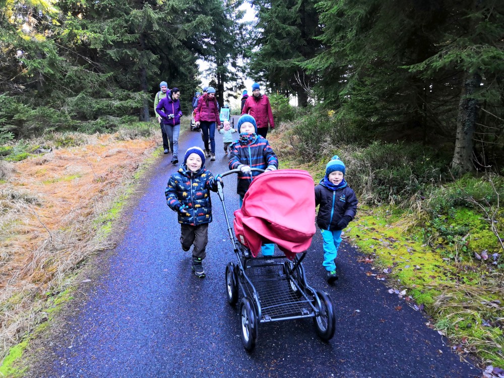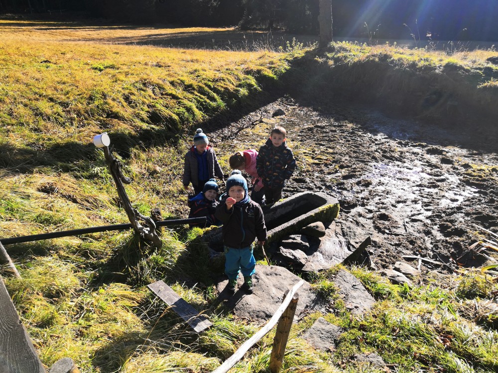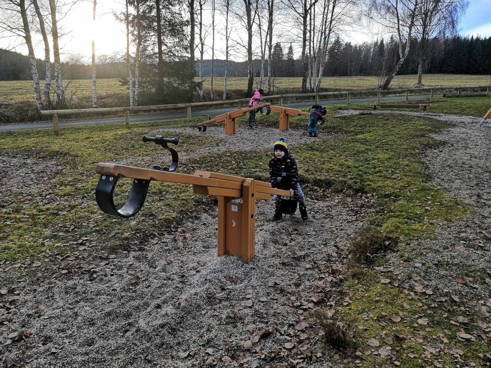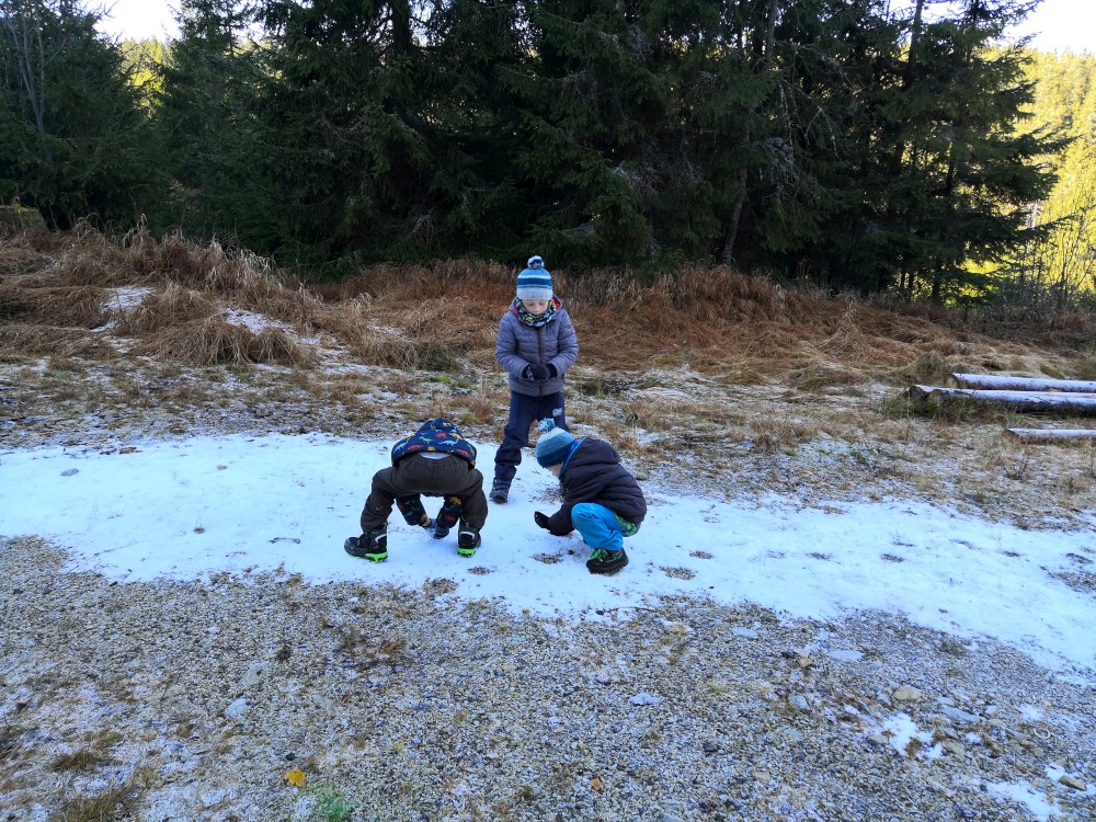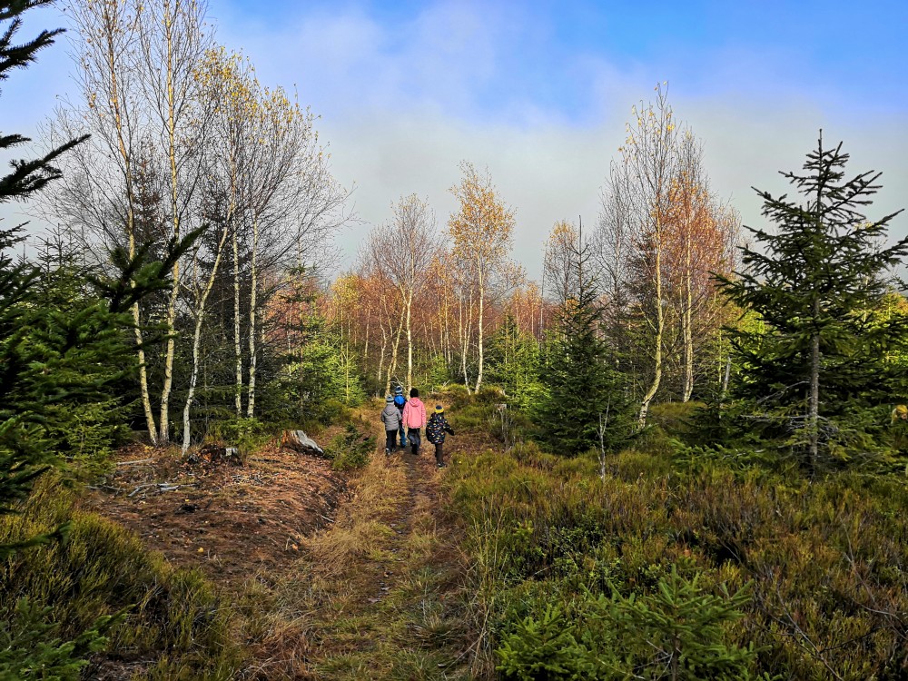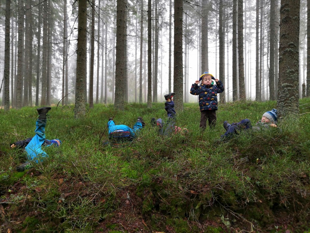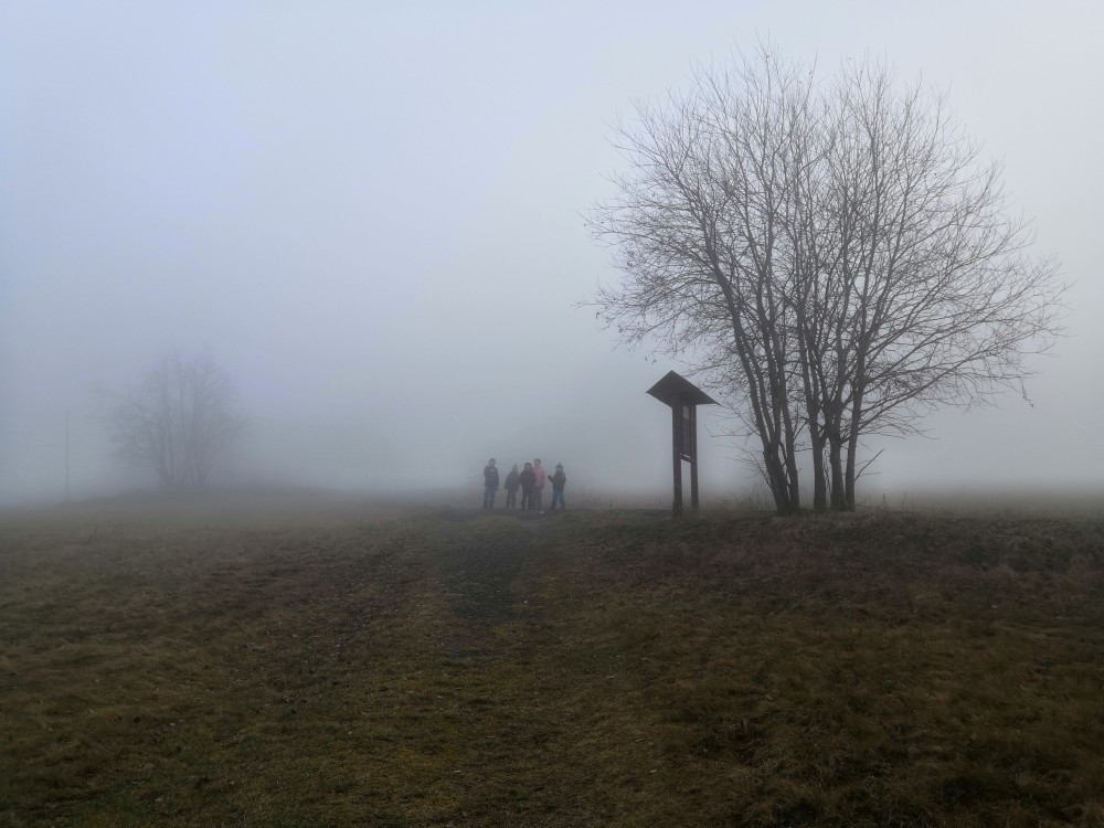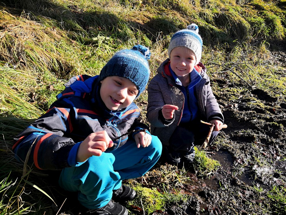 V sobotu si děti hrají u vyschlého rybníčka. Domlouváme výlet, sedáme do aut a přejíždíme na Churáňovské chalupy. Odtud vyrážíme po modré kolem Churáňovského vrchu na Zlatou studnu.
