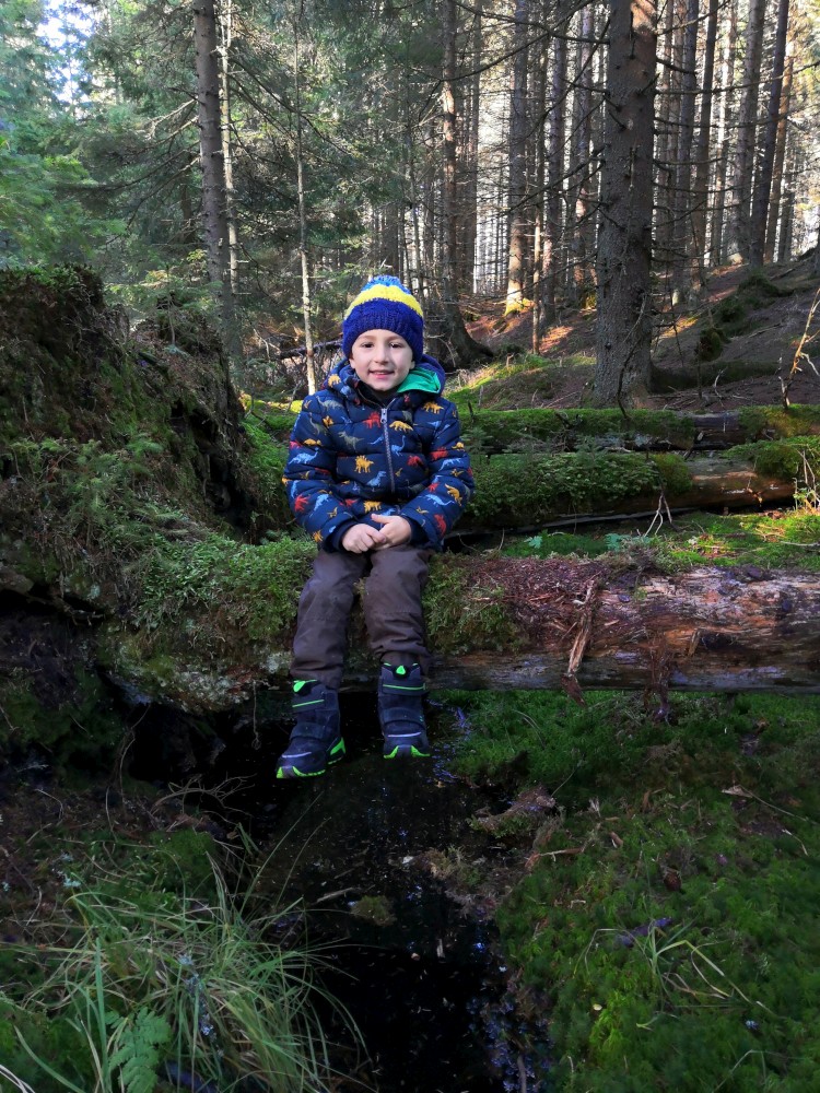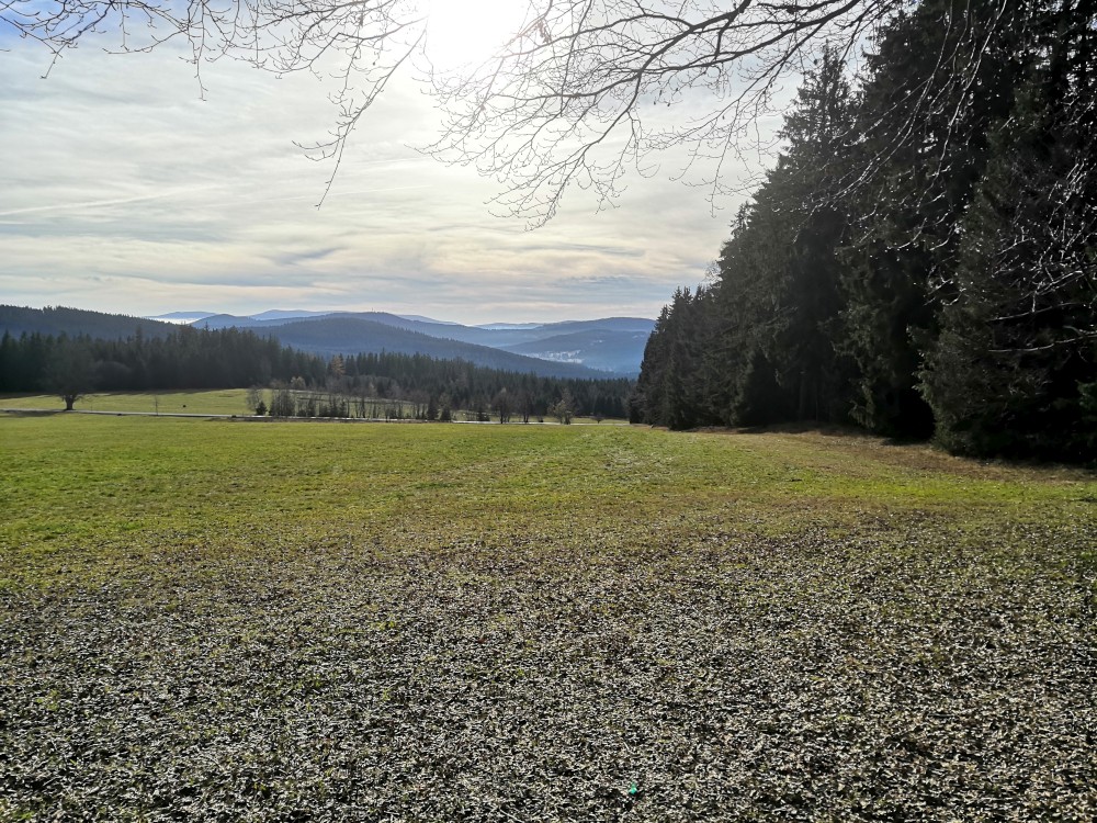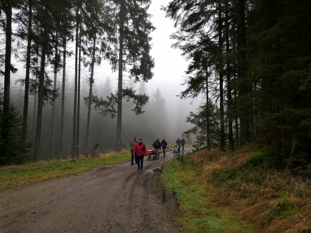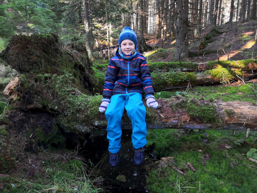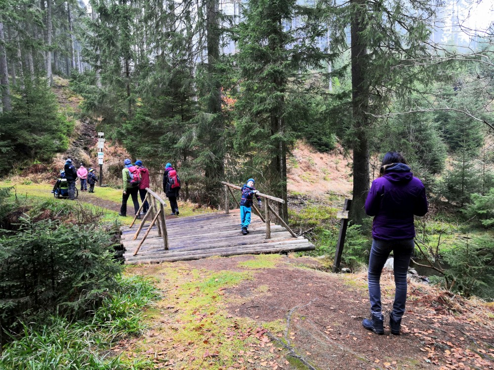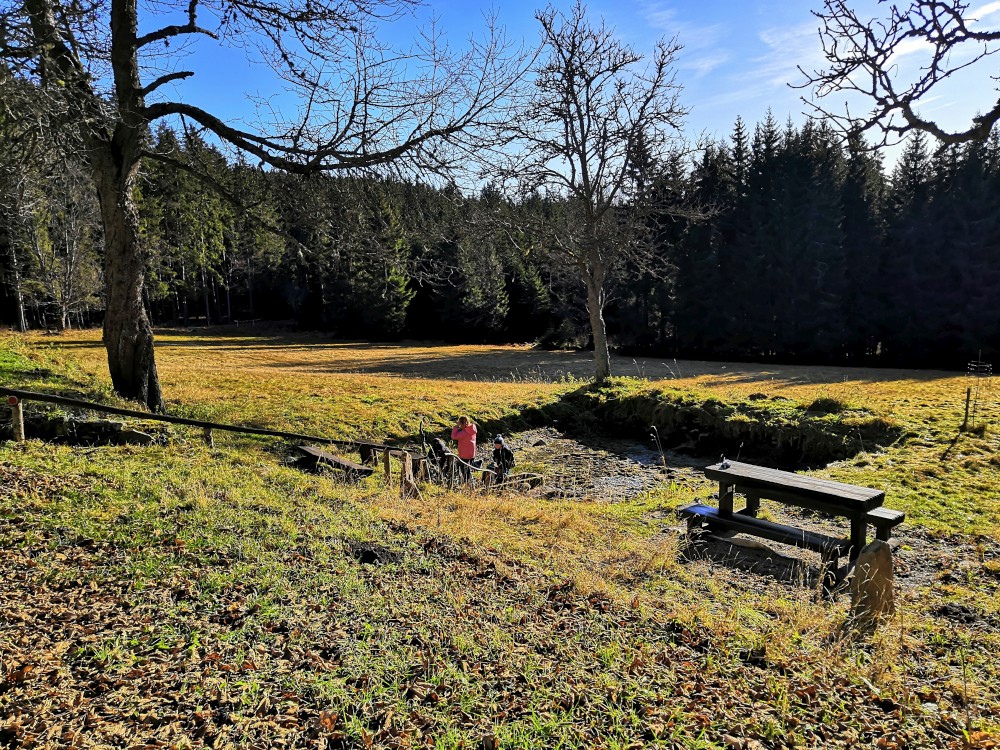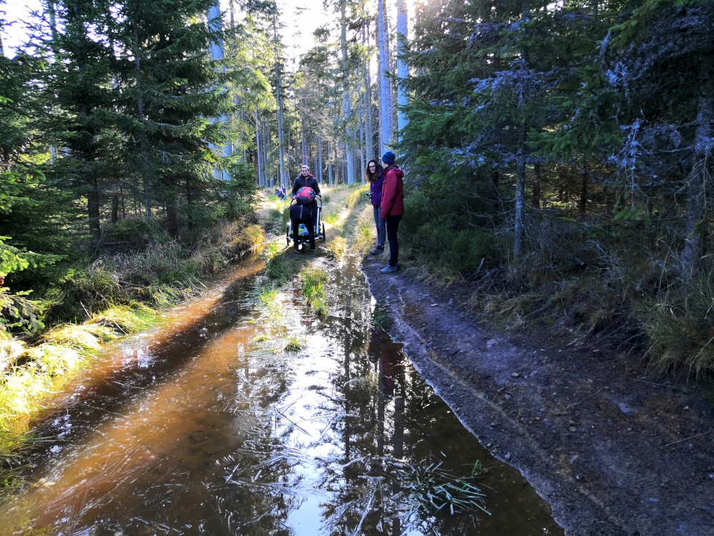 Zlatá studna je krásně prosluněna, obědváme, relaxujeme. Pak pokračujeme po červené na bývalou samotu U Matesa s pozůstatky sklářské hutě a odtud stále po červené k Novému mostu. Odtud to stáčíme po naučné stezce zpět na Churáňov.