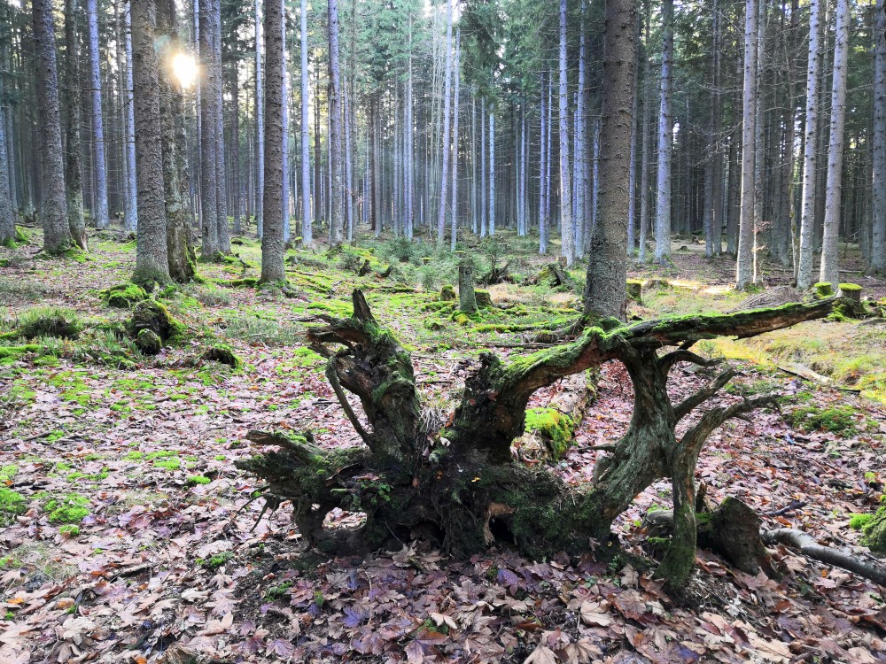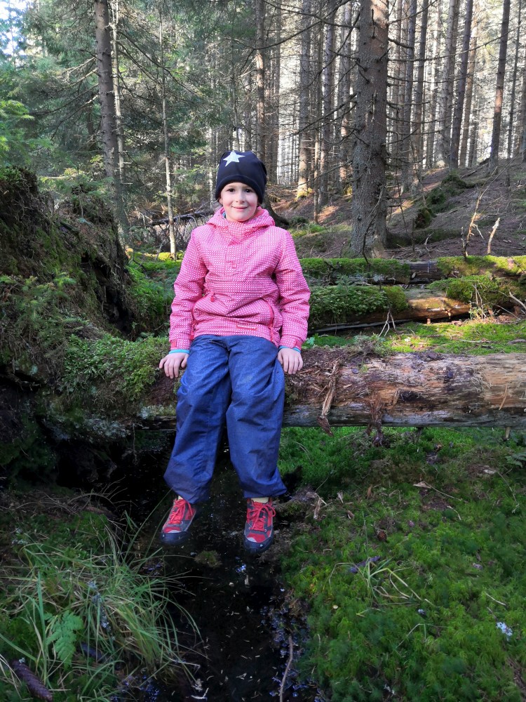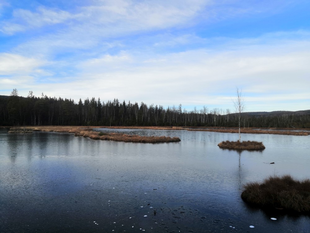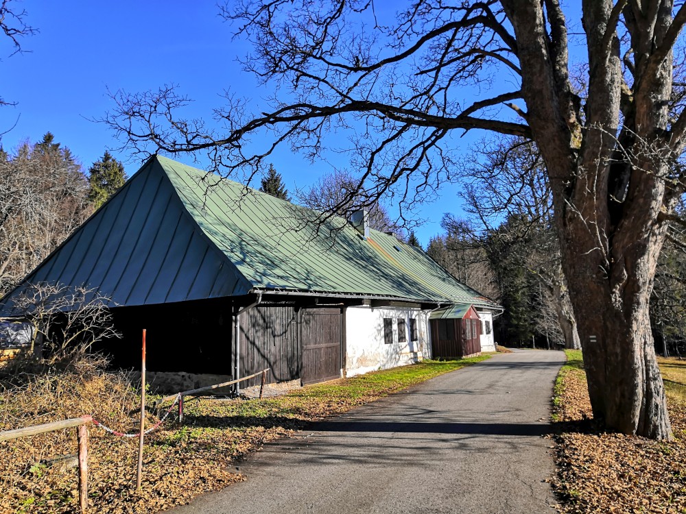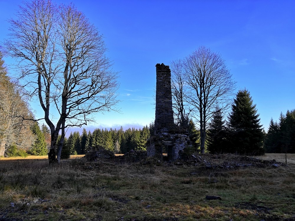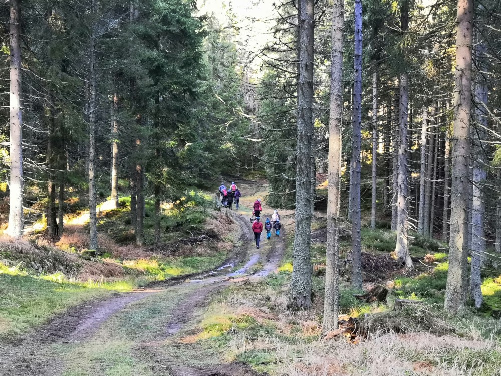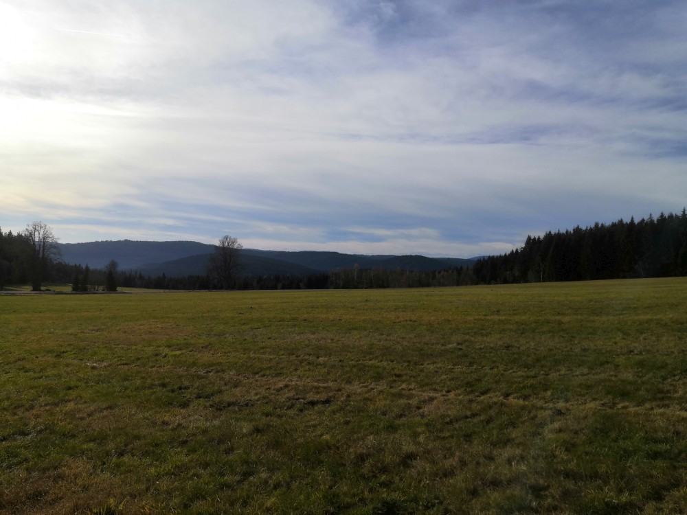 Zlatá studna je krásně prosluněna, obědváme, relaxujeme. Pak pokračujeme po červené na bývalou samotu U Matesa s pozůstatky sklářské hutě a odtud stále po červené k Novému mostu. Odtud to stáčíme po naučné stezce zpět na Churáňov.