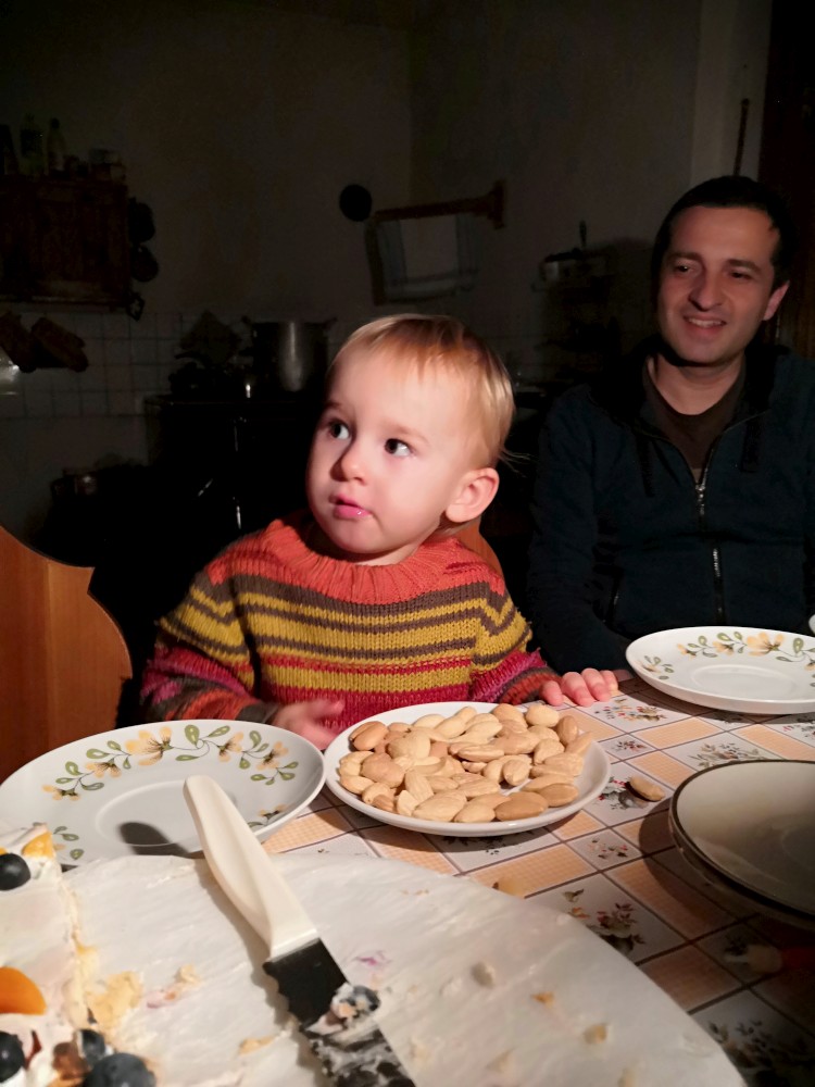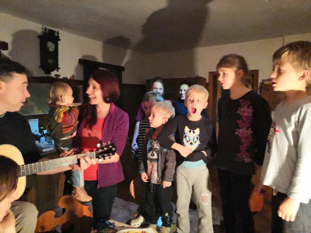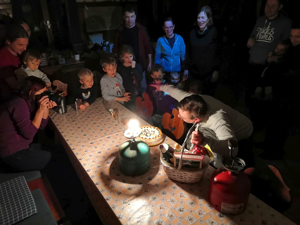 Večer slavíme Jirky narozeniny. Jirka dostává dort. Petr hraje na kytaru dětské písničky, děti zpívají. Poté mají děti večerku a my pokračujeme večírkem.