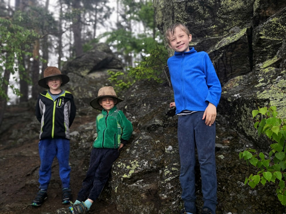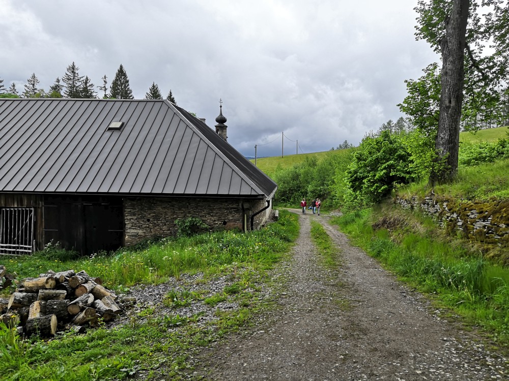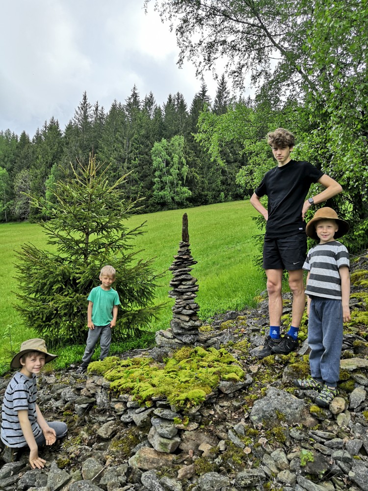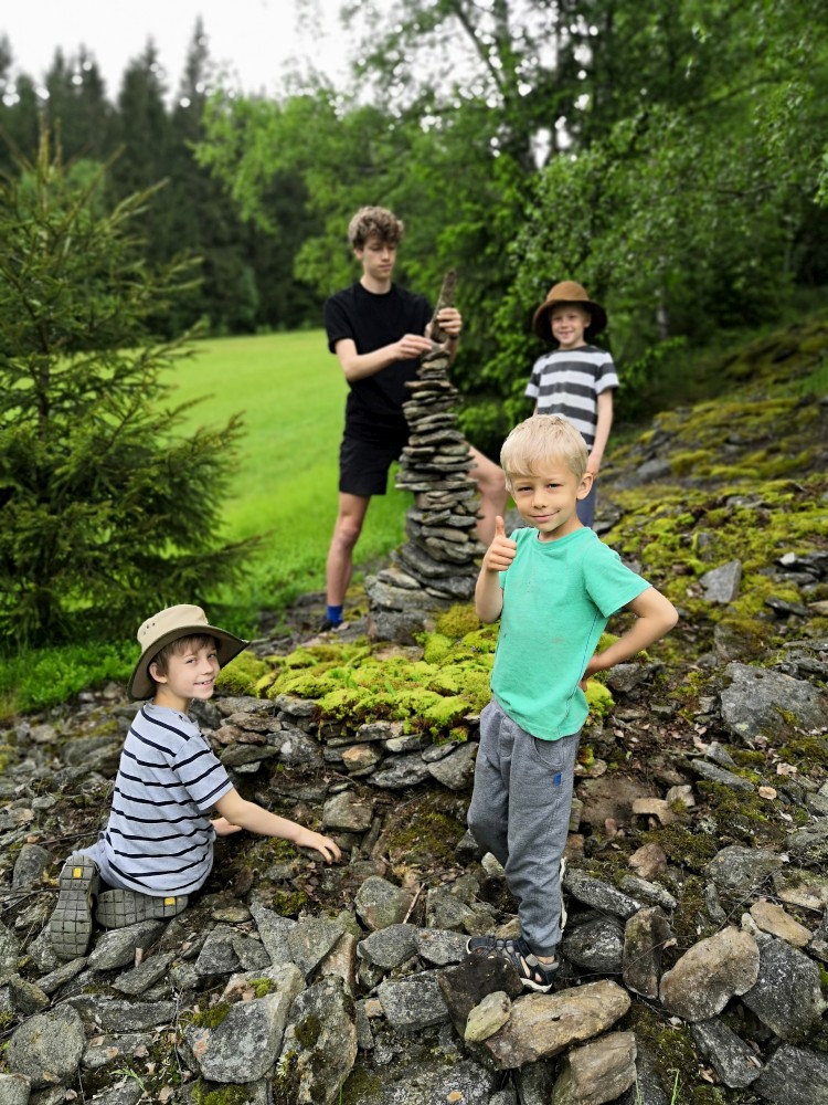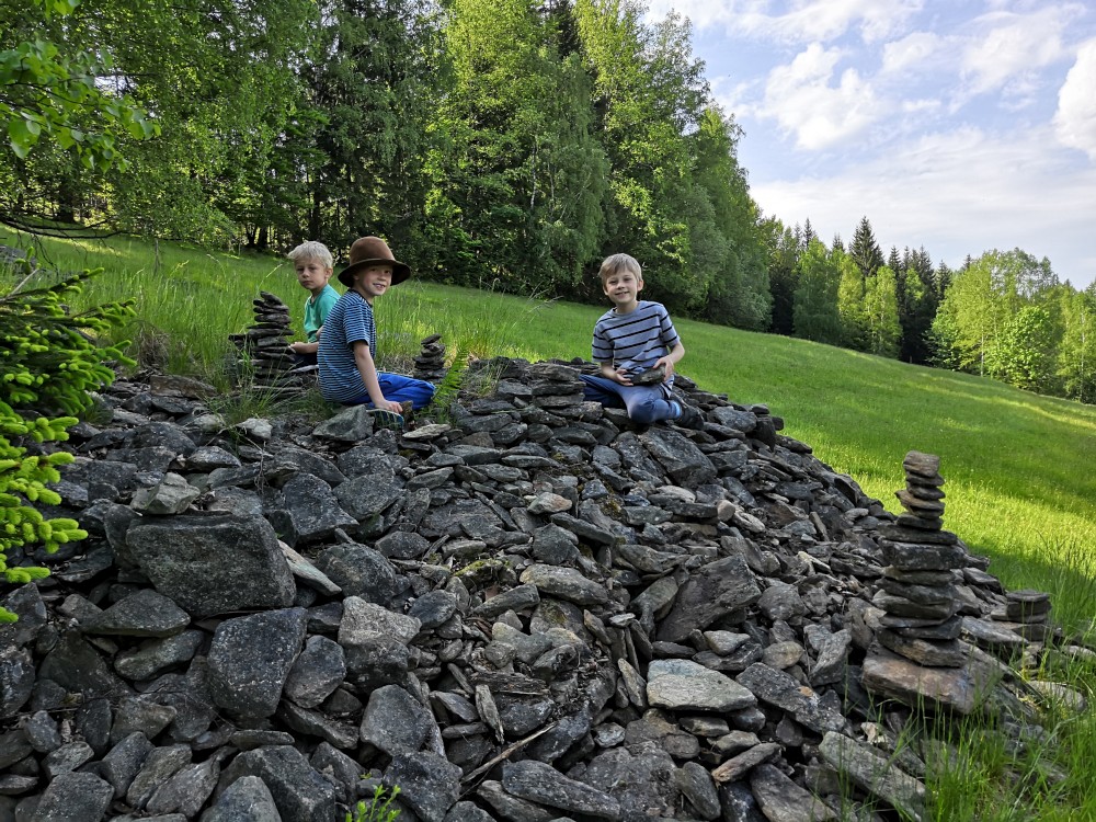 V neděli jdeme na procházku kolem sousedních chalup směr jih. Kluci zase staví mužíky na kamenném poli. Dáváme si na chalupě oběd, balíme se, uklízíme chalupu a jedeme do Tábora.