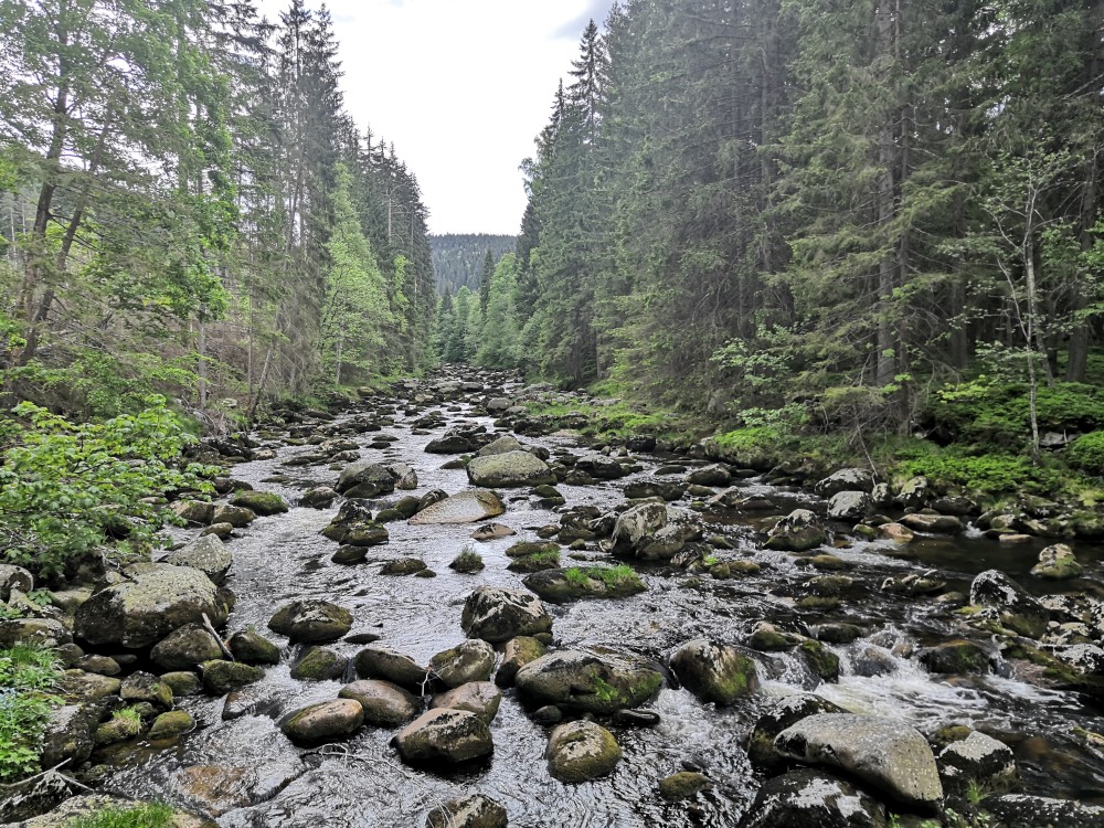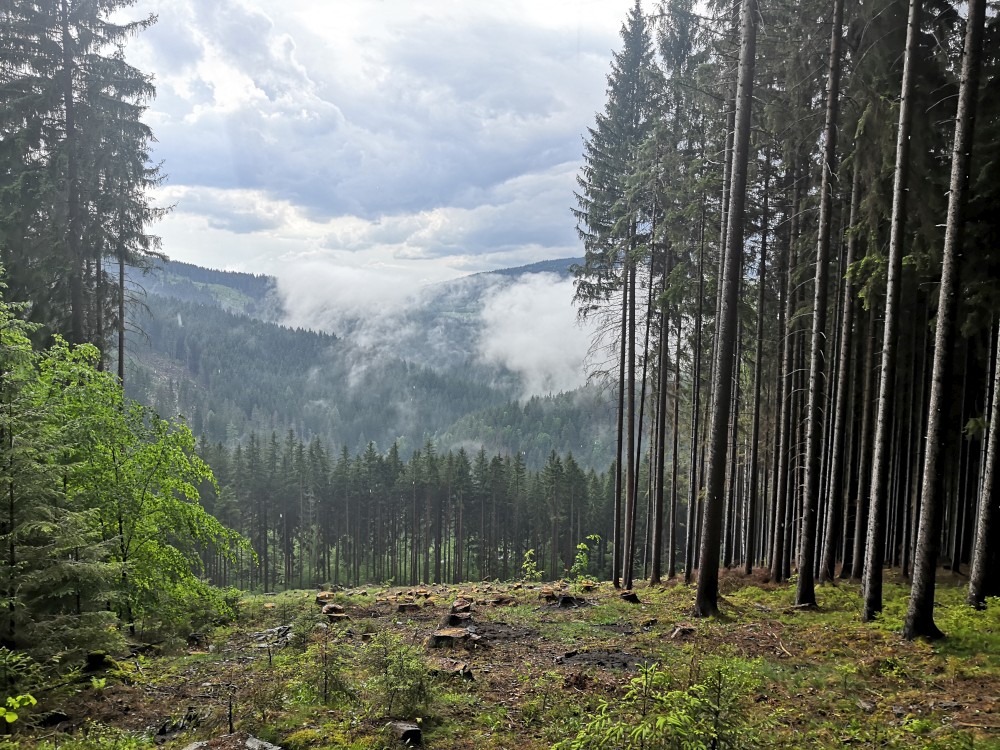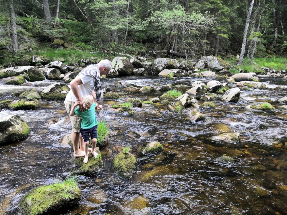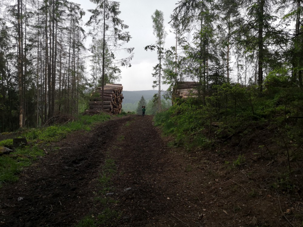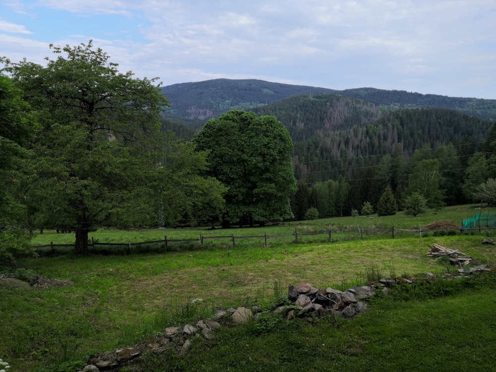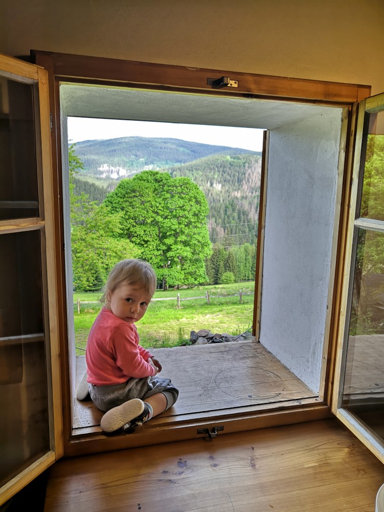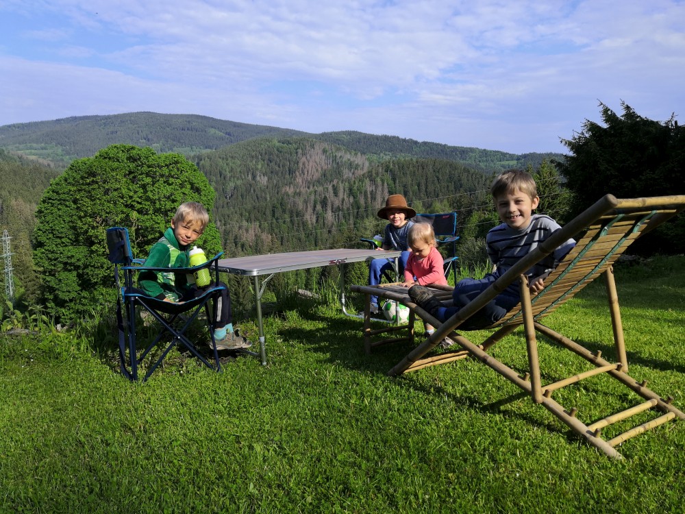 Ráno jdeme po snídani na výlet. Jdeme na jih po lesní cestě. Stavíme si mužíky na kamenném poli a pak klesáme k Vydře. Podél Vydry jdeme k Čenkově pile. Bětuška spí v nosítku, my zastavujeme u Vydry a skáčeme po kamenech. Na Čenkově pile si dáváme občerstvení a oběd u kiosku. Také zde přečkáváme déšť.
