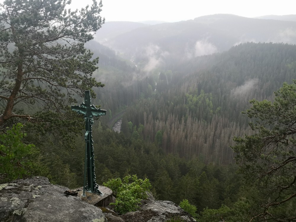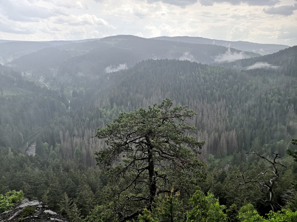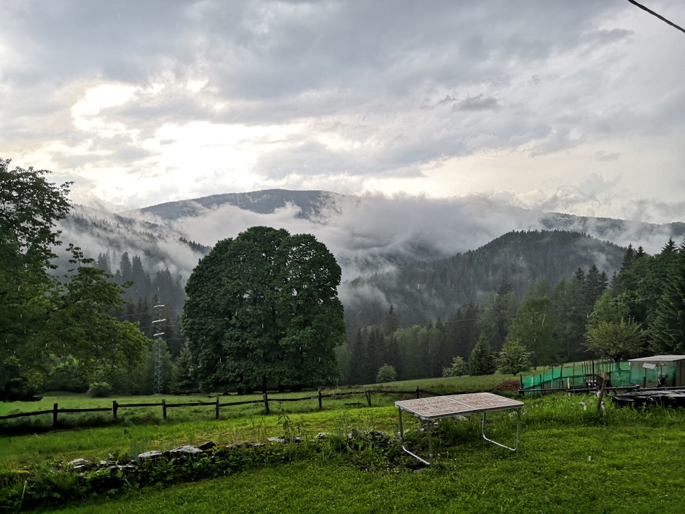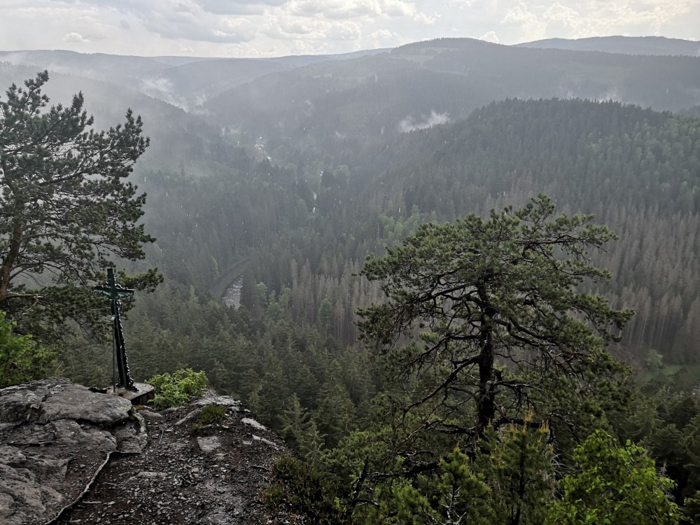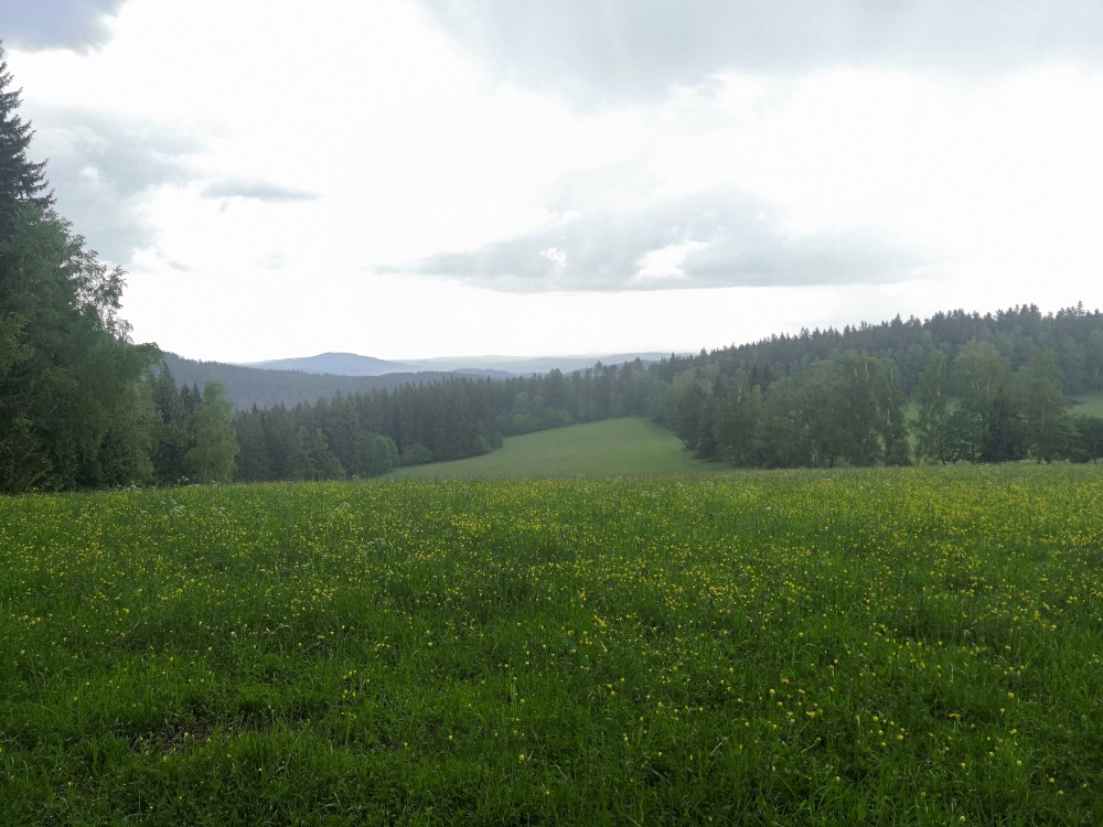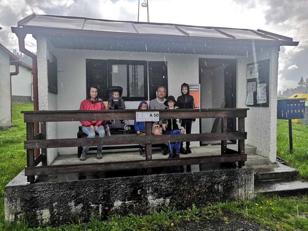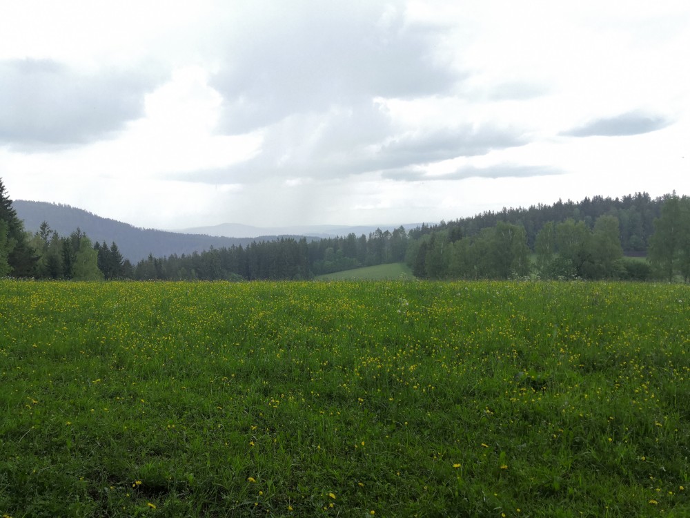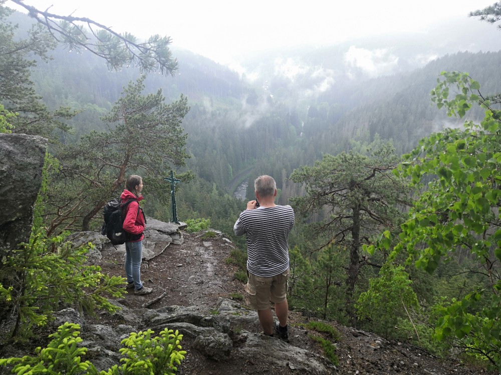 Po dešti stoupáme zpět k chalupě. Po chvilce odpočinku vyrážíme na další výlet na Dračí skály. Jdeme přes Svojše. Chvilkama prší. Na Dračích skalách je krásný výhled na údolí Otavy. Moc hezké místo. Začíná pršet čím dál tím víc. Kousek před Svojší začíná pořádný liják. Běžíme se schovat do autobusové zastávky. Poté co déšť zeslábl se vracíme na chalupu.