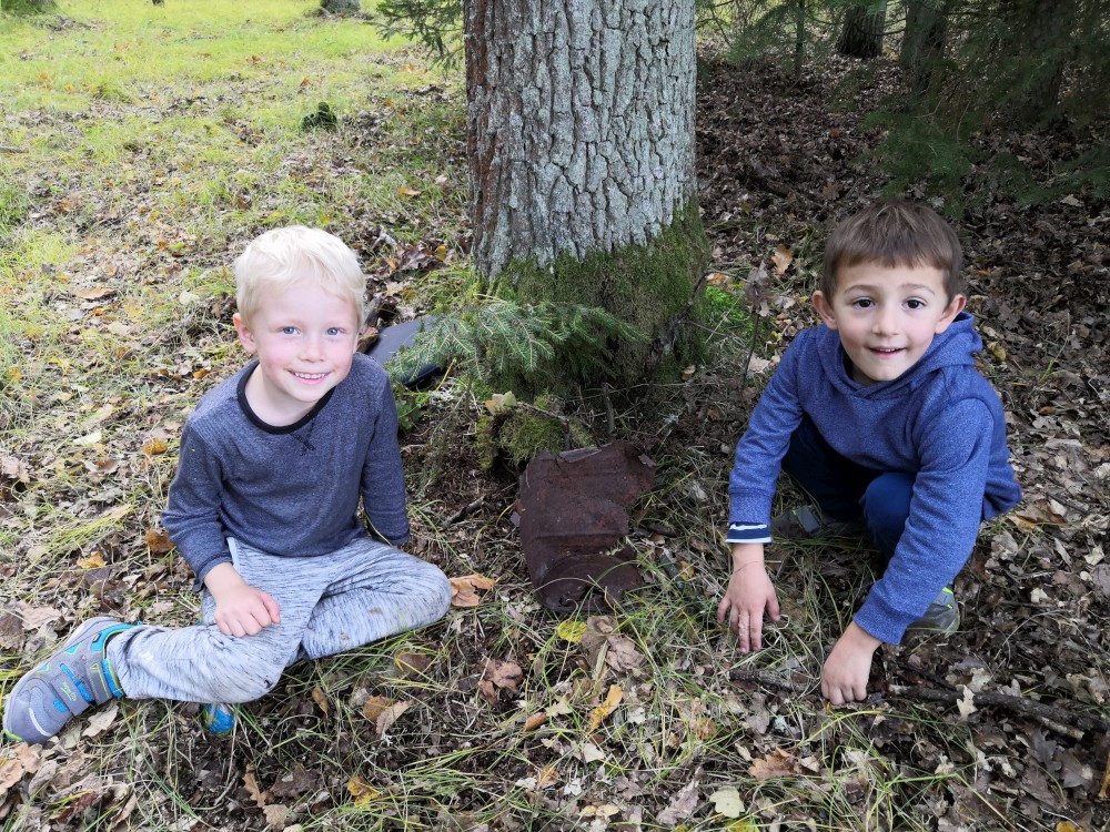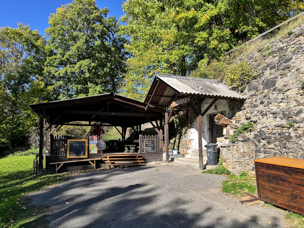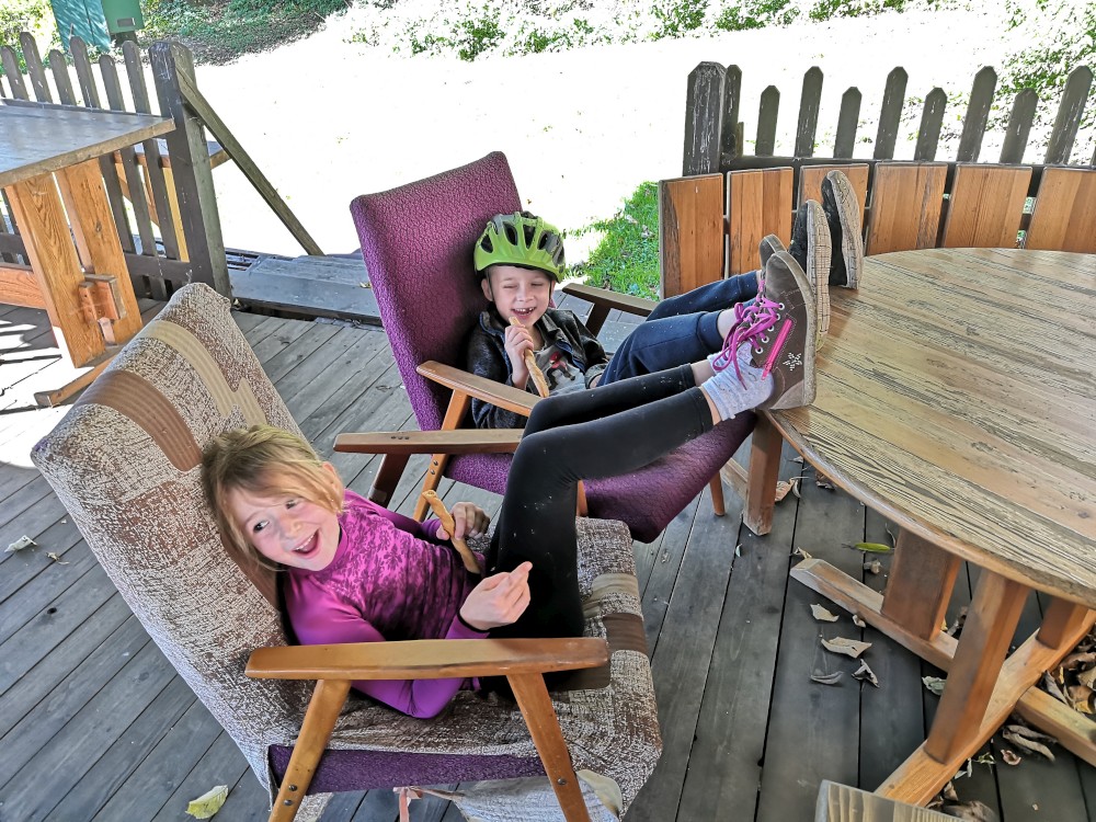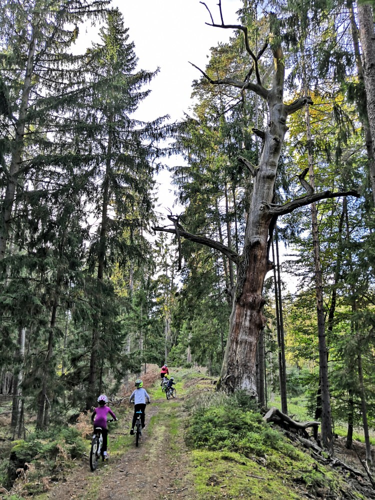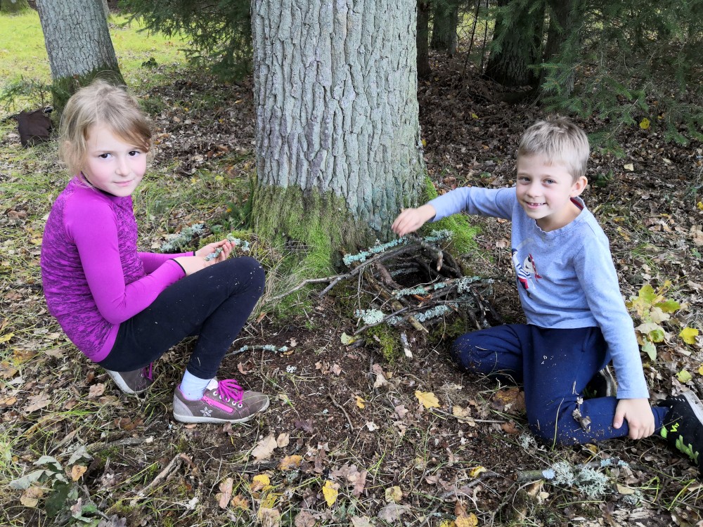 Dáváme tedy sváču a pokračujeme z Jemčiny po žluté do Evženova údolí, kde je pension s restaurací Pecák. Máme štěstí, je otevřeno, můžeme si dát oběd. Děti si staví v lese domečky. Vracíme se přes Karštejn, Metel a Val zpět do Vlkova.