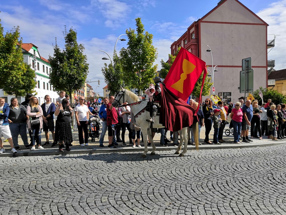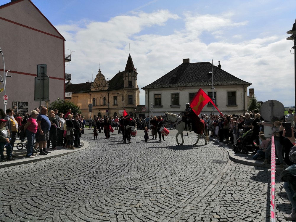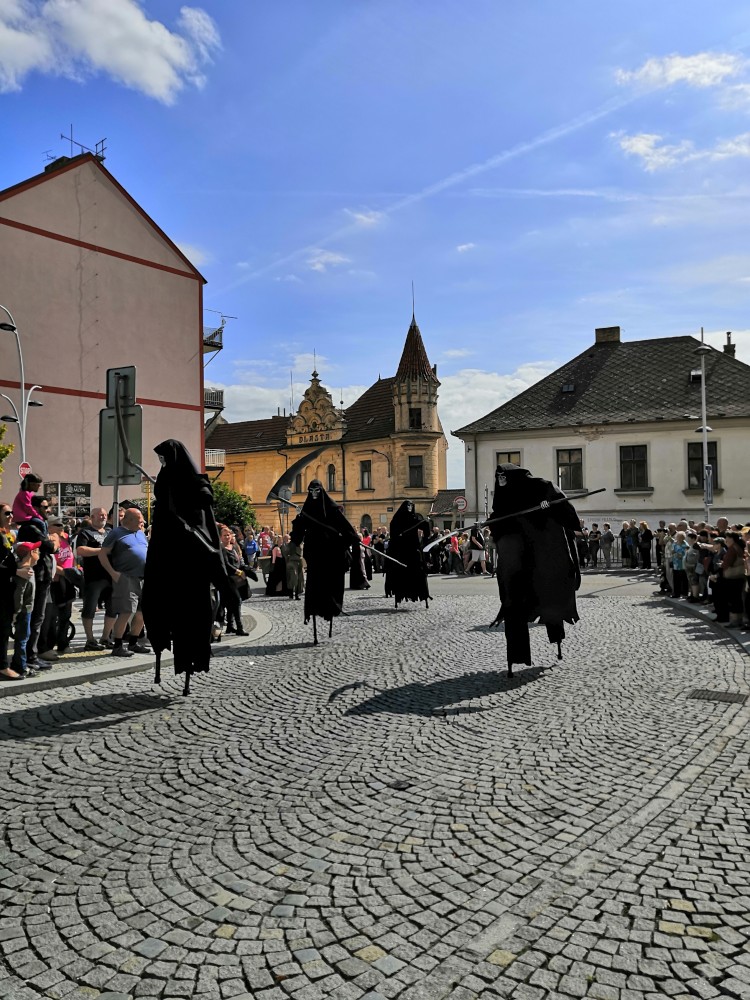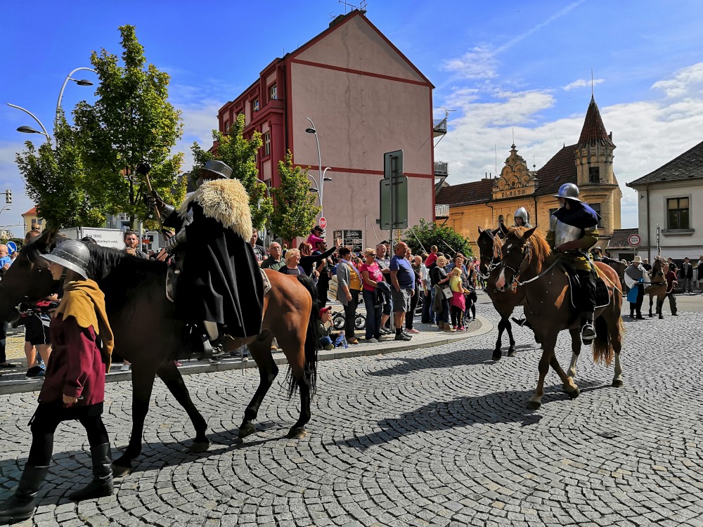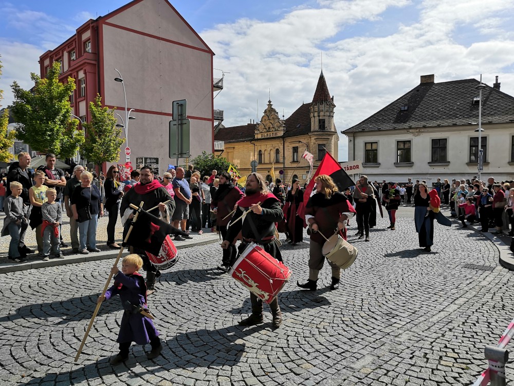 Jdeme se podívat na Táborská setkání. Začínáme kostýmovaným průvodem. Pokračujeme do sadů, kde jsou atrakce pro děti. Potkáváme se s Mášou a jejíma klukama.