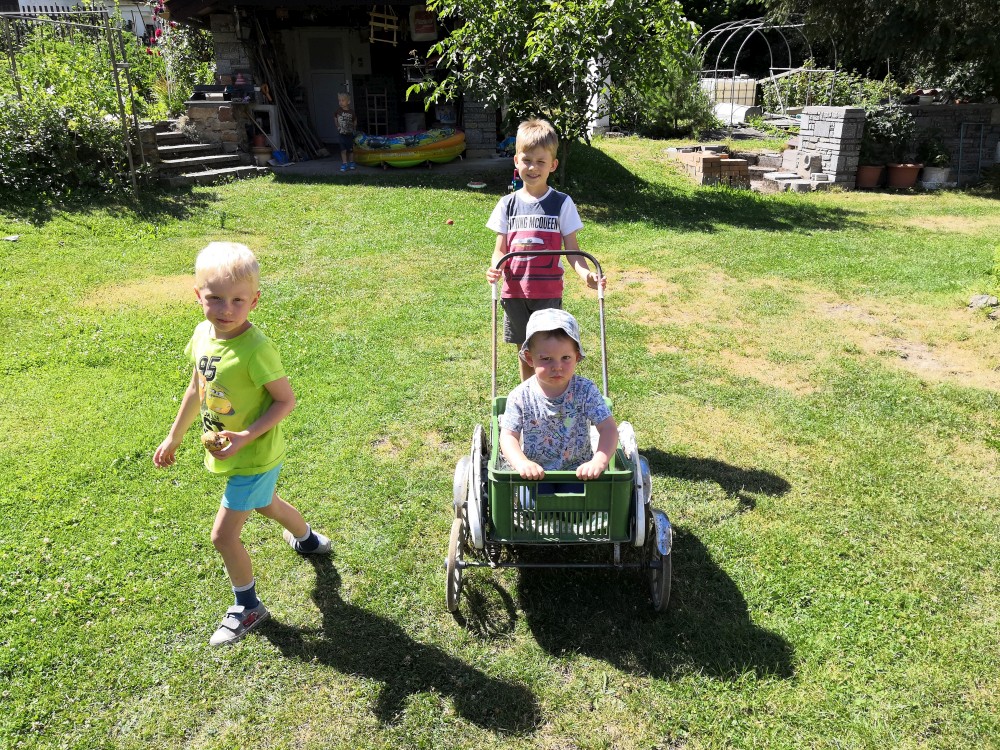 Jedeme navštívit Kultovku do Biliny. Zve nás na oběd. Děti si hrají na zahradě. Pak se jde do lesa na borůvky. Já vyrážím do Tábora. Nechávám Janě auto v Bilině a jdu pěšky - přes Bernartice, Rataje, Dobronice, kemp Papírna, Malšice, Libějice, Větrovy až na Horky. Byla to slušná procházka, cca 30 km.