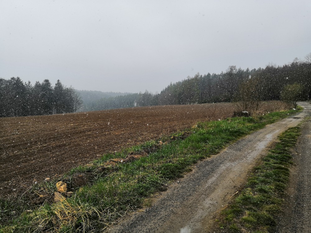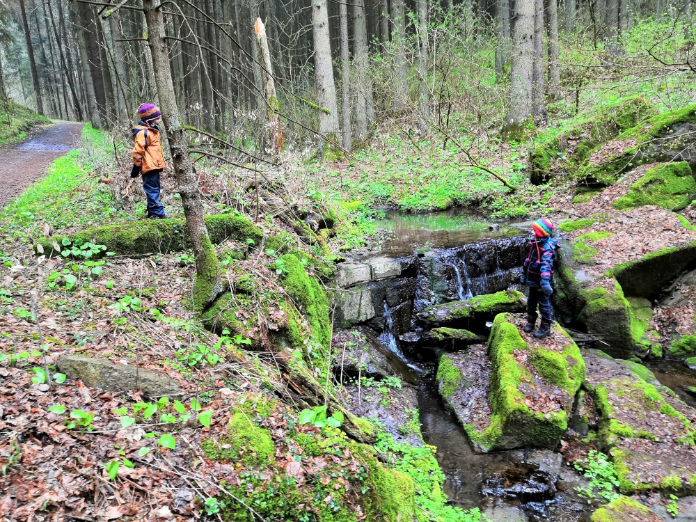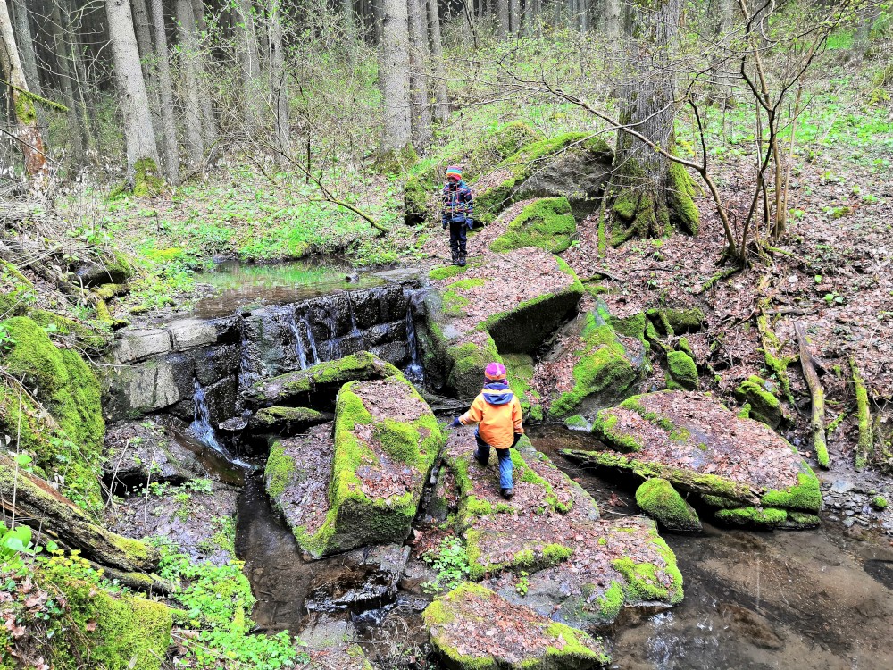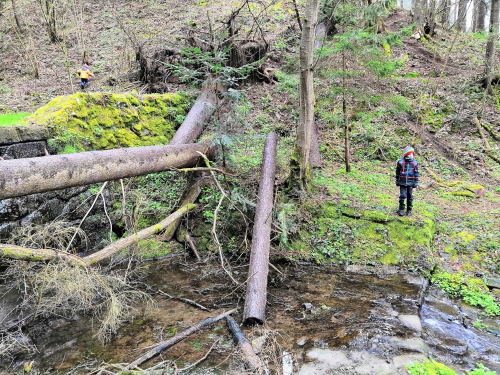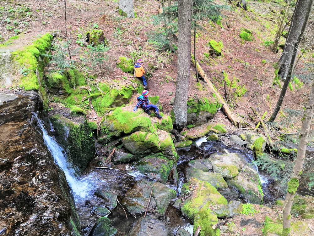 Vyrážím s Víťou a Jiříkem na výpravu na Harrachovku. Je pěkná zima, je polovina dubna a zima se zmohla na letos poslední sněžení. Jdeme vlčím dolem. Kluci objevují terénky na druhé straně potoka.