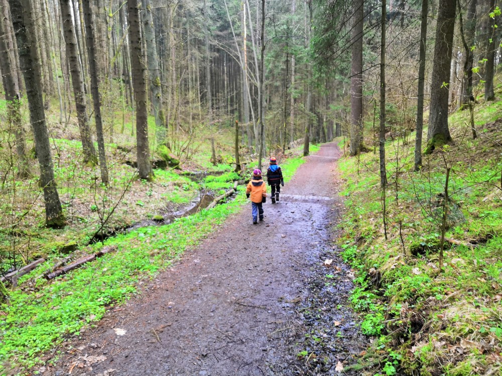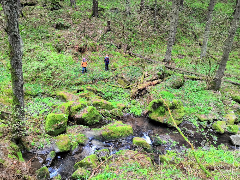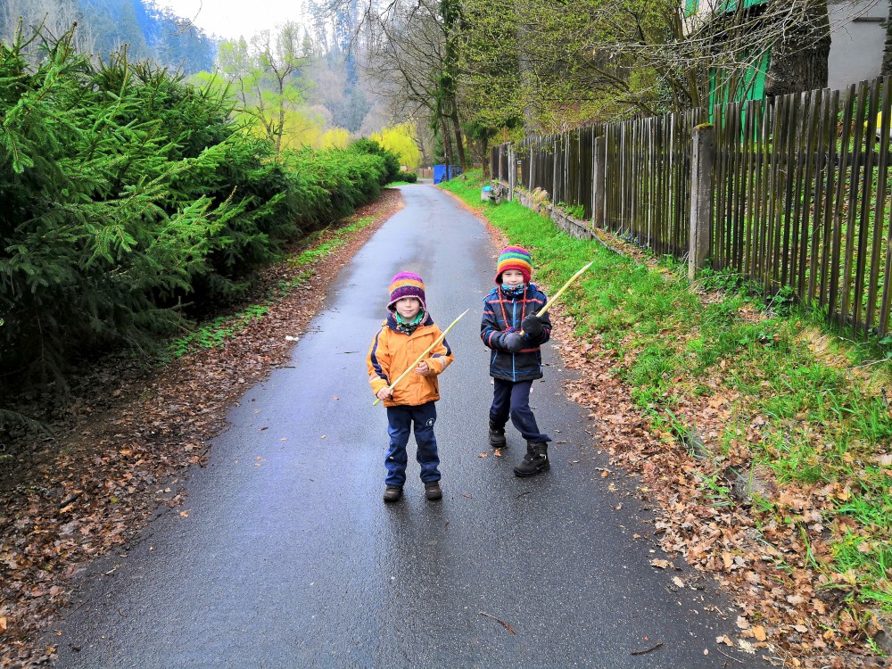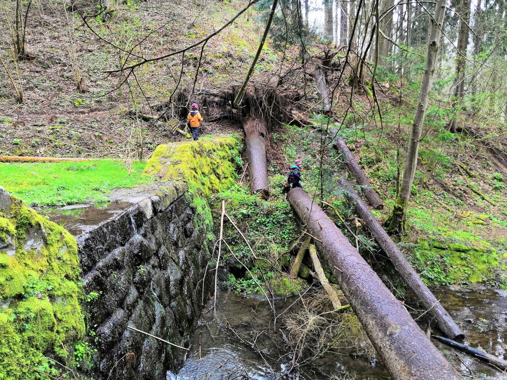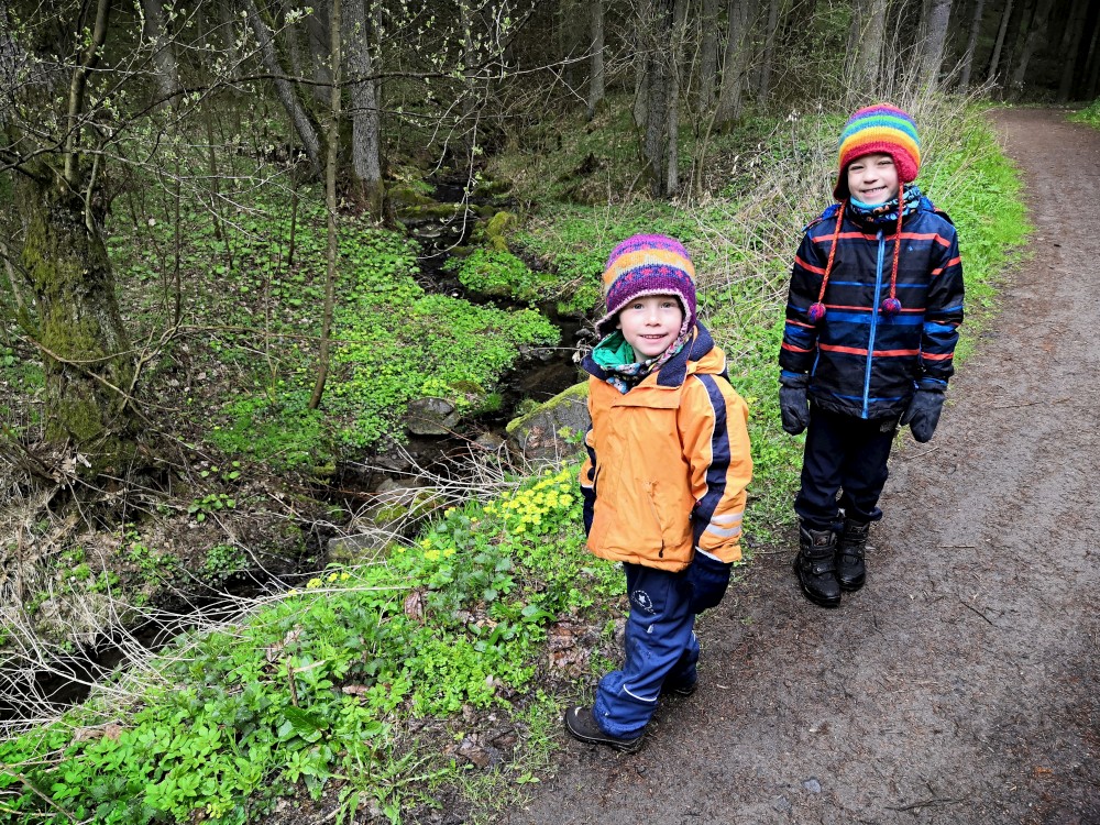 Vyrážím s Víťou a Jiříkem na výpravu na Harrachovku. Je pěkná zima, je polovina dubna a zima se zmohla na letos poslední sněžení. Jdeme vlčím dolem. Kluci objevují terénky na druhé straně potoka.
